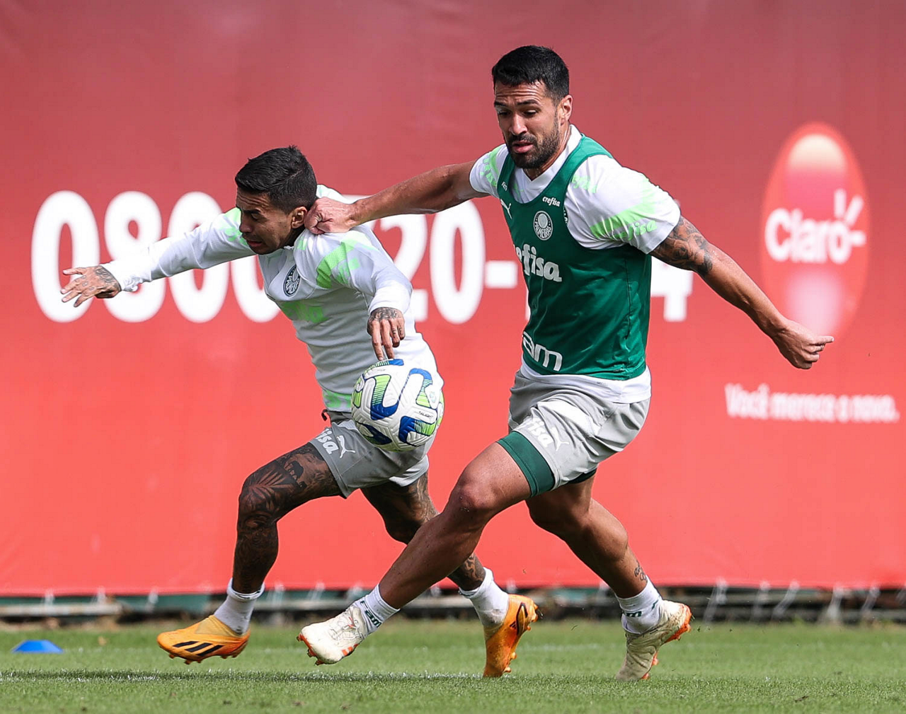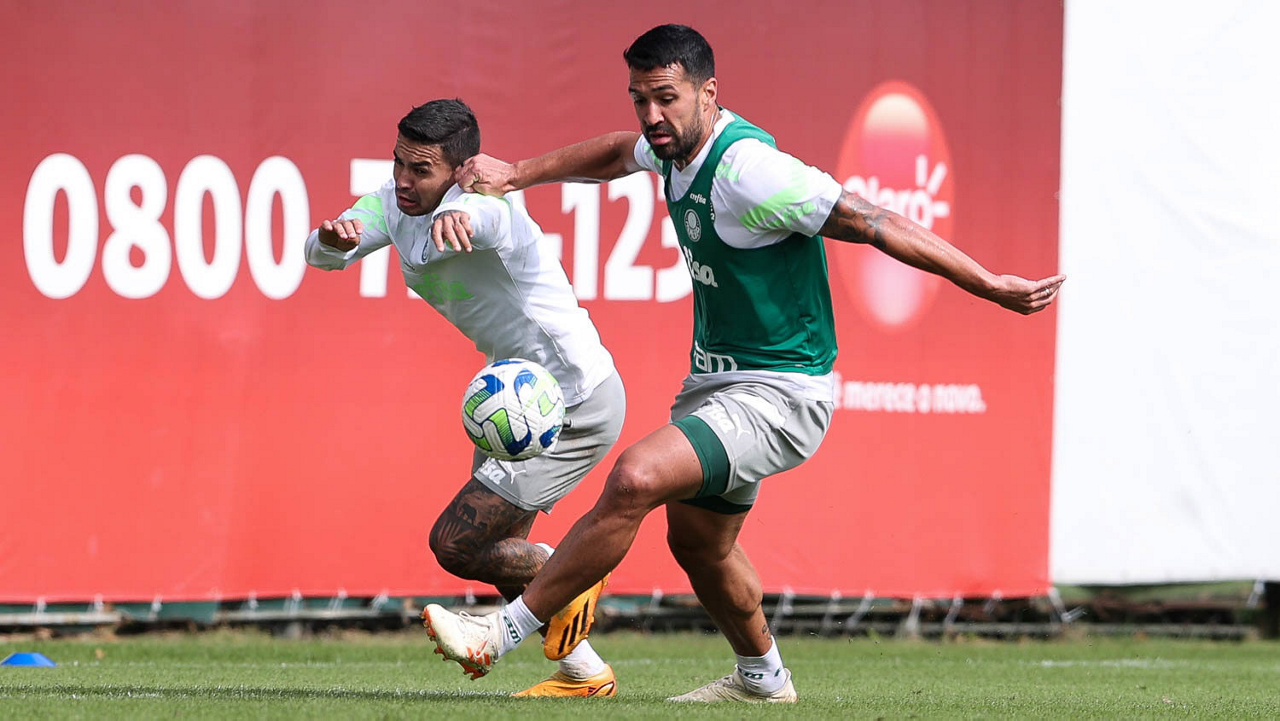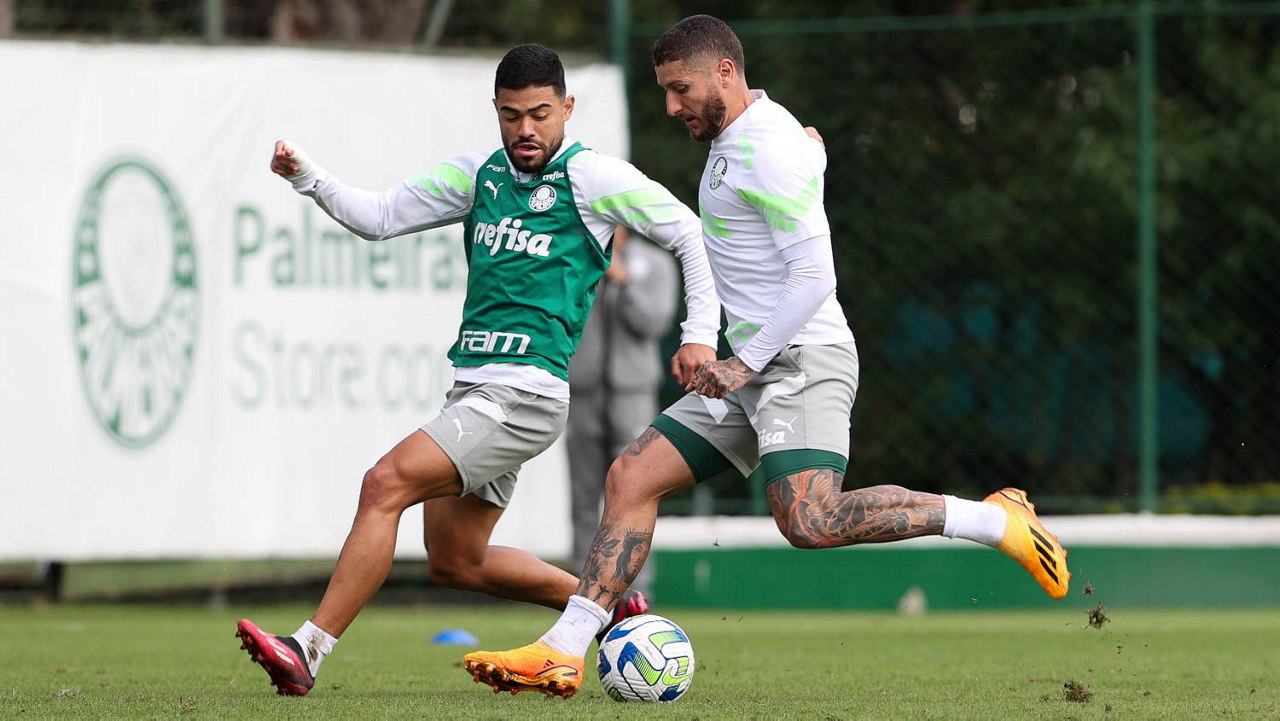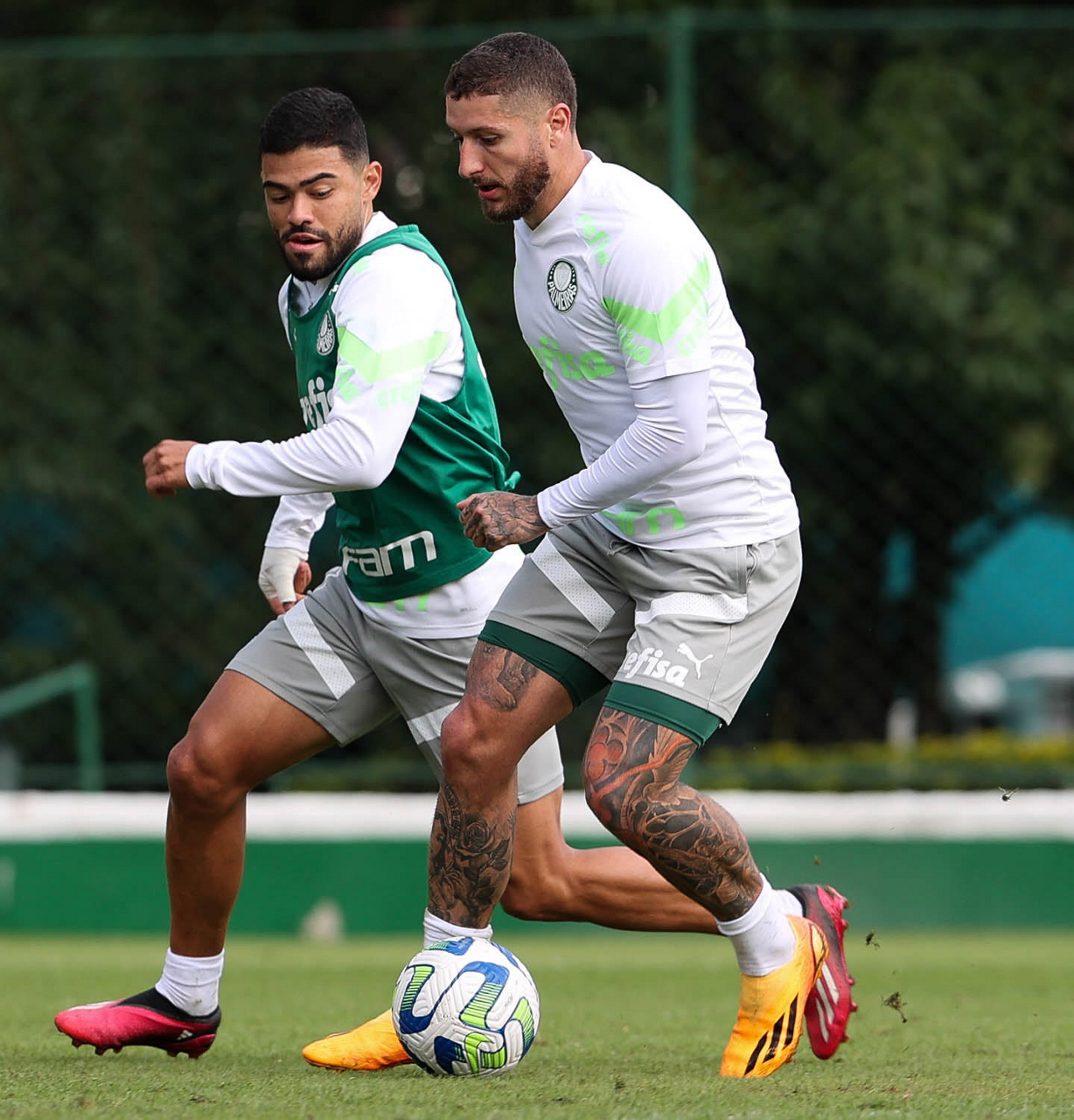 Os jogadores Bruno Tabata e Zé Rafael (D), da SE Palmeiras, durante treinamento, na Academia de Futebol. (Foto: Cesar Greco/Palmeiras/by Canon)