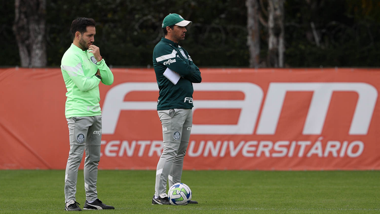 O técnico Abel Ferreira e o analista de desempenho Tiago Costa (E), da SE Palmeiras, durante treinamento, na Academia de Futebol. (Foto: Cesar Greco/Palmeiras/by Canon)