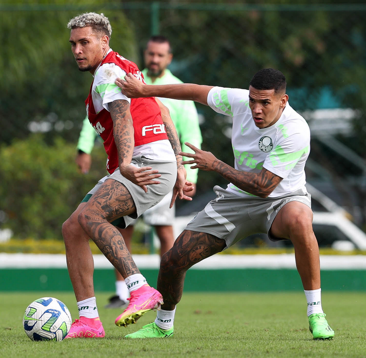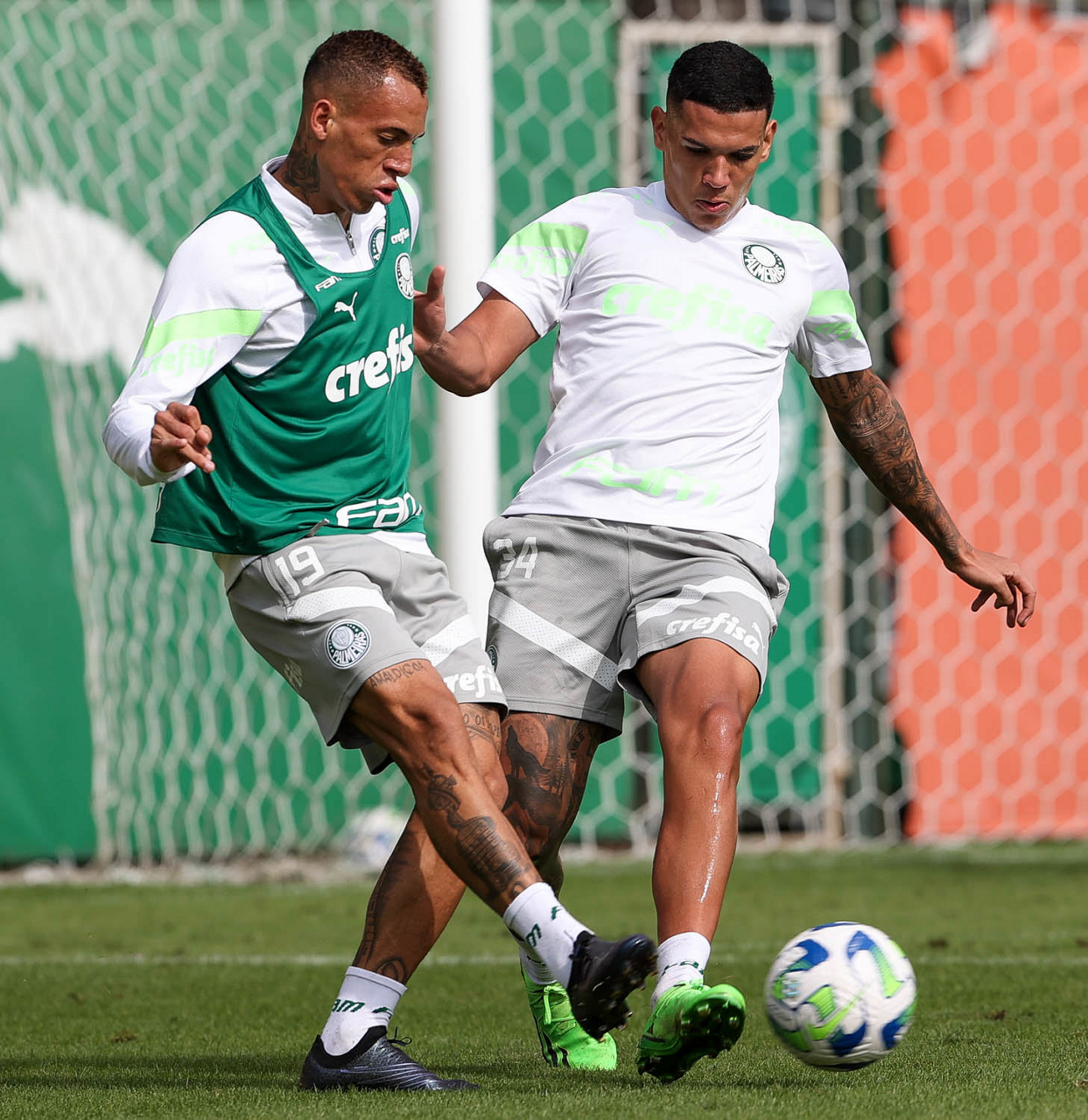 Os jogadores Fabinho e Flaco López (D), da SE Palmeiras, durante treinamento, na Academia de Futebol. (Foto: Cesar Greco/Palmeiras/by Canon)