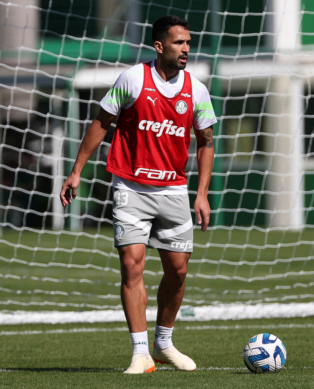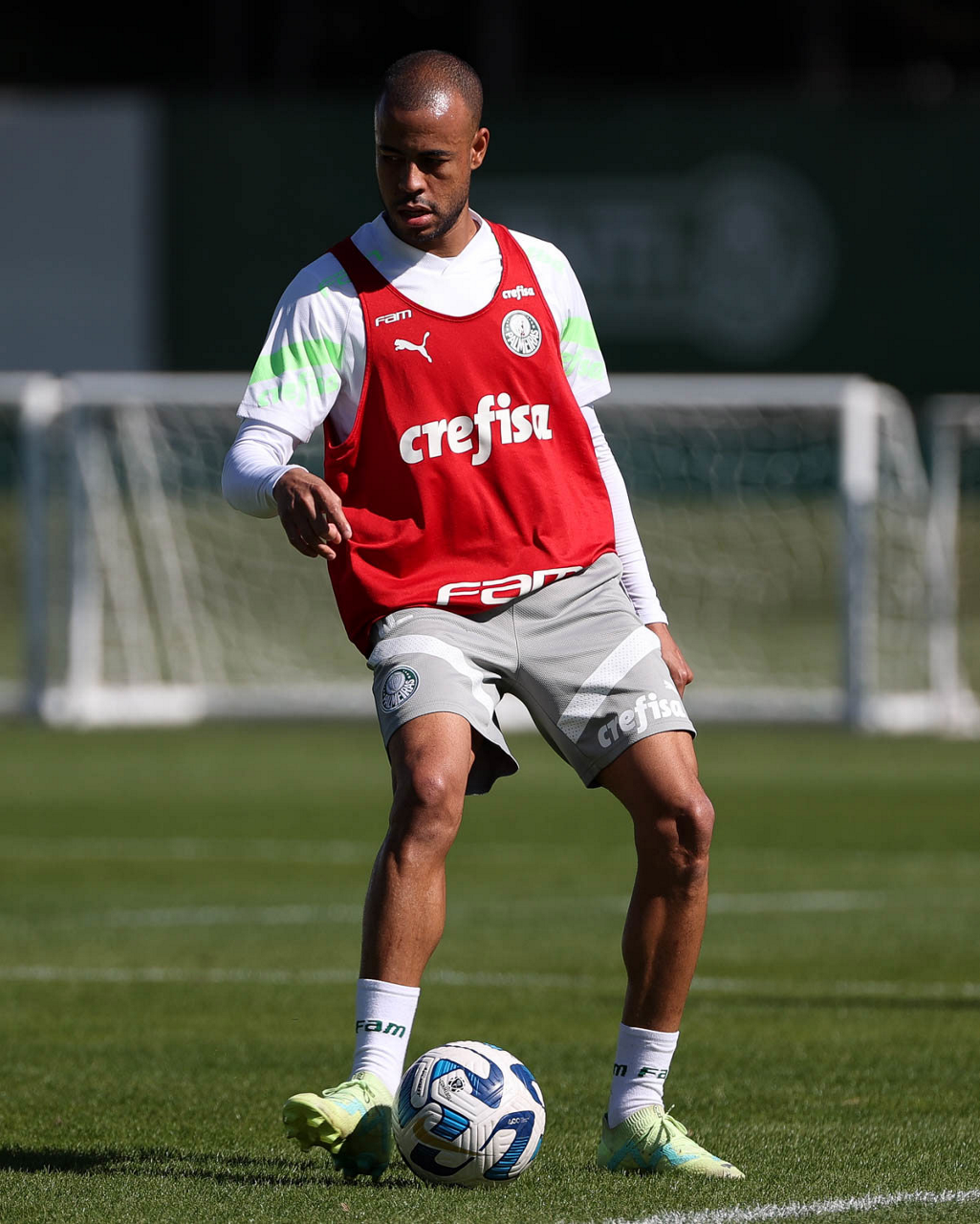 O goleiro Marcelo Lomba e os jogadores Murilo, Richard Ríos, Garcia, Luan, Fabinho e Naves (E/D em pé) e Gabriel Menino, Mayke, Vanderlan, Joaquín Piquerez e Gustavo Gómez (E/D agachados), da SE Palmeiras, durante treinamento, na Academia de Futebol. (Foto: Cesar Greco/Palmeiras/by Canon)