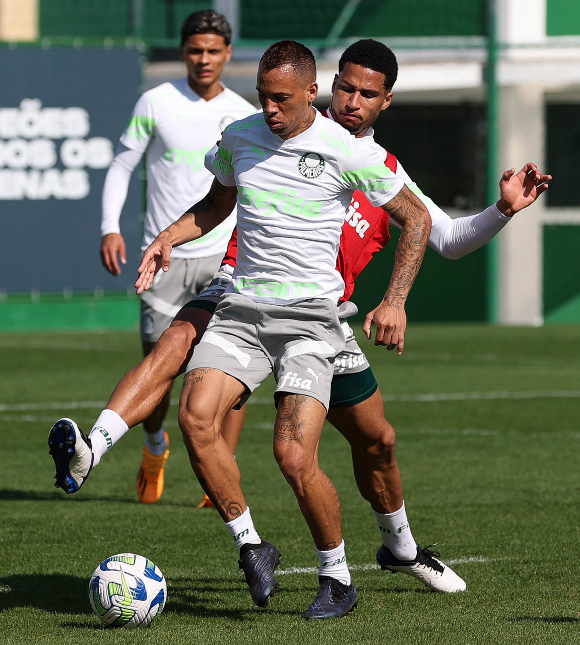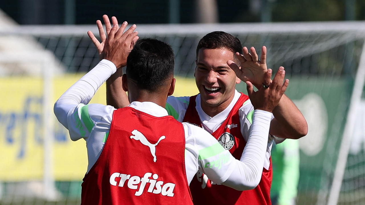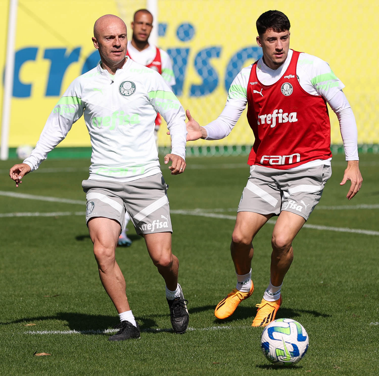 Os jogadores Marcos Rocha, Joaquín Piquerez, Gustavo Gómez, Fabinho, Murilo, Luan, Garcia e Naves (E/D em pé) e Marcelo Lomba, Gabriel Menino, Mayke e Vanderlan (E/D agachados), da SE Palmeiras, durante treinamento, na Academia de Futebol. (Foto: Cesar Greco/Palmeiras/by Canon)