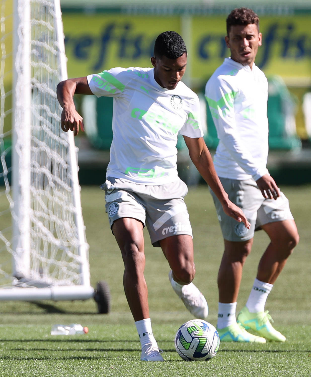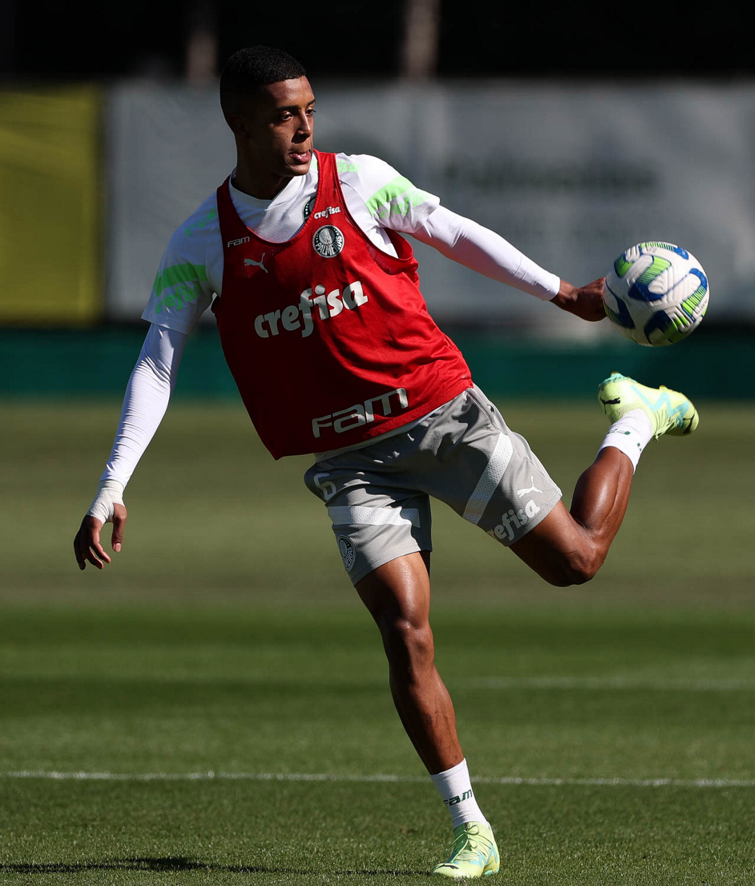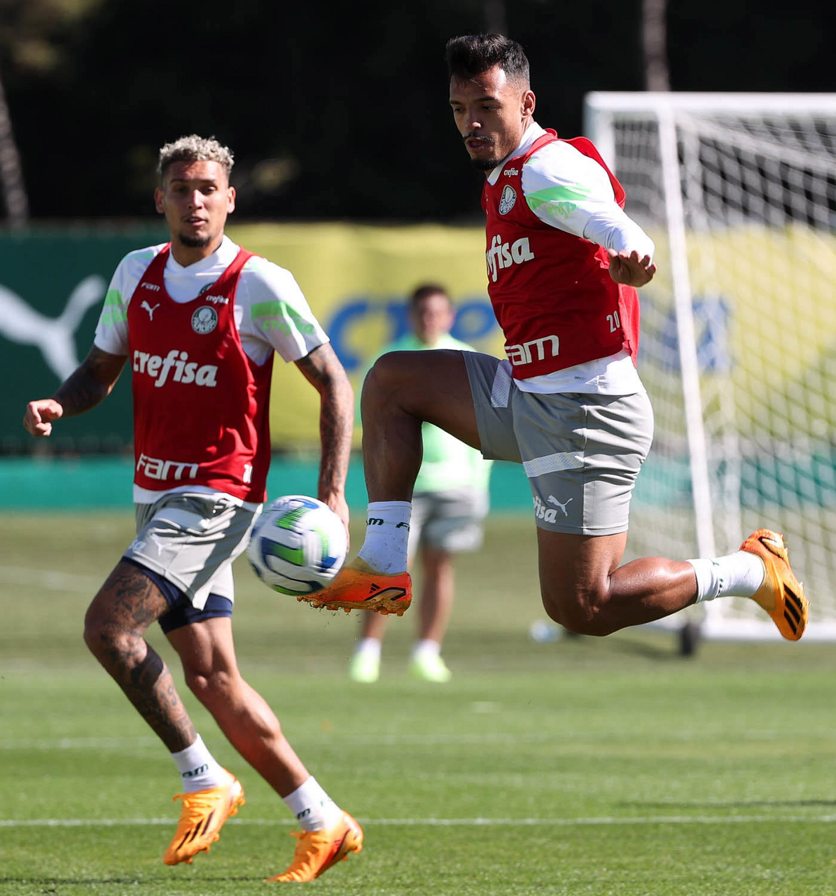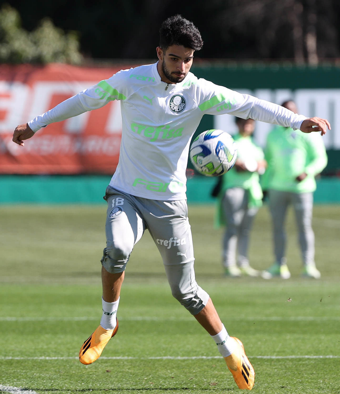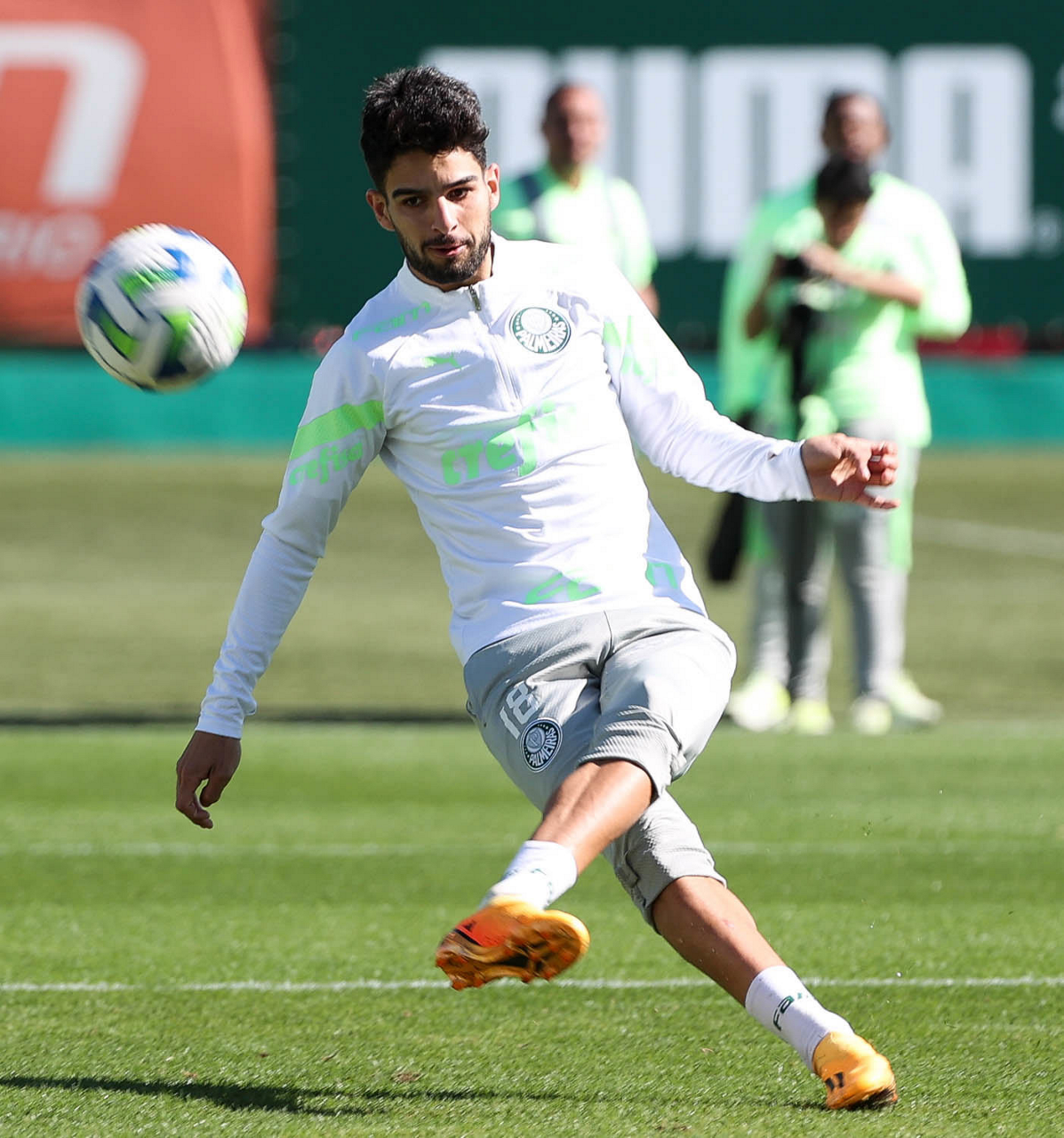 Os jogadores Naves, Garcia, Luan, Fabinho, Joaquín Piquerez, Marcos Rocha e Murilo (E/D em pé) e Vanderlan, Mayke, Gabriel Menino, Gustavo Gómez e Marcelo Lomba (E/D agachados), da SE Palmeiras, durante treinamento, na Academia de Futebol. (Foto: Cesar Greco/Palmeiras/by Canon)