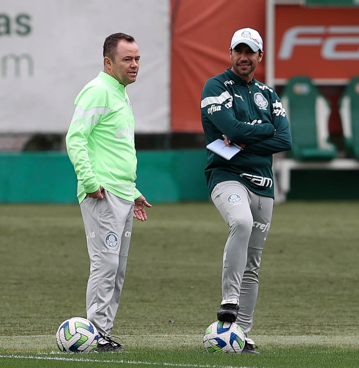 O técnico Abel Ferreira e o auxiliar técnico Andrey Lopes (E), da SE Palmeiras, durante treinamento, na Academia de Futebol. (Foto: Cesar Greco/Palmeiras/by Canon)
