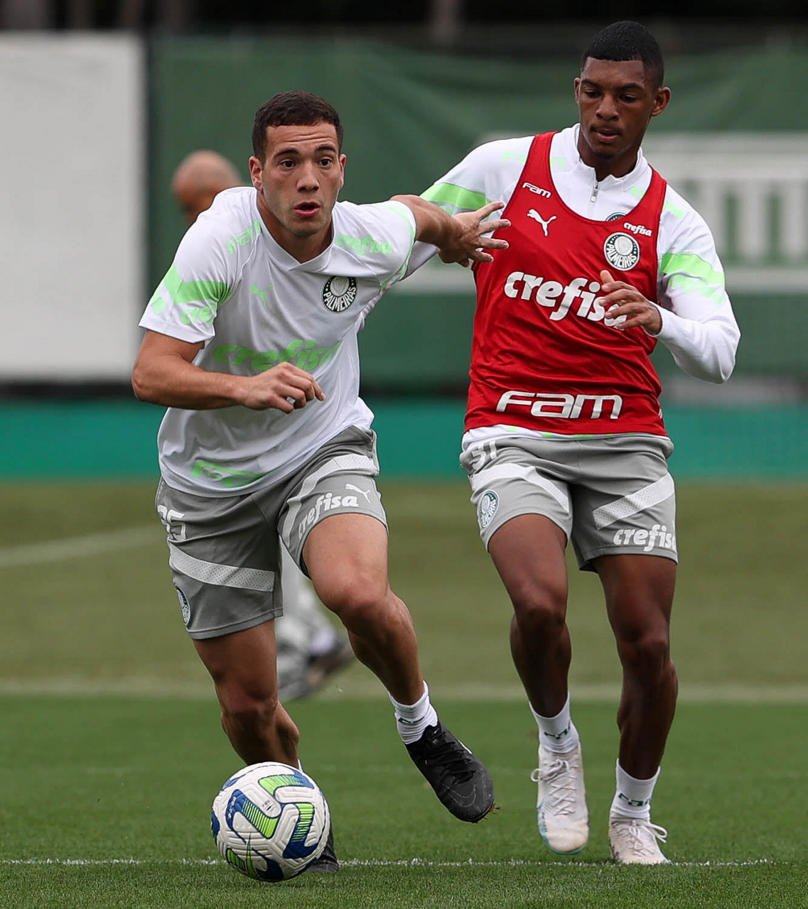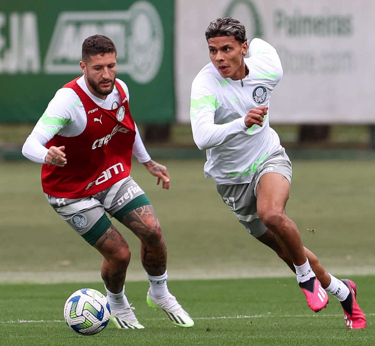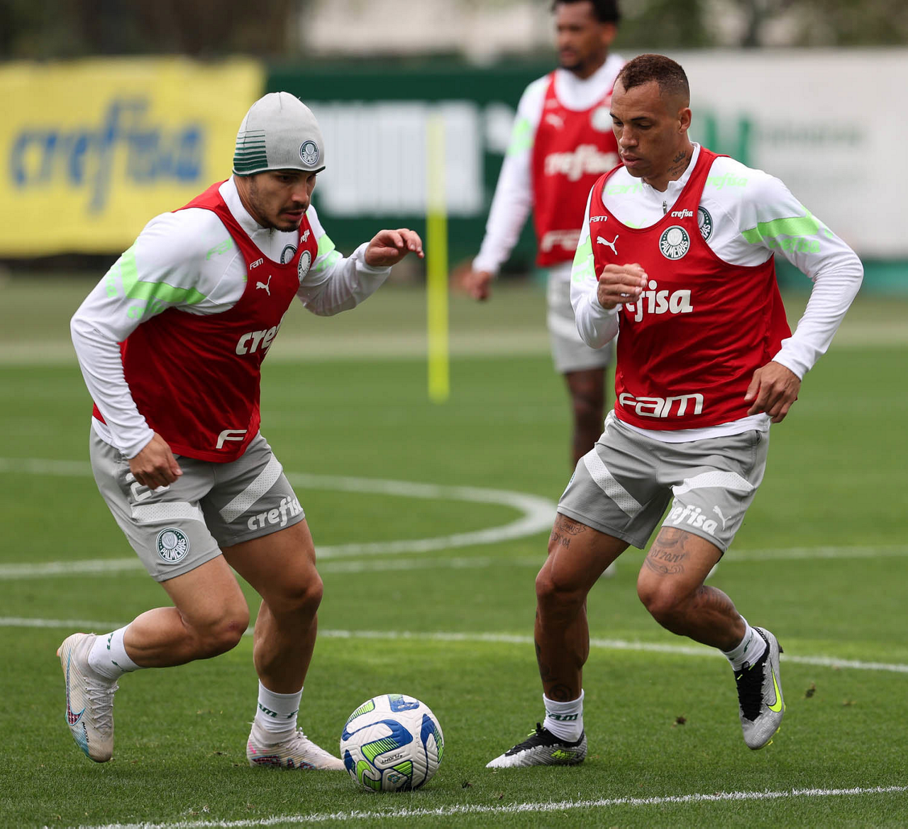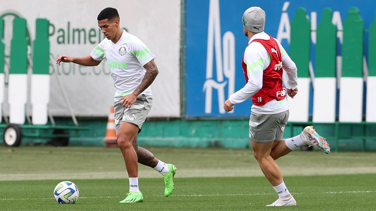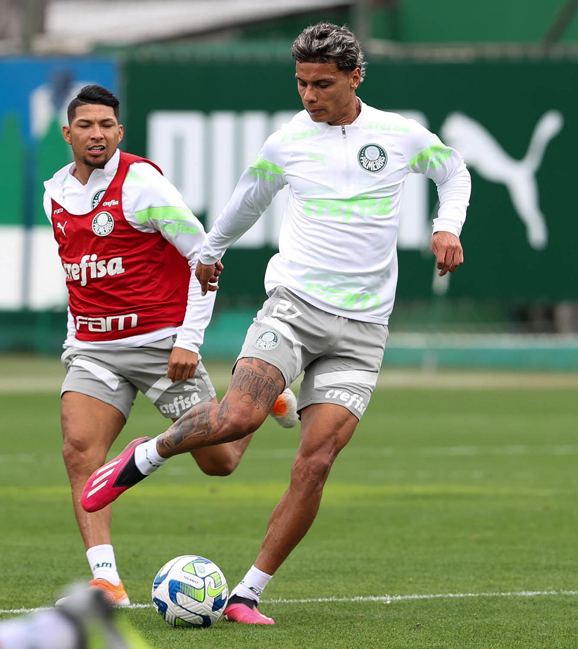 Os jogadores Rony e Richard Ríos (D), da SE Palmeiras, durante treinamento, na Academia de Futebol. (Foto: Cesar Greco/Palmeiras/by Canon)