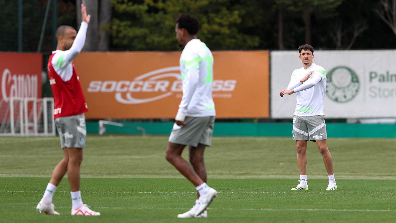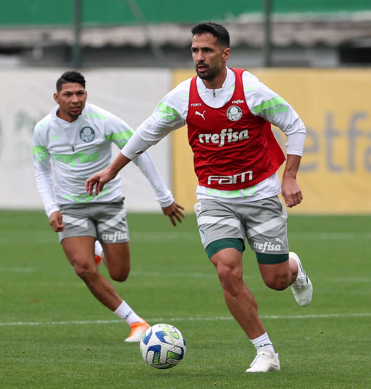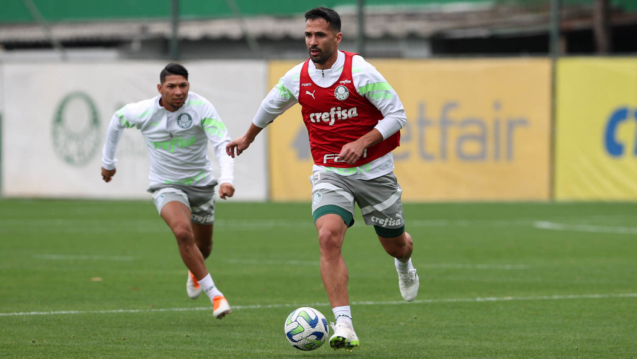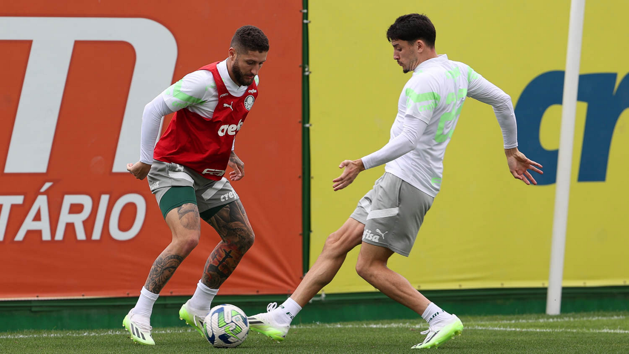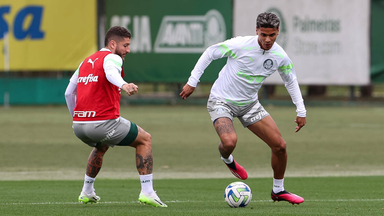 Os jogadores Rony e Richard Ríos (D), da SE Palmeiras, durante treinamento, na Academia de Futebol. (Foto: Cesar Greco/Palmeiras/by Canon)