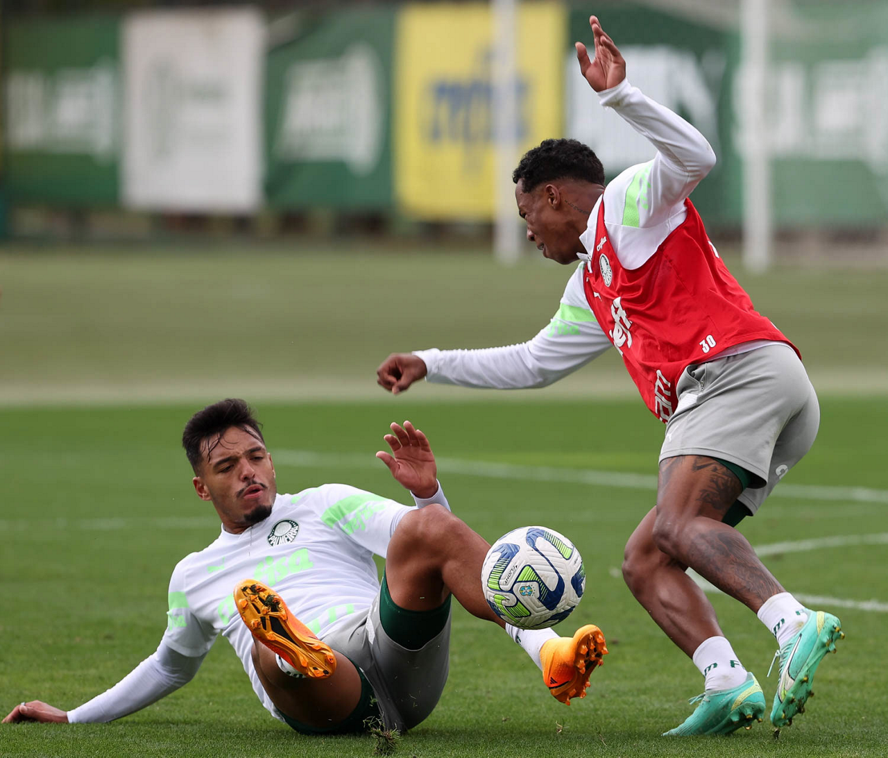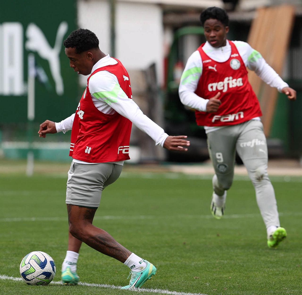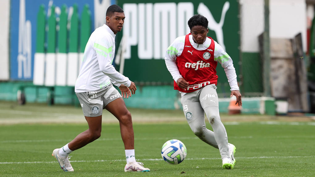 Os jogadores Luis Guilherme e Endrick (D), da SE Palmeiras, durante treinamento, na Academia de Futebol. (Foto: Cesar Greco/Palmeiras/by Canon)