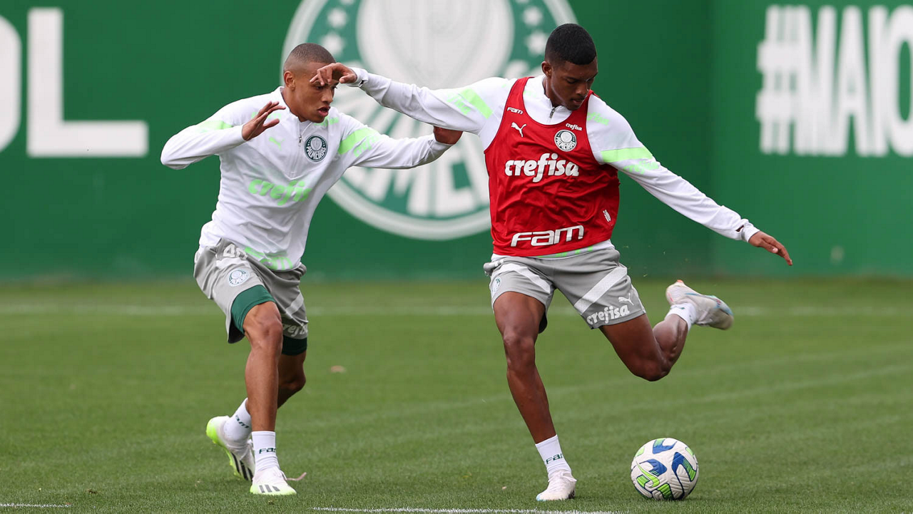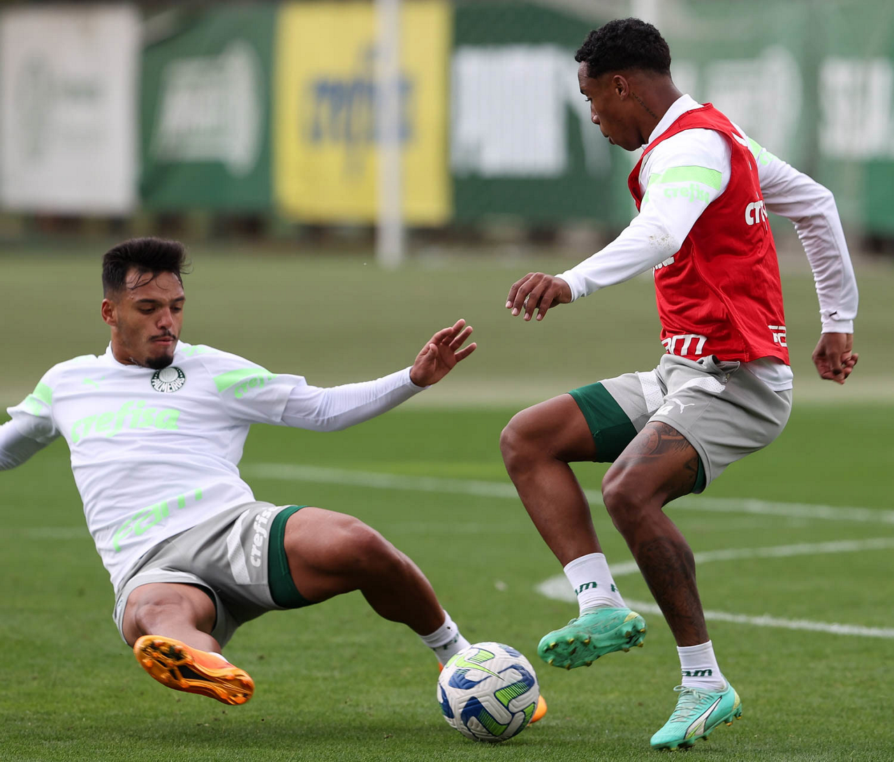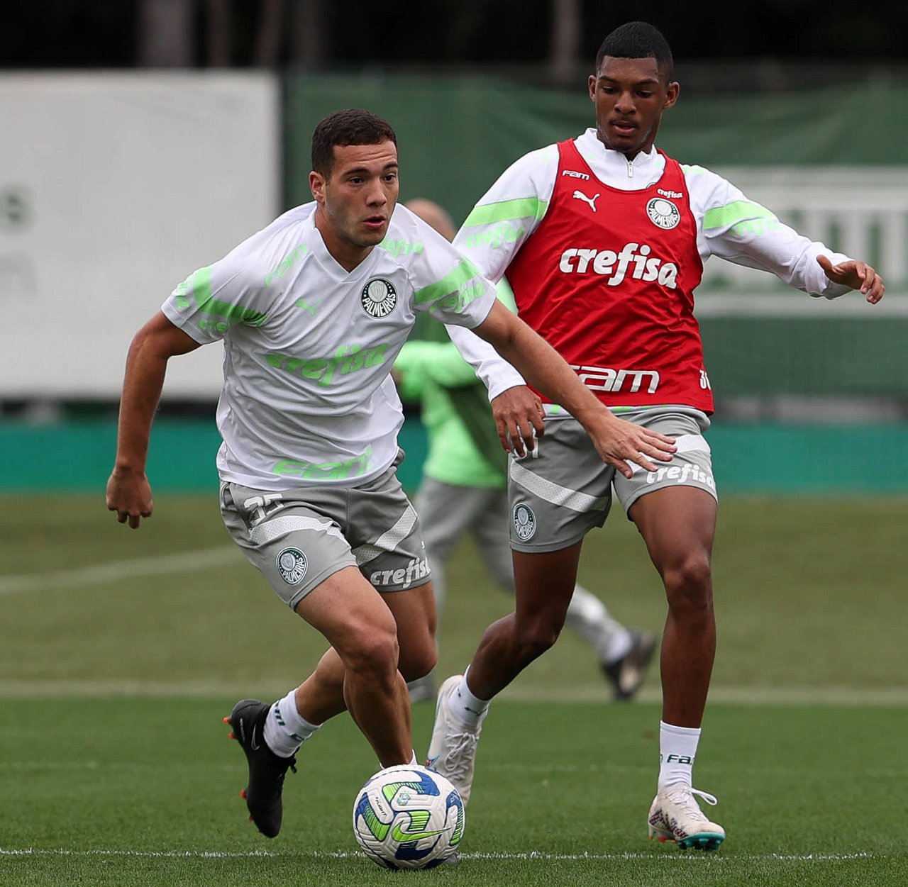 Os jogadores Luis Guilherme e Endrick (D), da SE Palmeiras, durante treinamento, na Academia de Futebol. (Foto: Cesar Greco/Palmeiras/by Canon)