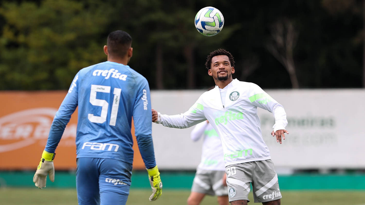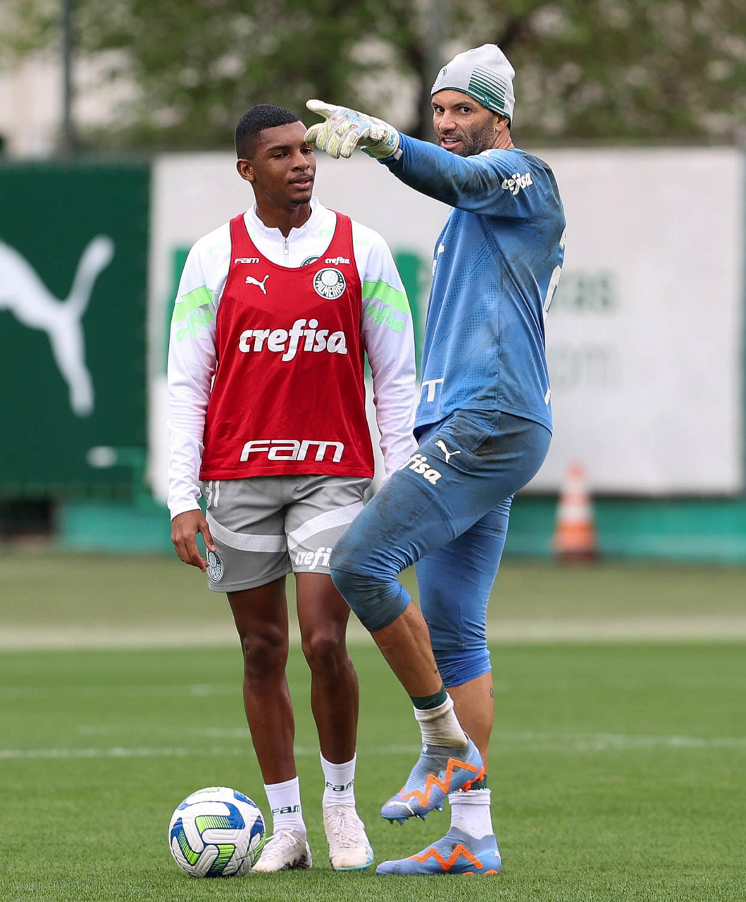 O jogador Luis Guilherme e o goleiro Weverton (D), da SE Palmeiras, durante treinamento, na Academia de Futebol. (Foto: Cesar Greco/Palmeiras/by Canon)