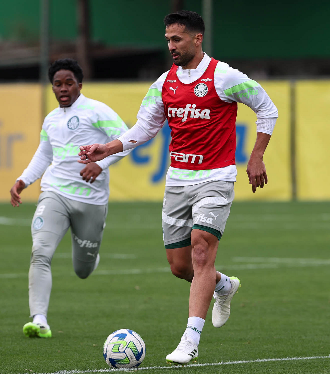 Os jogadores Zé Rafael e Richard Ríos (D), da SE Palmeiras, durante treinamento, na Academia de Futebol. (Foto: Cesar Greco/Palmeiras/by Canon)