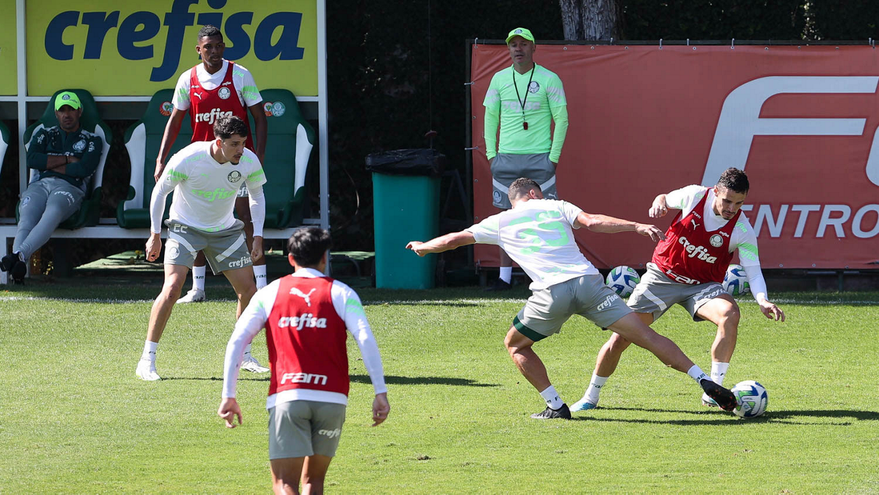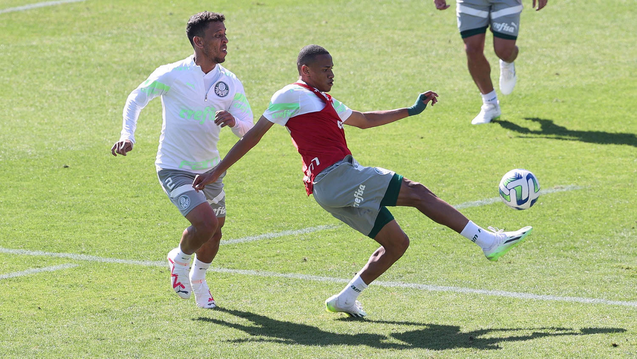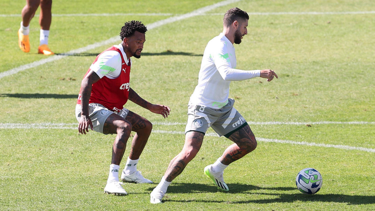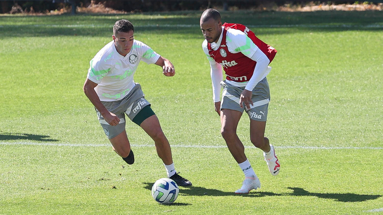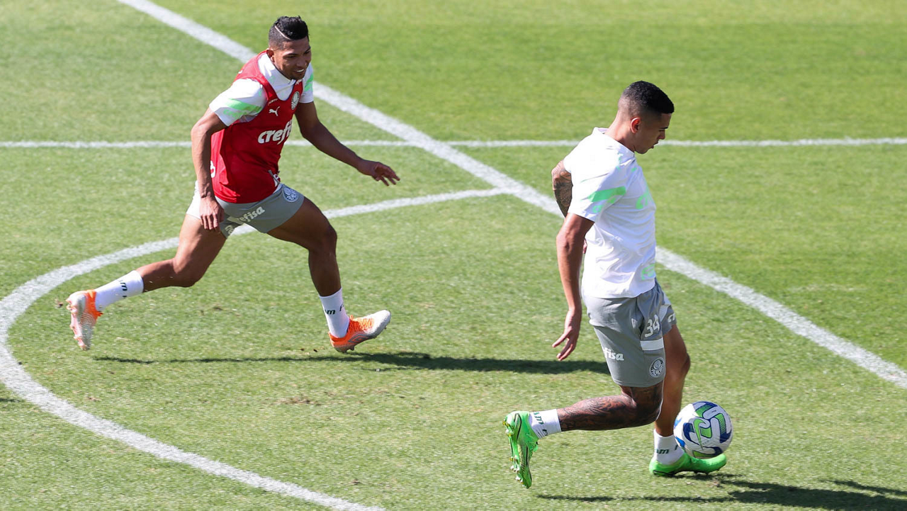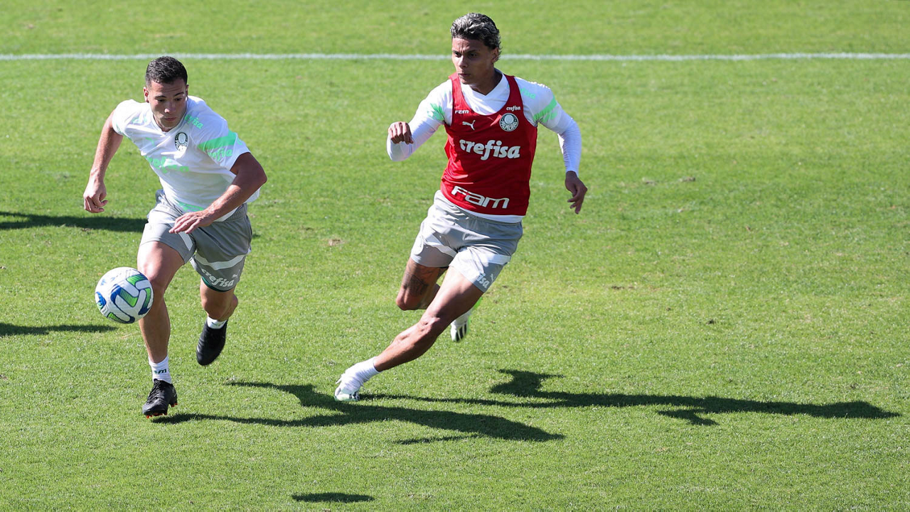 Os jogadores Fabinho e Richard Ríos (D), da SE Palmeiras, durante treinamento, na Academia de Futebol. (Foto: Cesar Greco/Palmeiras/by Canon)