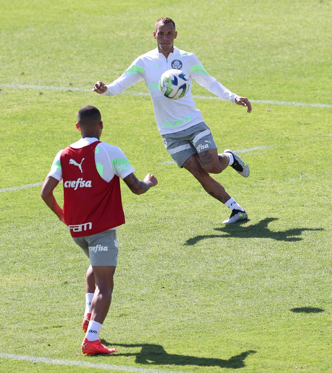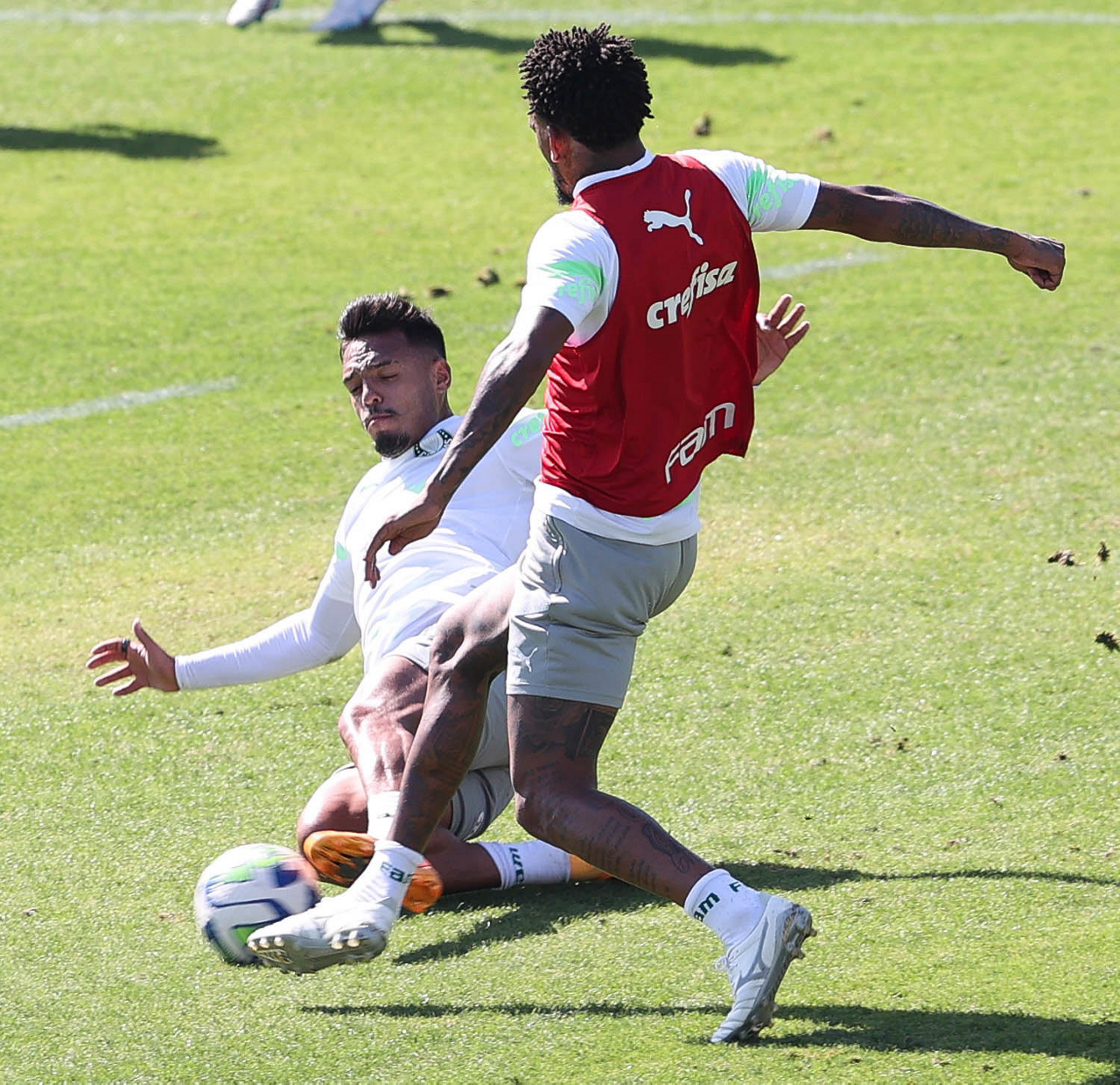 Os jogadores Fabinho e Raphael Veiga (D), da SE Palmeiras, durante treinamento, na Academia de Futebol. (Foto: Cesar Greco/Palmeiras/by Canon)