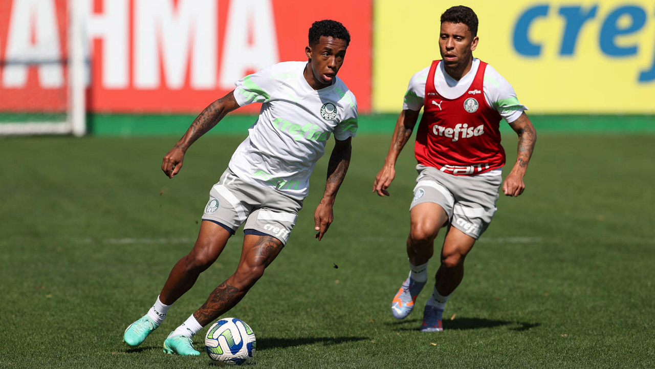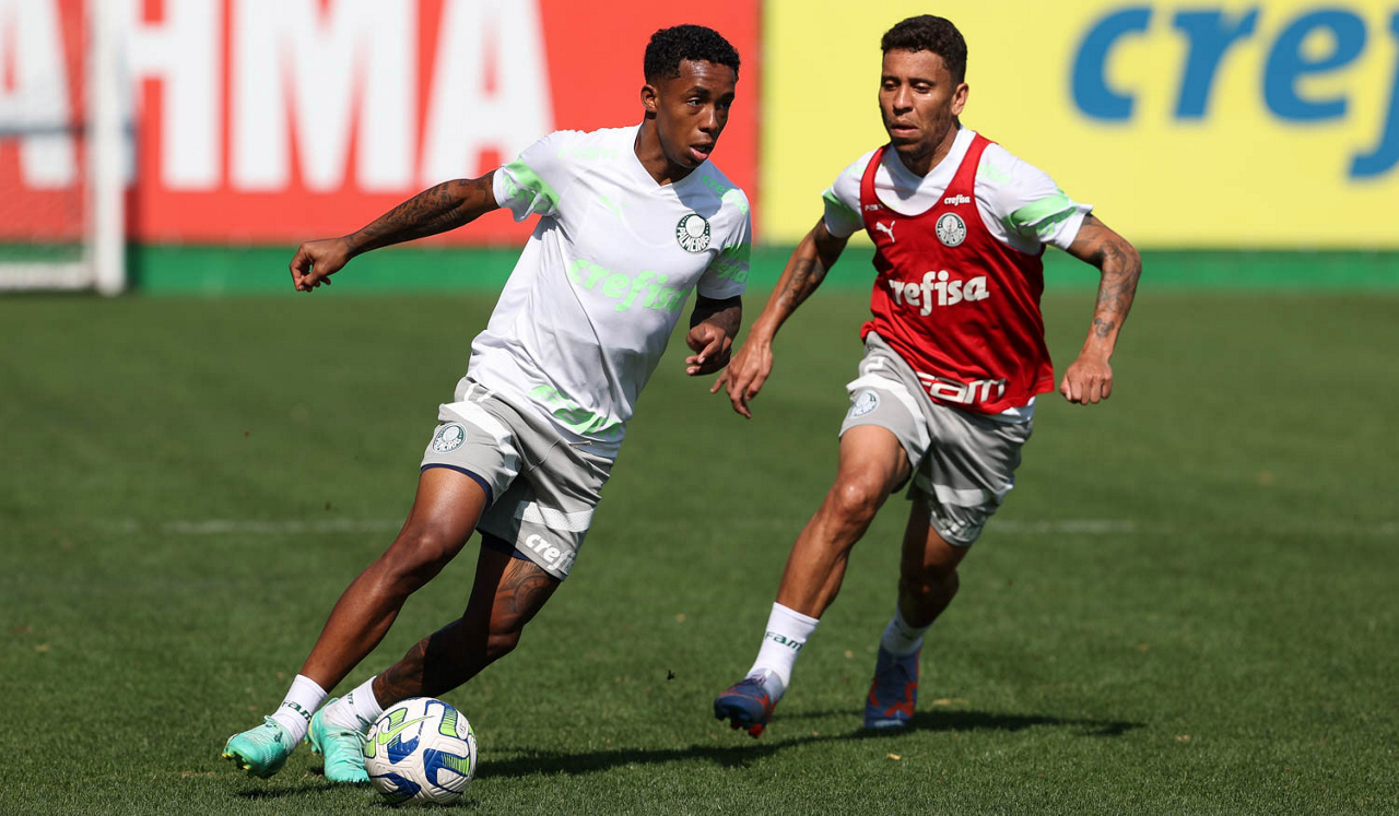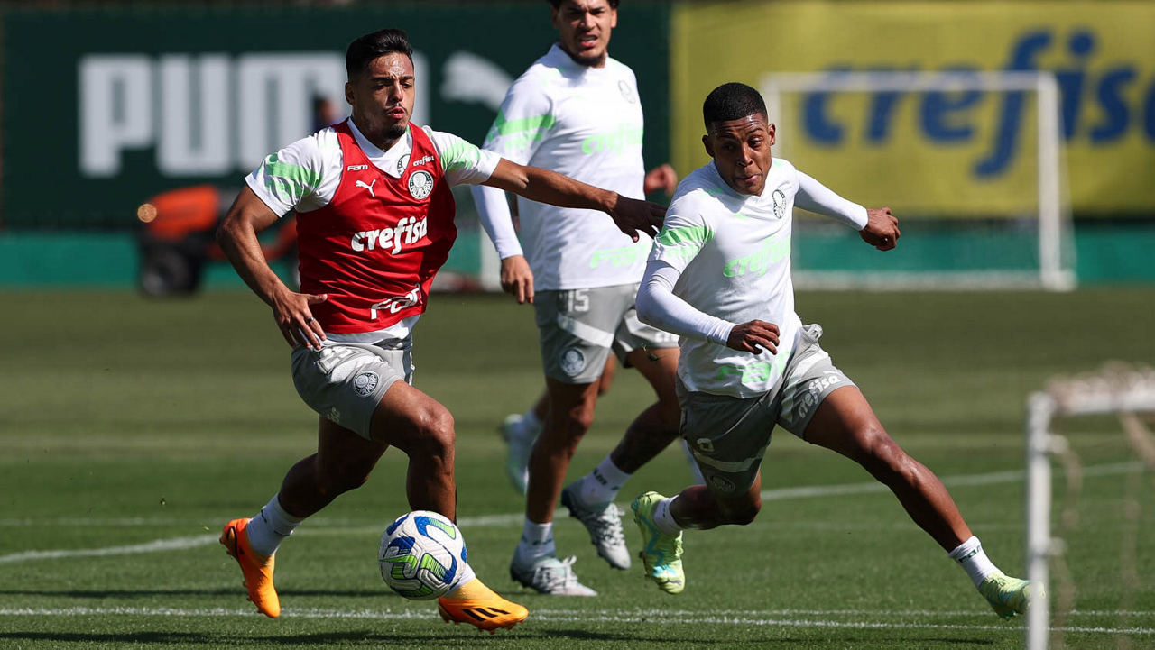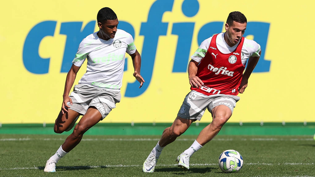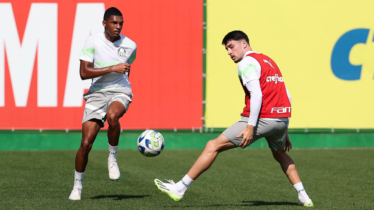 Os jogadores Richard Ríos e Endrick (D), da SE Palmeiras, durante treinamento, na Academia de Futebol. (Foto: Cesar Greco/Palmeiras/by Canon)