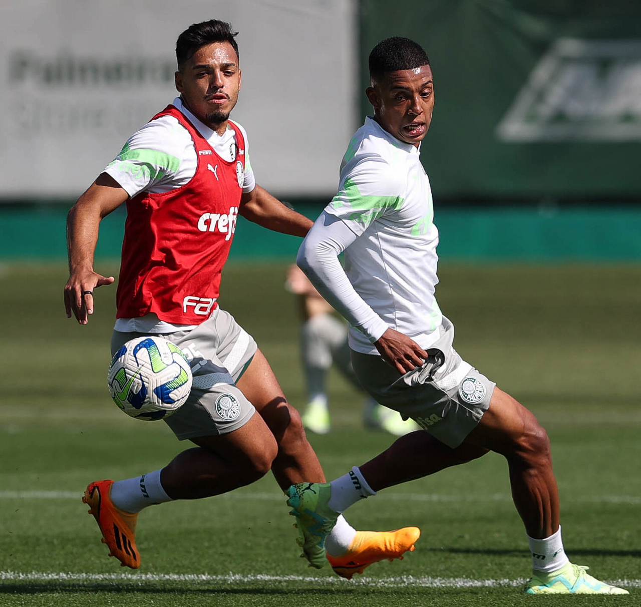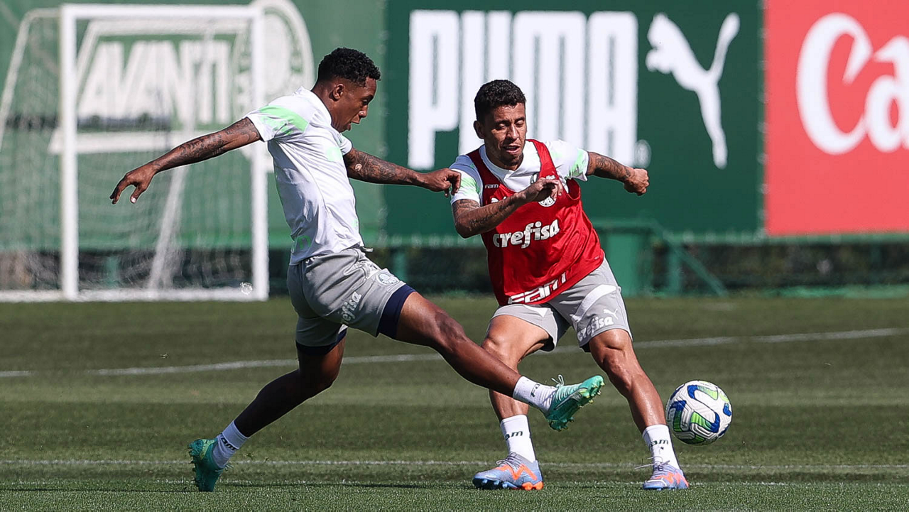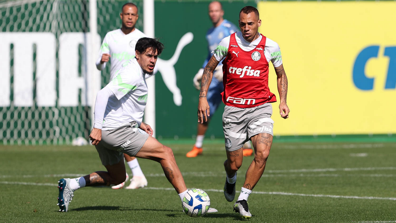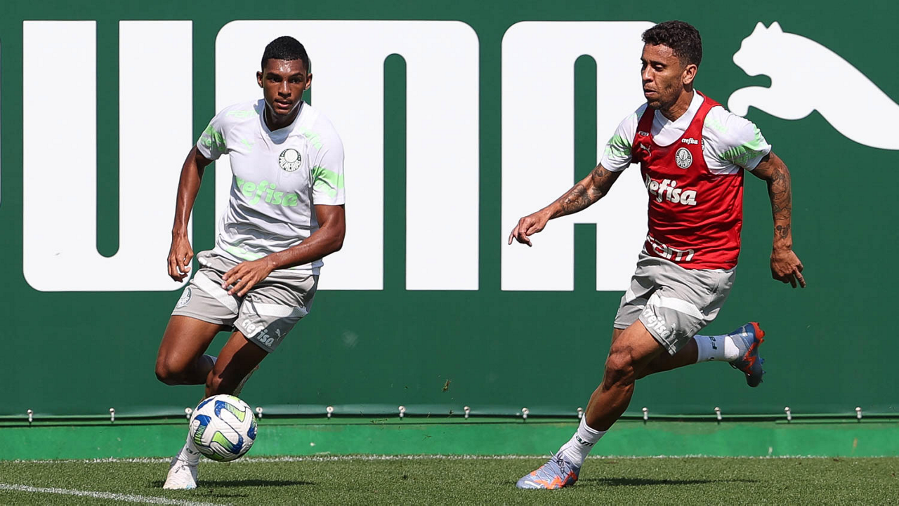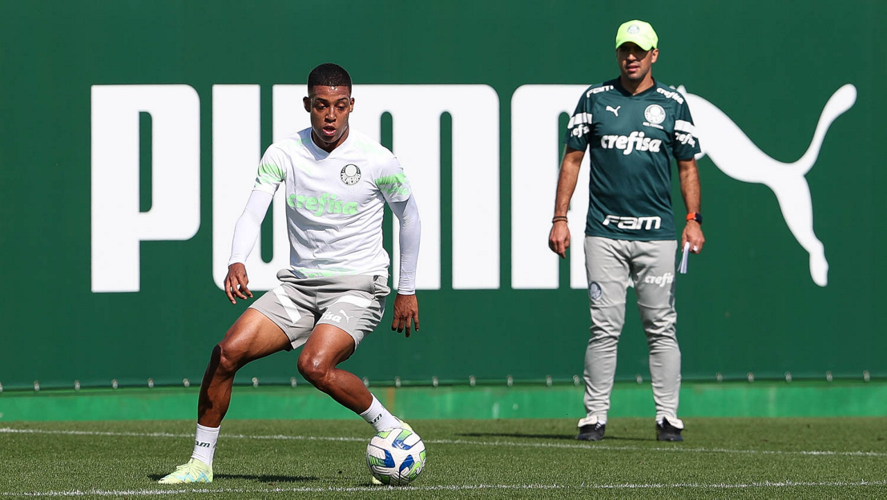 Os jogadores Richard Ríos e Endrick (D), da SE Palmeiras, durante treinamento, na Academia de Futebol. (Foto: Cesar Greco/Palmeiras/by Canon)
