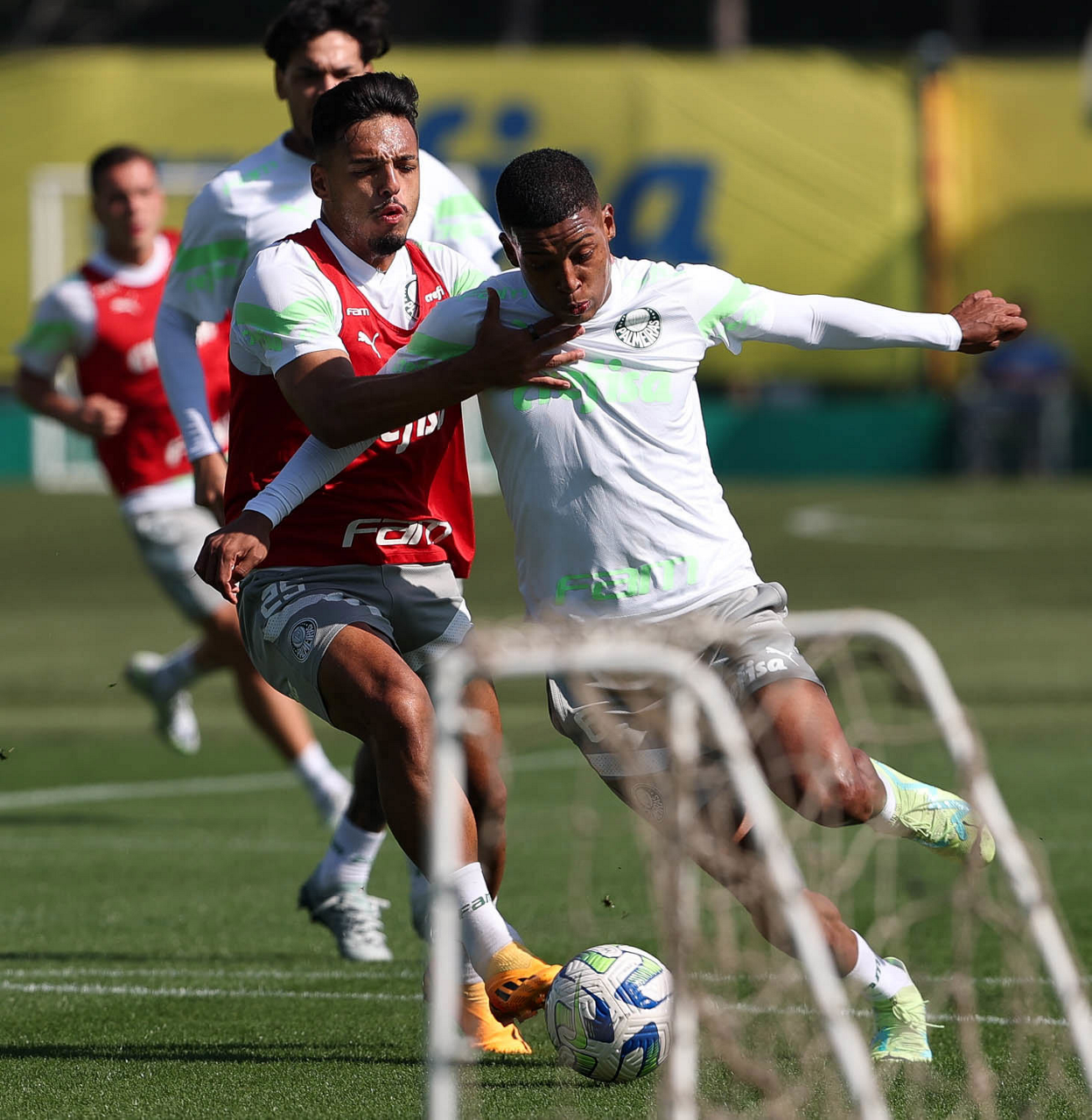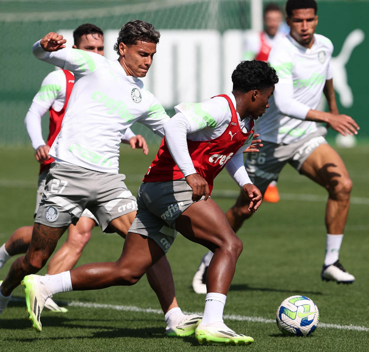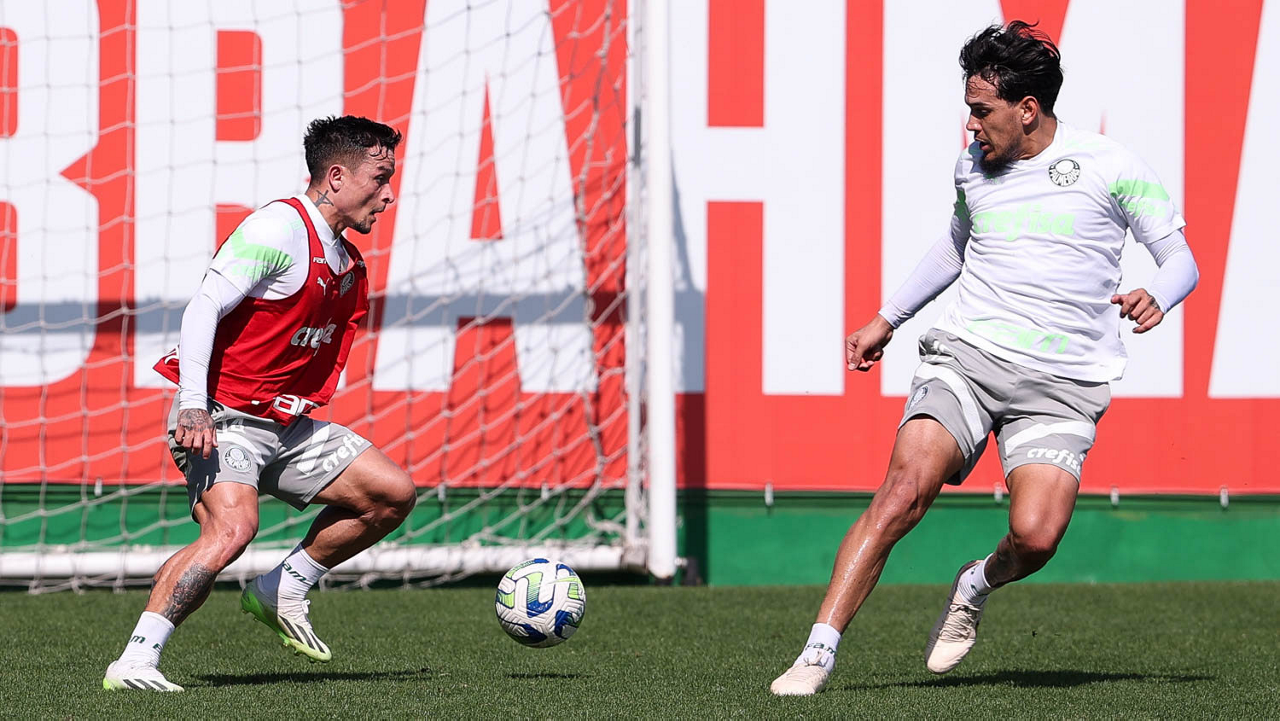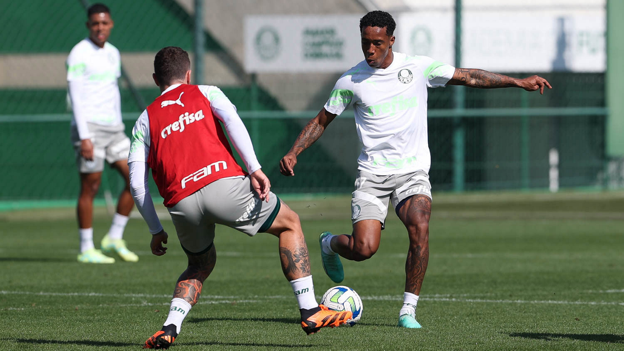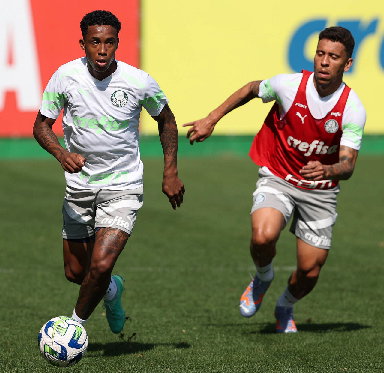 Os jogadores Richard Ríos e Endrick (D), da SE Palmeiras, durante treinamento, na Academia de Futebol. (Foto: Cesar Greco/Palmeiras/by Canon)