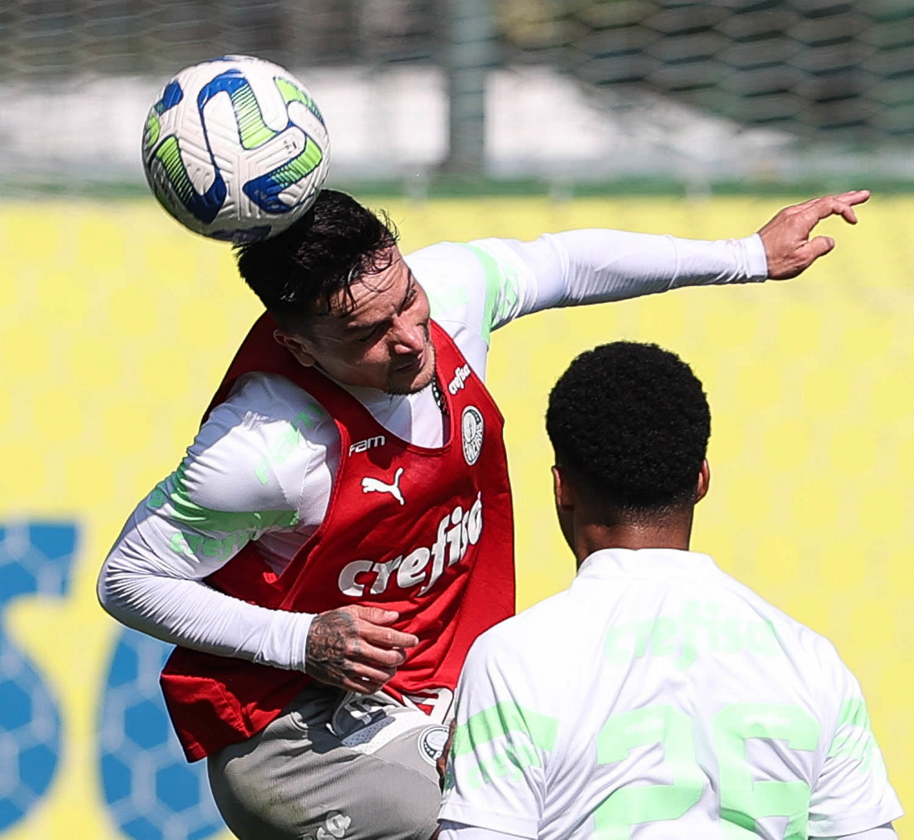 Os jogadores Artur e Gustavo Gómez (D), da SE Palmeiras, durante treinamento, na Academia de Futebol. (Foto: Cesar Greco/Palmeiras/by Canon)