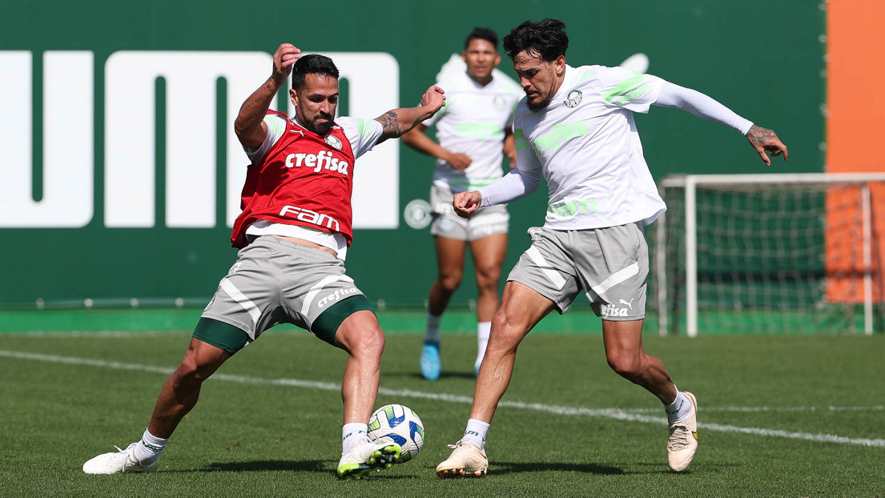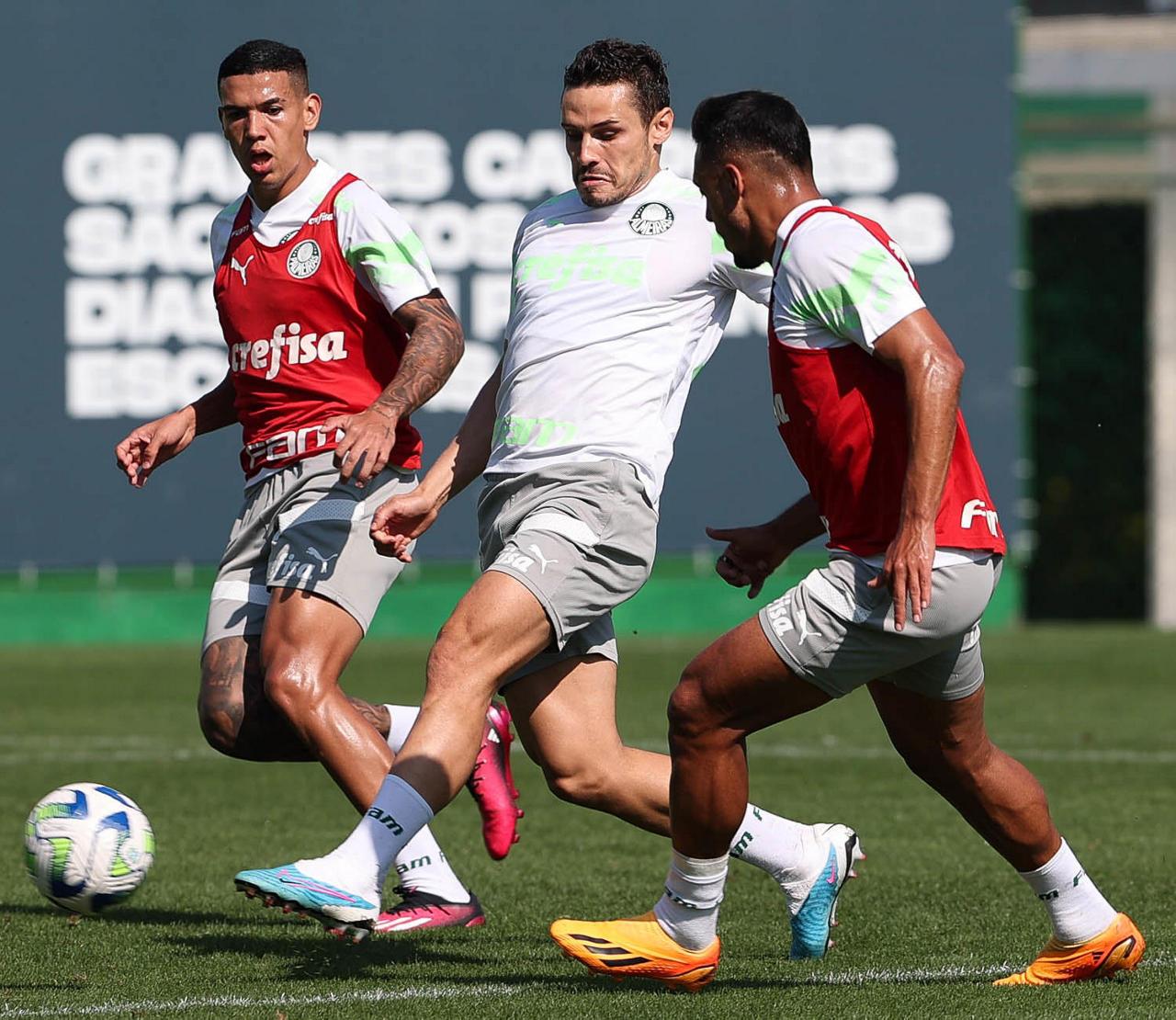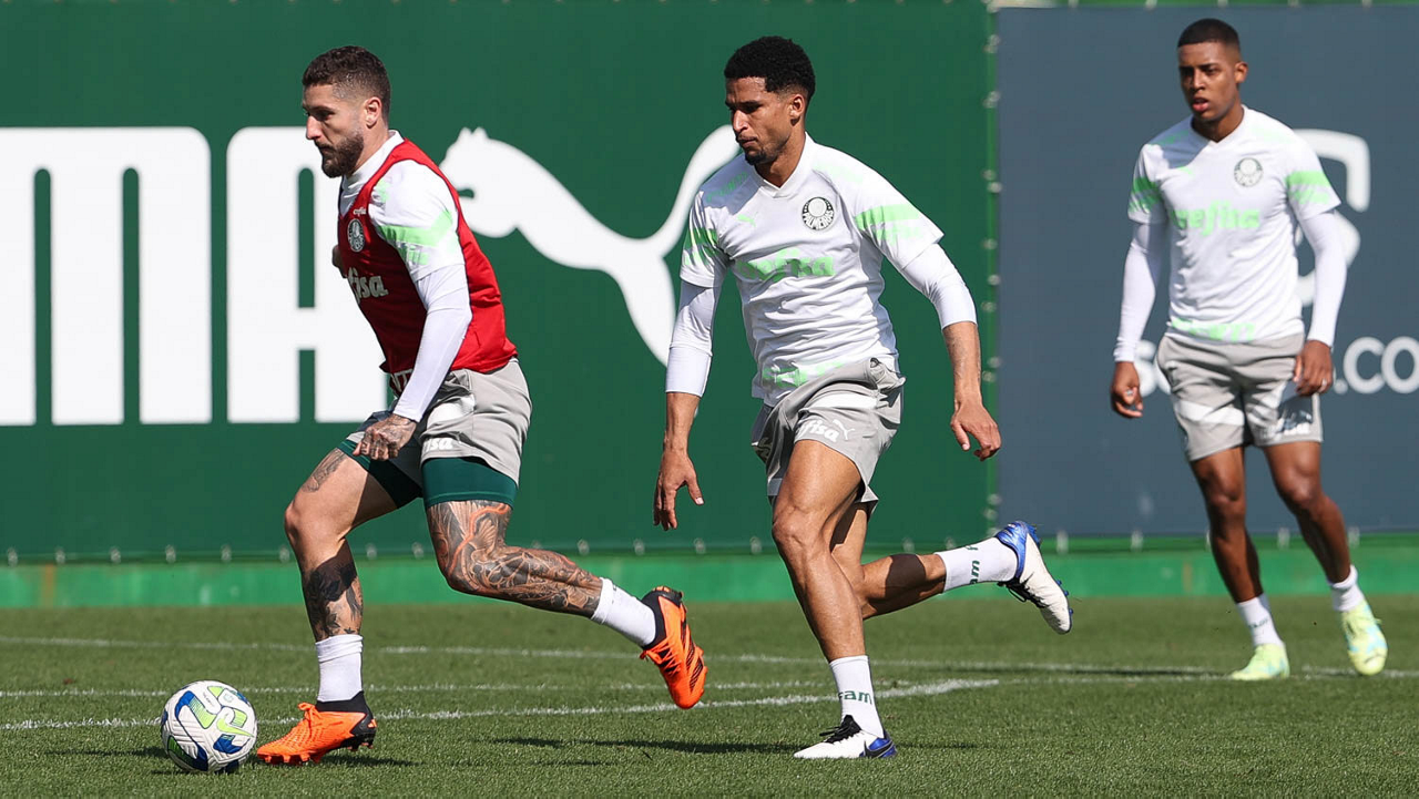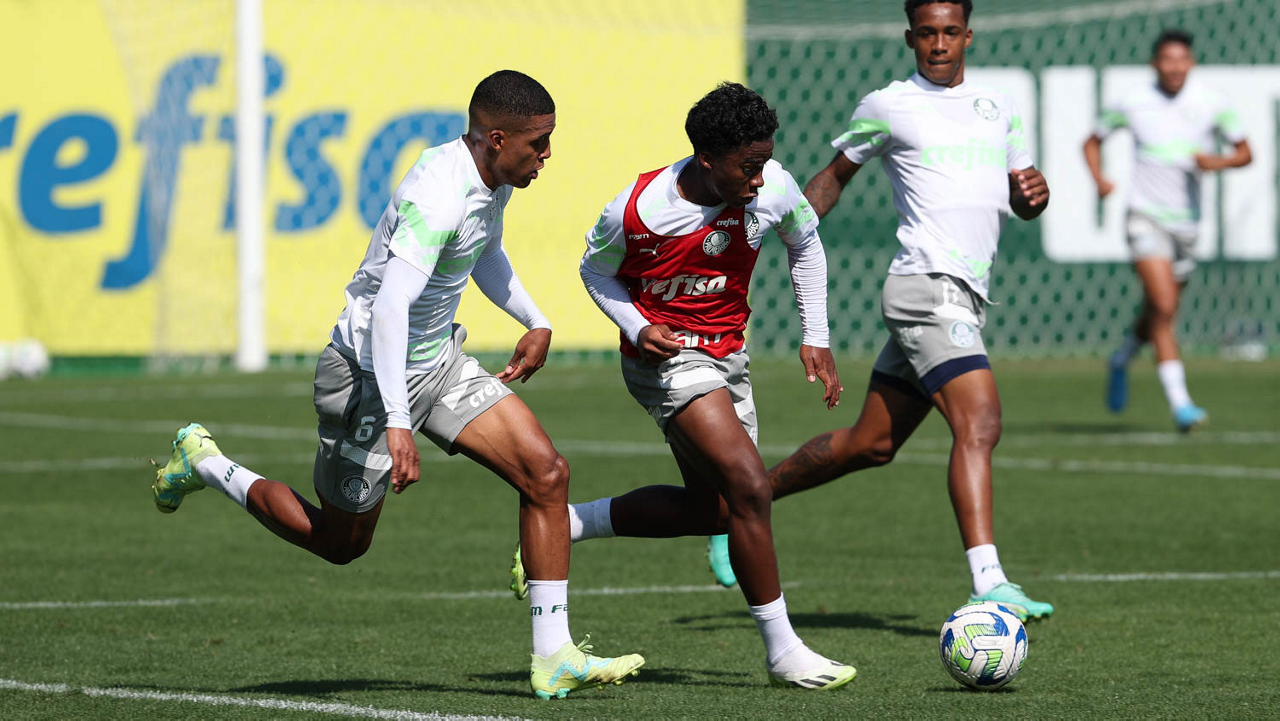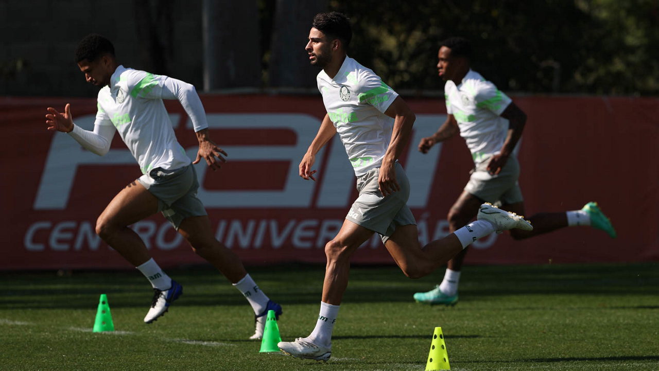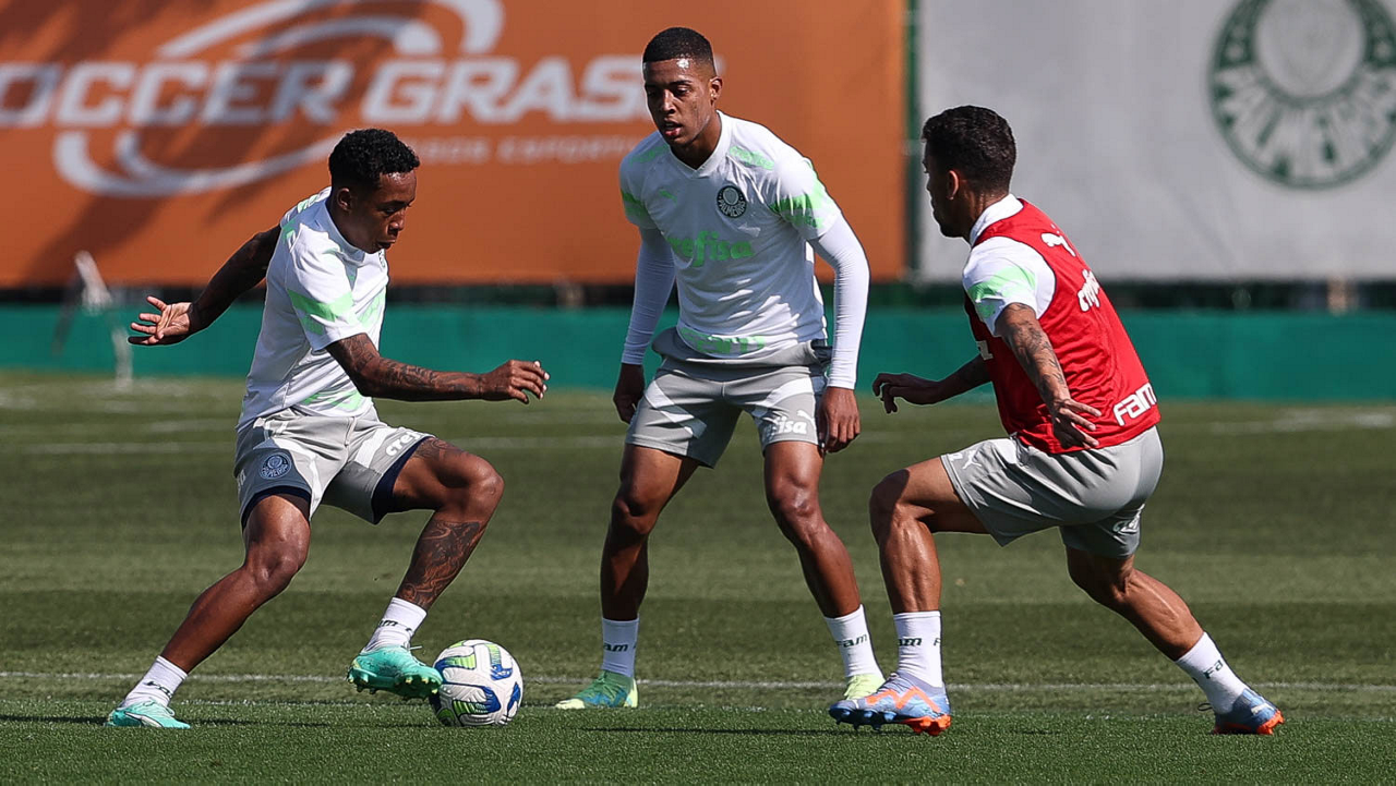 Os jogadores Naves, Raphael Veiga e Gabriel Menino (E/D), da SE Palmeiras, durante treinamento, na Academia de Futebol. (Foto: Cesar Greco/Palmeiras/by Canon)