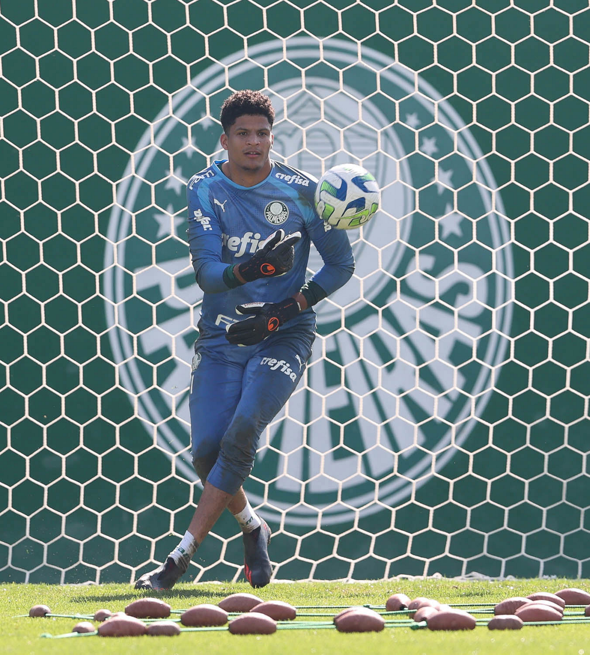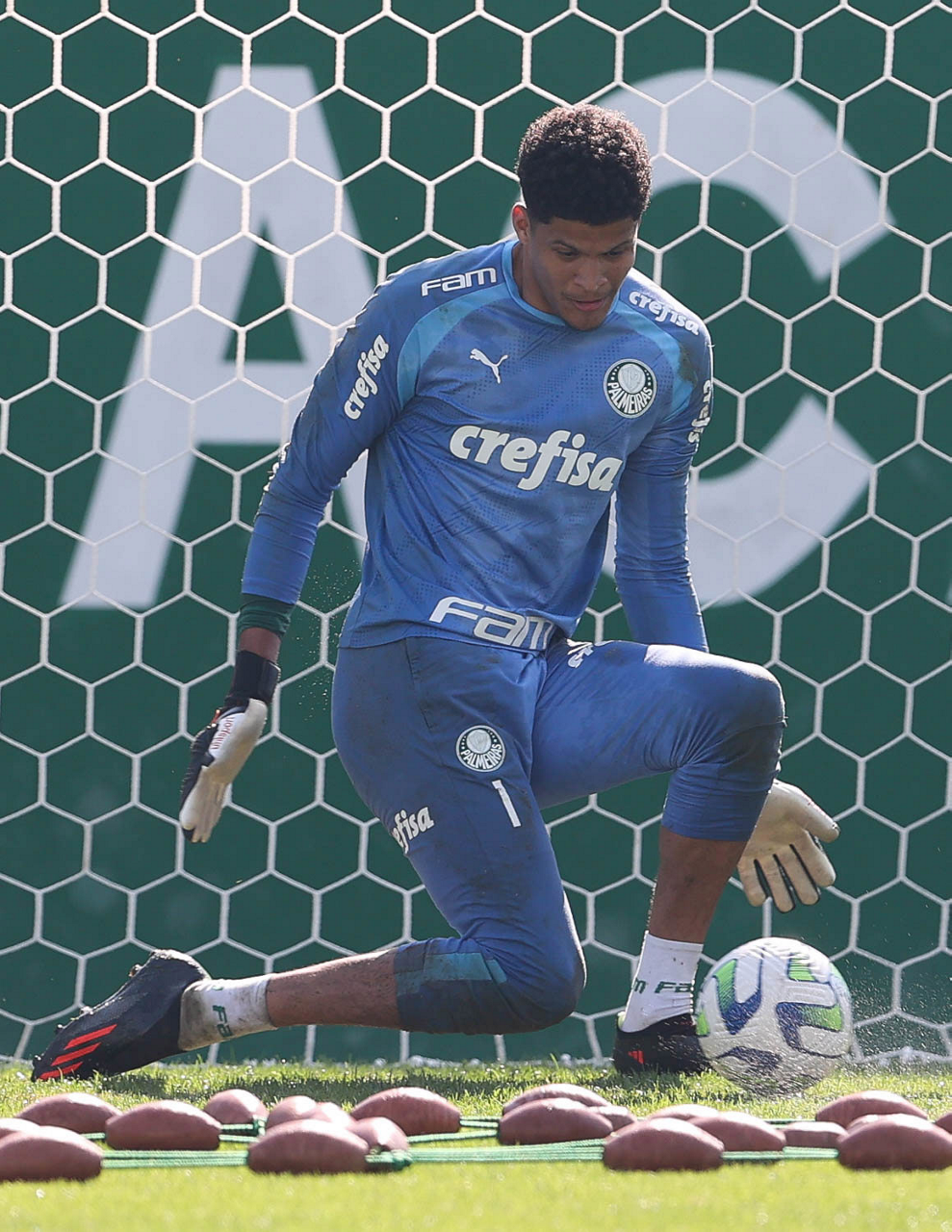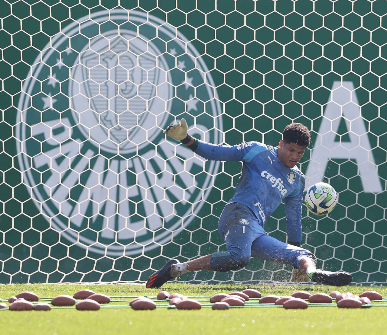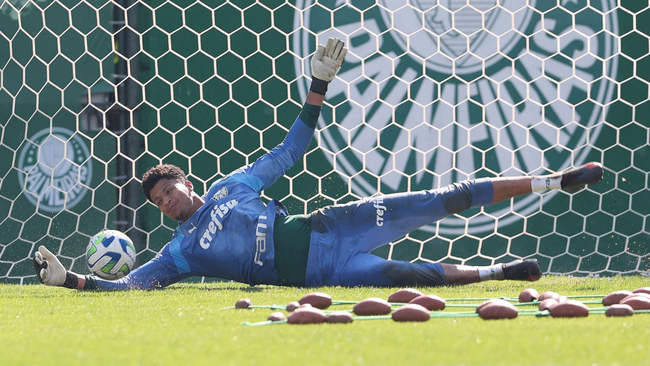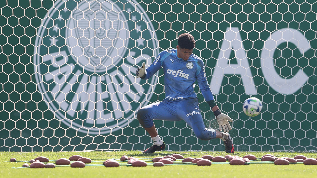 O goleiro Mateus, da SE Palmeiras, durante treinamento, na Academia de Futebol. (Foto: Cesar Greco/Palmeiras/by Canon)