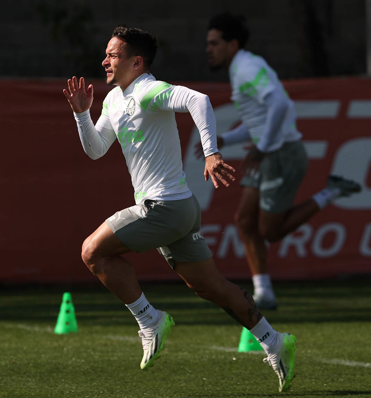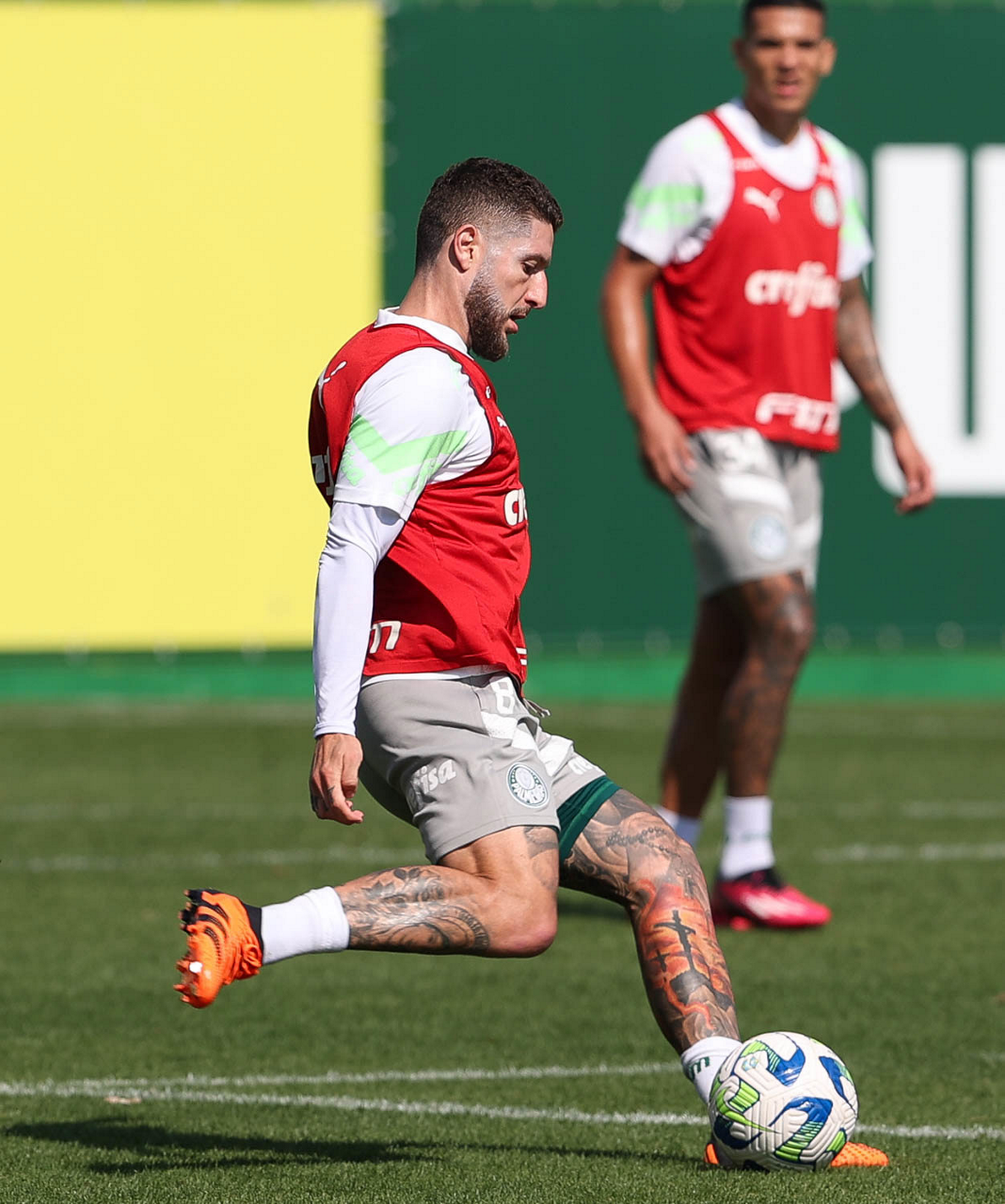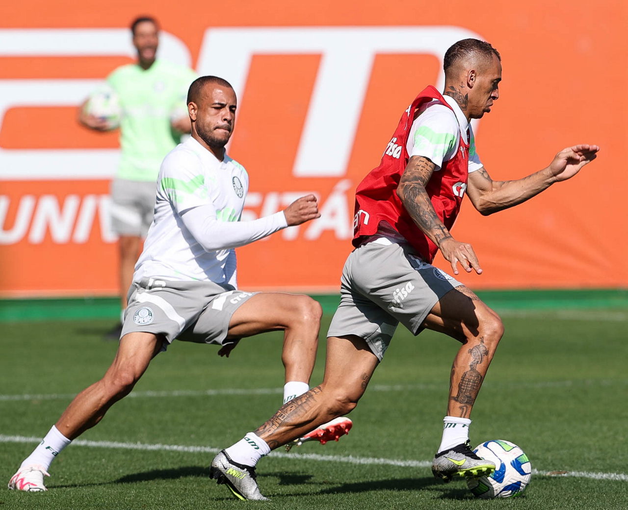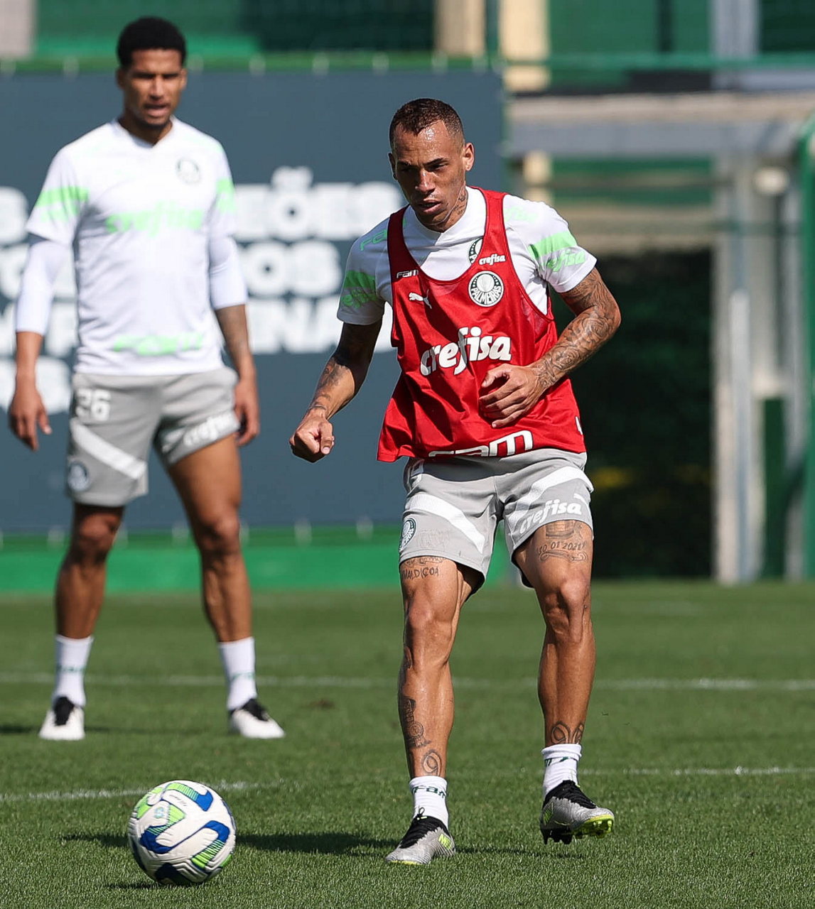 Os jogadores Rony e Joaquín Piquerez (D), da SE Palmeiras, durante treinamento, na Academia de Futebol. (Foto: Cesar Greco/Palmeiras/by Canon)
