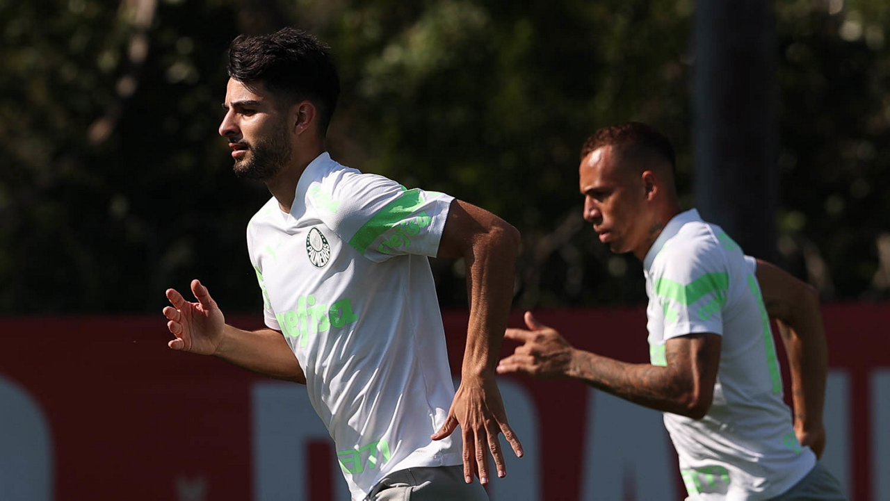 Os jogadores Luis Guilherme e Joaquín Piquerez (D), da SE Palmeiras, durante treinamento, na Academia de Futebol. (Foto: Cesar Greco/Palmeiras/by Canon)