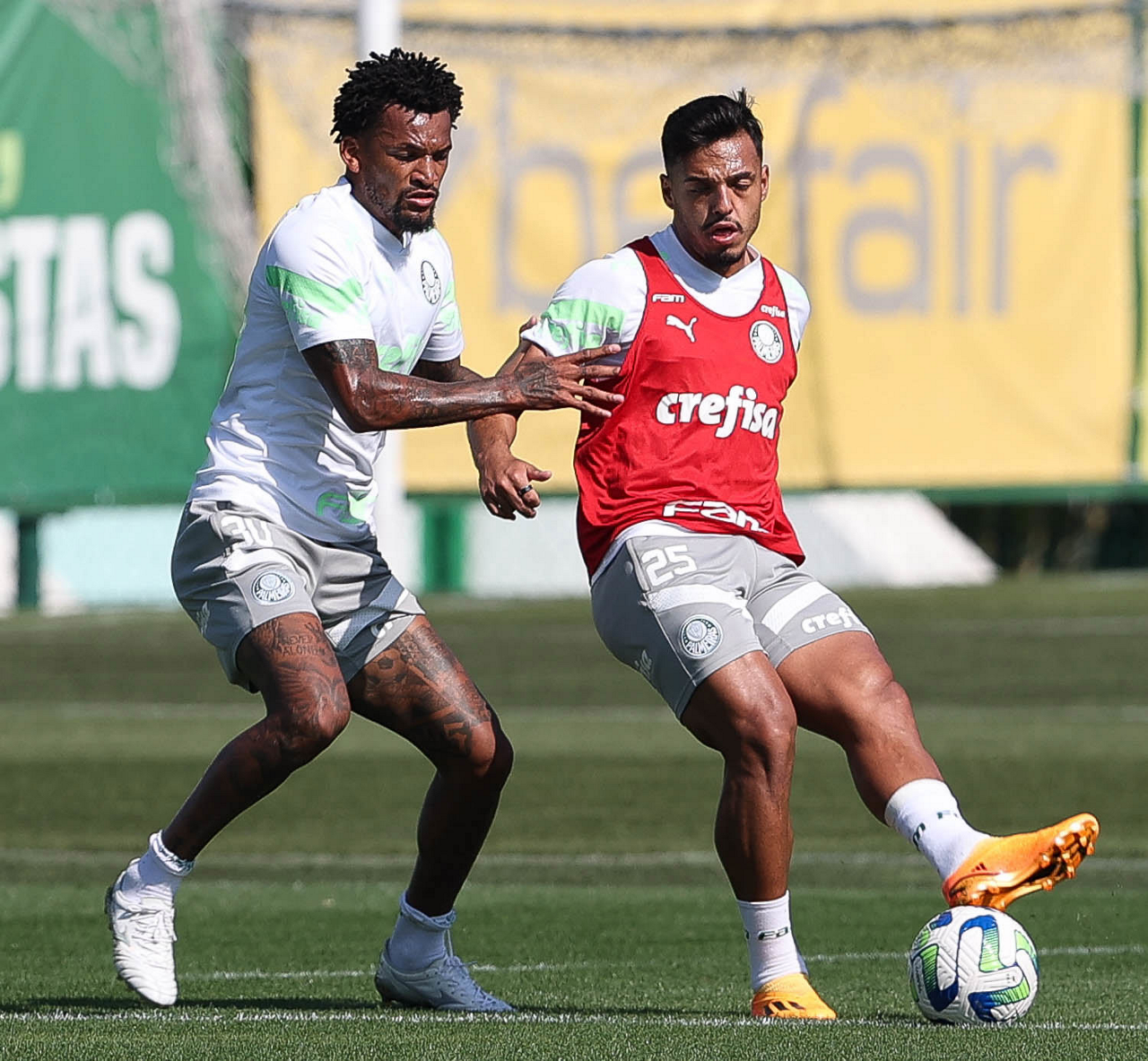 Os jogadores Luis Guilherme e Fabinho (D), da SE Palmeiras, durante treinamento, na Academia de Futebol. (Foto: Cesar Greco/Palmeiras/by Canon)