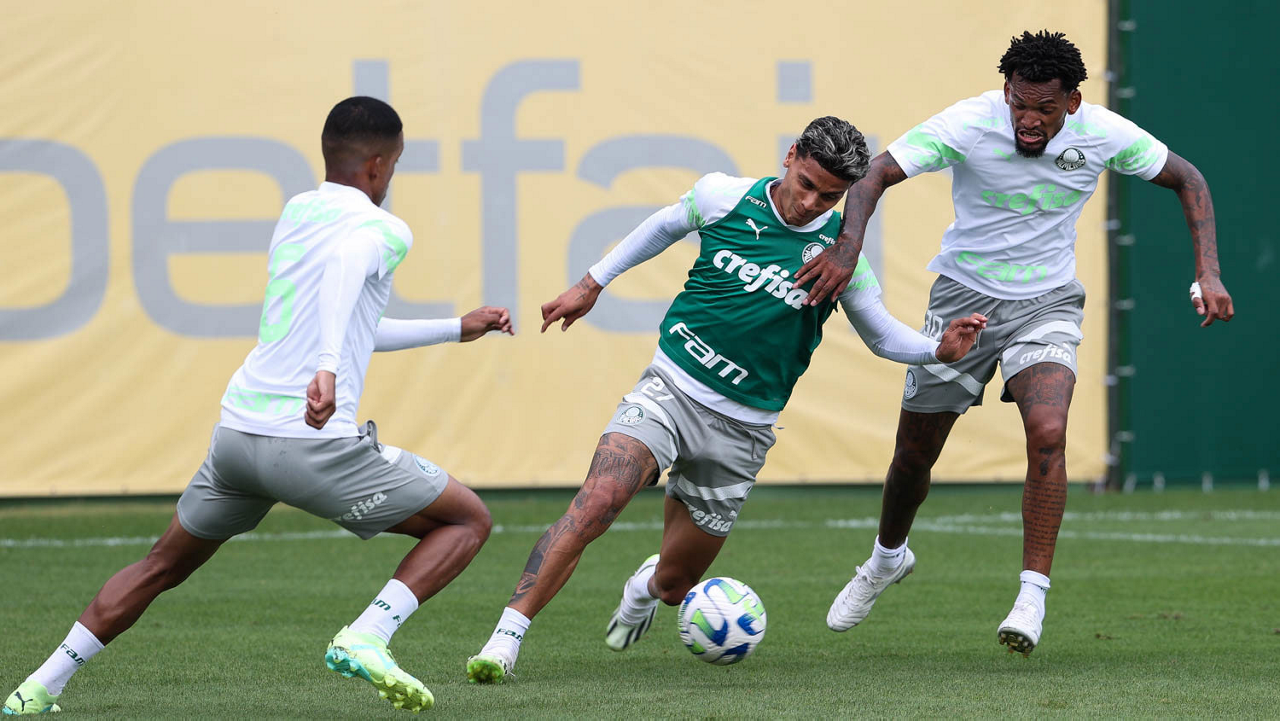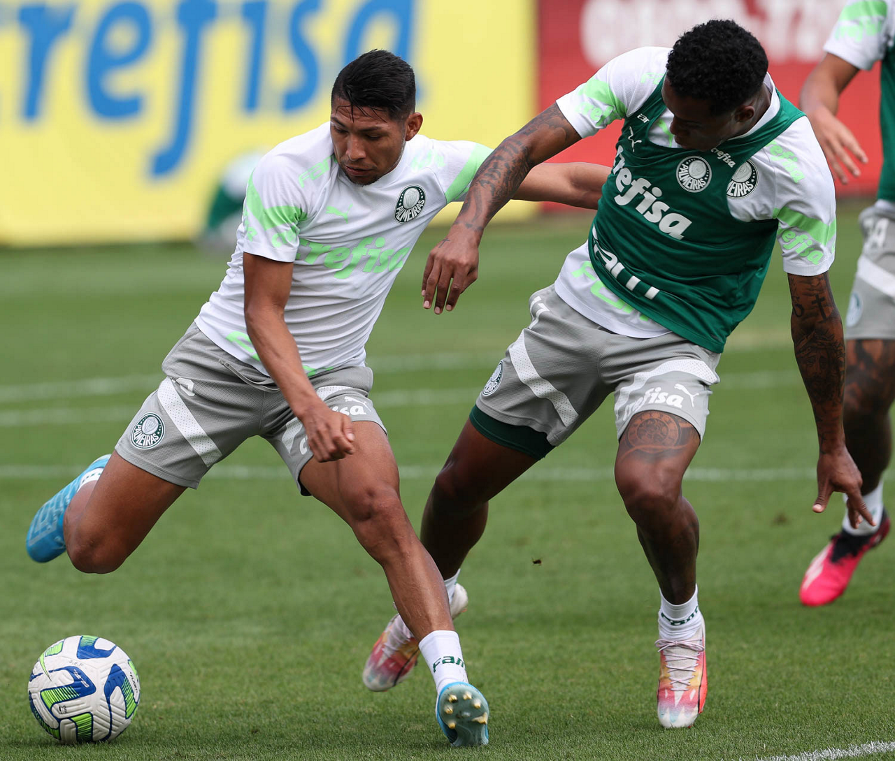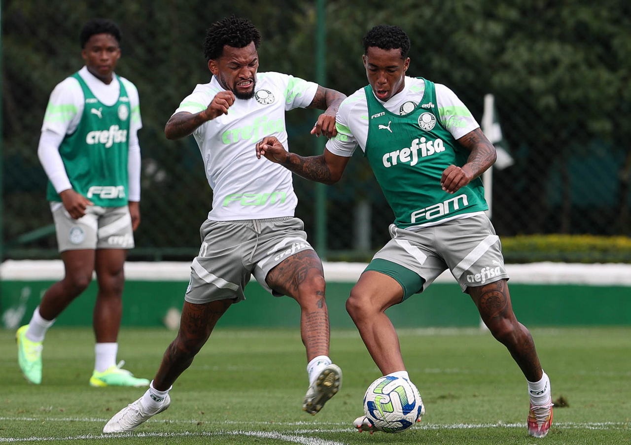 Os jogadores Richard Ríos e Jailson (D), da SE Palmeiras, durante treinamento, na Academia de Futebol. (Foto: Cesar Greco/Palmeiras/by Canon)