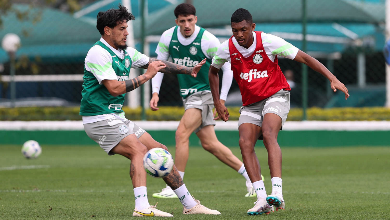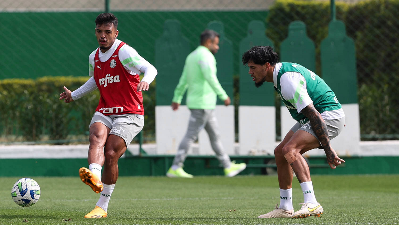 Os jogadores Gabriel Menino e Gustavo Gómez (D), da SE Palmeiras, durante treinamento, na Academia de Futebol. (Foto: Cesar Greco/Palmeiras/by Canon)