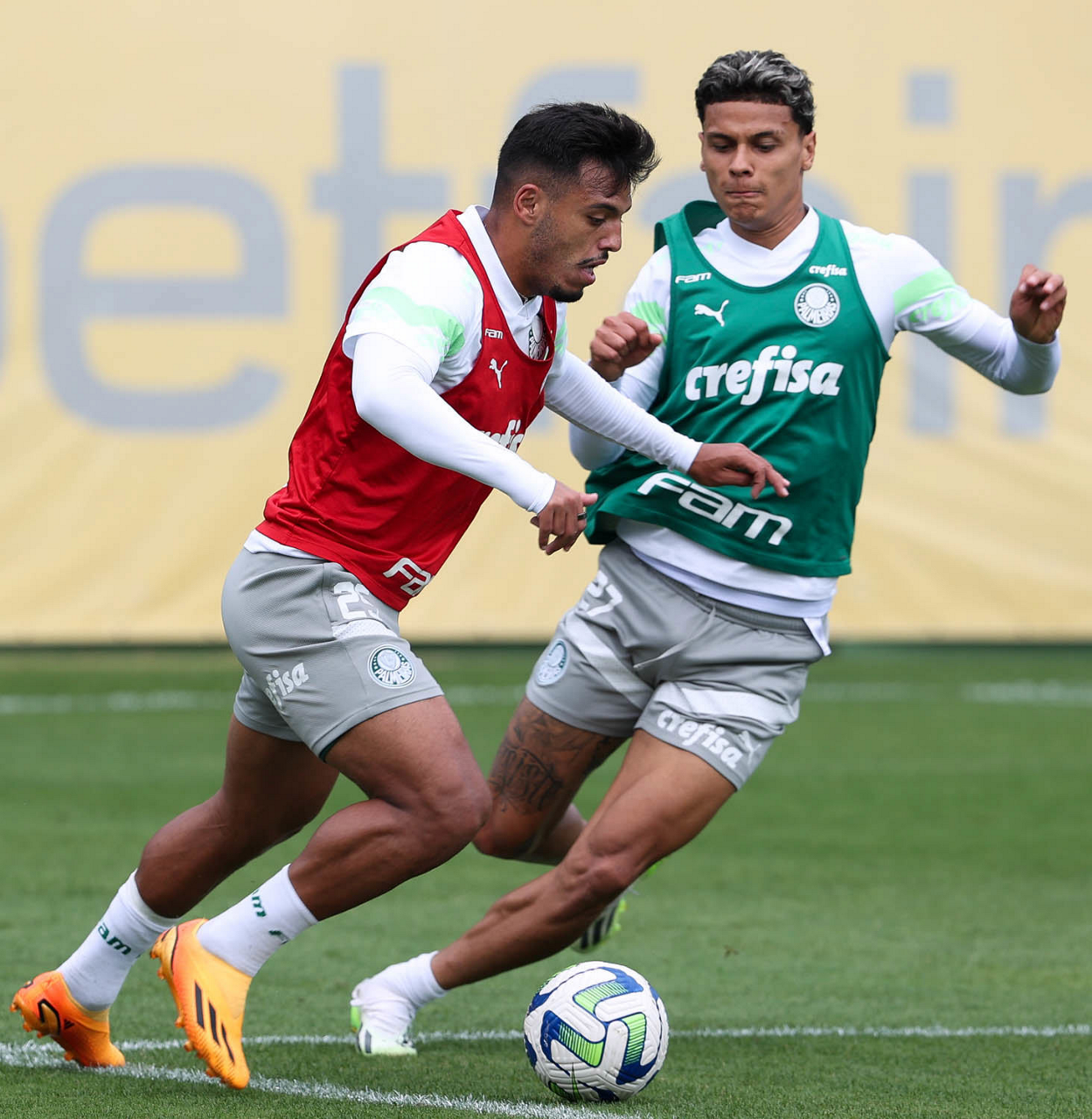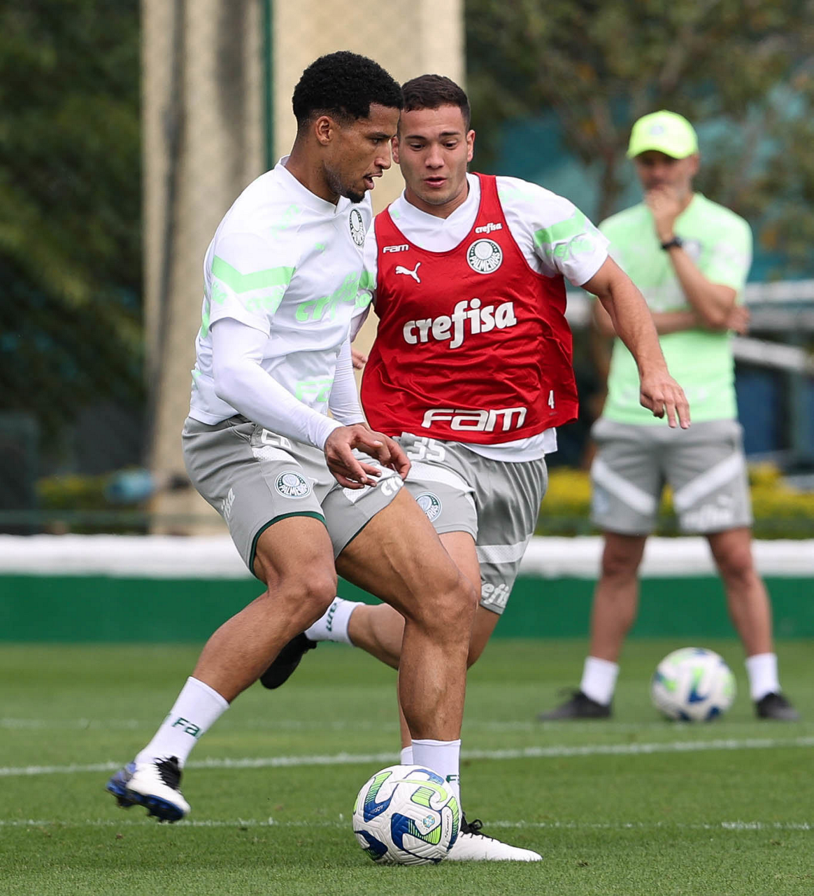Os jogadores Raphael Veiga e Gabriel Menino (D), da SE Palmeiras, durante treinamento, na Academia de Futebol. (Foto: Cesar Greco/Palmeiras/by Canon)