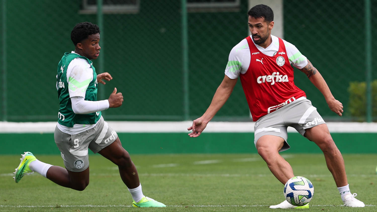 Os jogadores Endrick e Luan (D), da SE Palmeiras, durante treinamento, na Academia de Futebol. (Foto: Cesar Greco/Palmeiras/by Canon)