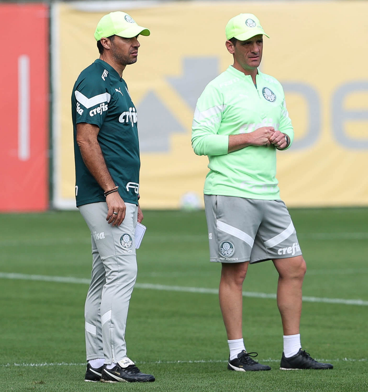 O técnico Abel Ferreira e o preparador físico Marco Aurélio (E), da SE Palmeiras, durante treinamento, na Academia de Futebol. (Foto: Cesar Greco/Palmeiras/by Canon)