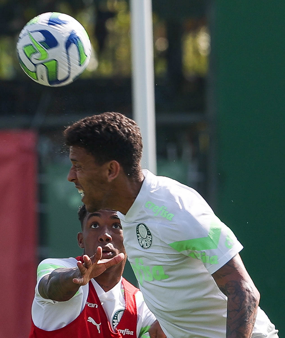Os jogadores Kevin e Marcos Rocha (D), da SE Palmeiras, durante treinamento, na Academia de Futebol. (Foto: Cesar Greco/Palmeiras/by Canon)