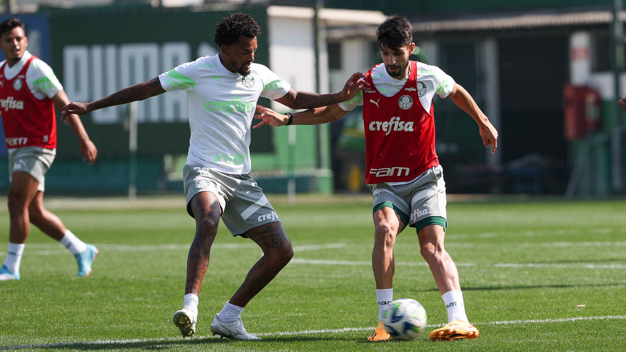 Os jogadores Jailson e Gabriel Menino (D), da SE Palmeiras, durante treinamento, na Academia de Futebol. (Foto: Cesar Greco/Palmeiras/by Canon)
