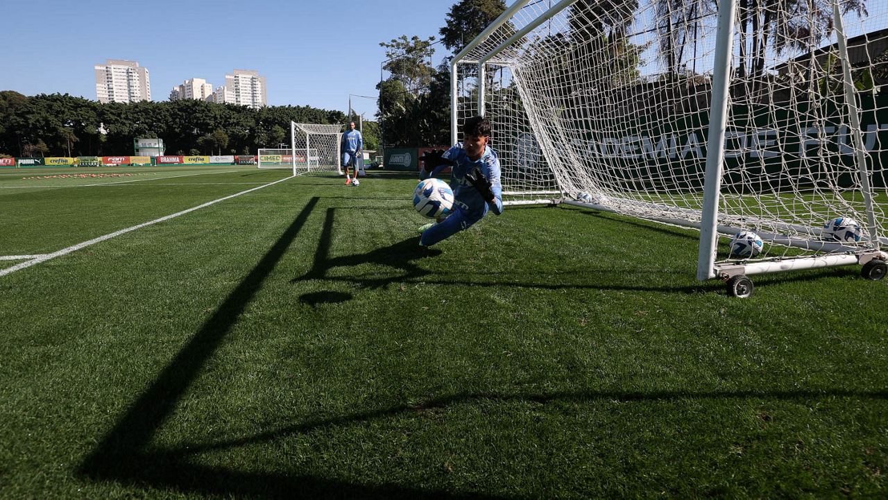 O goleiro Kaique, da SE Palmeiras, durante treinamento, na Academia de Futebol. (Foto: Cesar Greco/Palmeiras/by Canon)