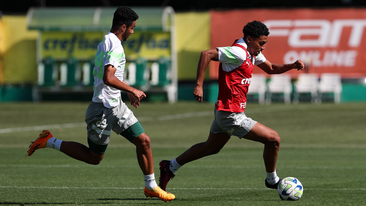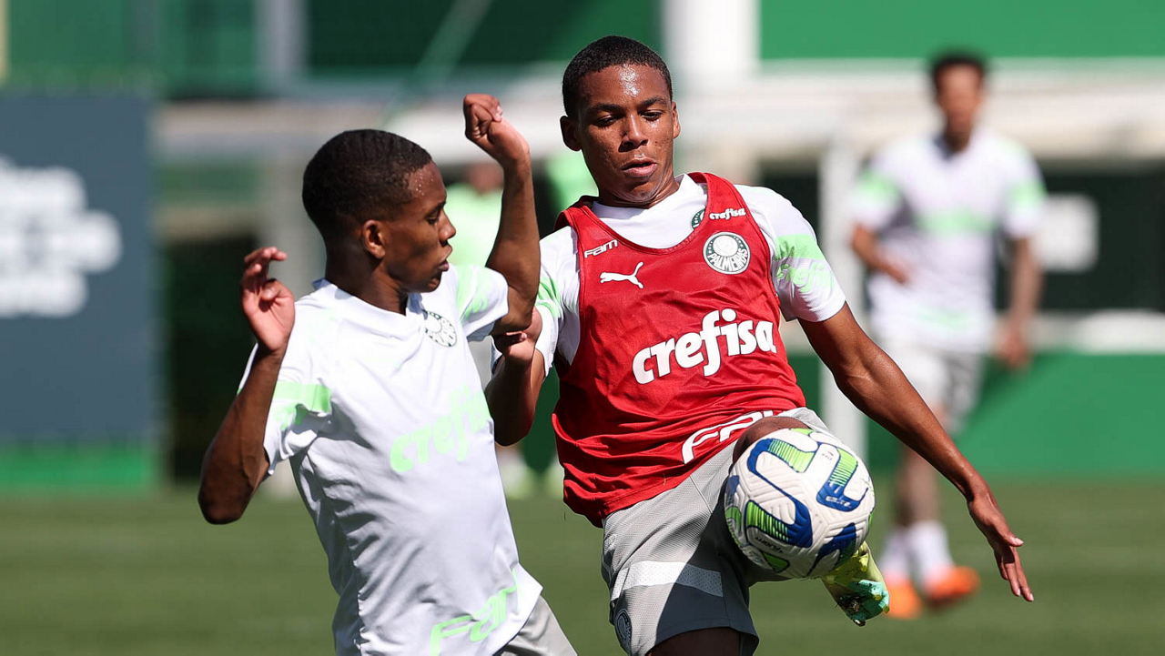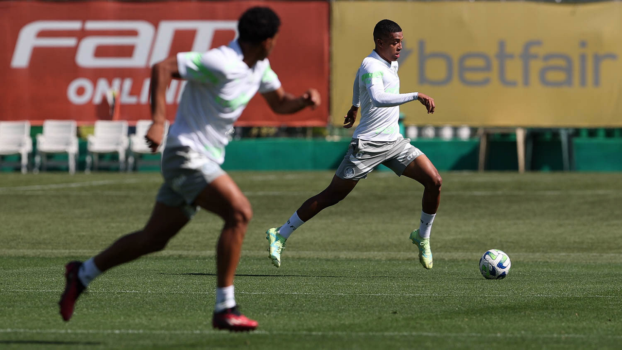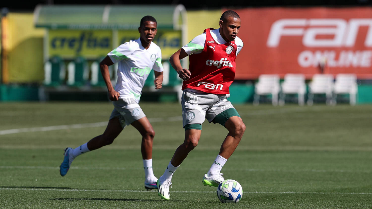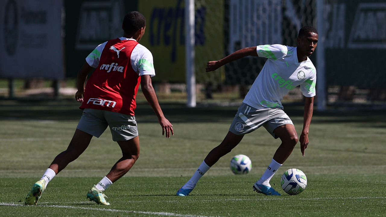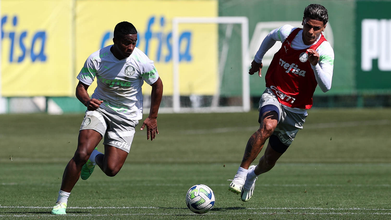 Os jogadores Endrick e Richard Ríos (D), da SE Palmeiras, durante treinamento, na Academia de Futebol. (Foto: Cesar Greco/Palmeiras/by Canon)