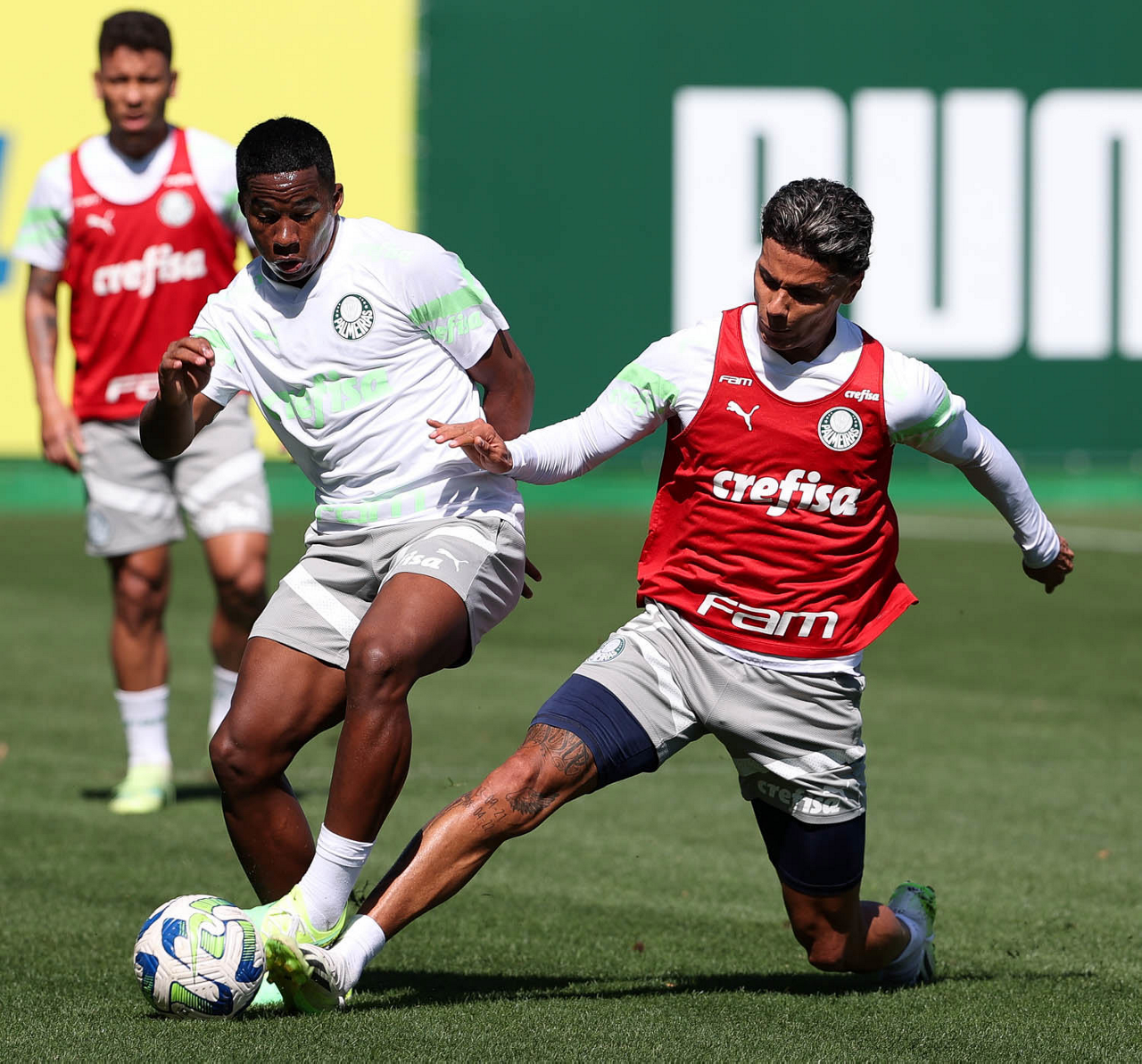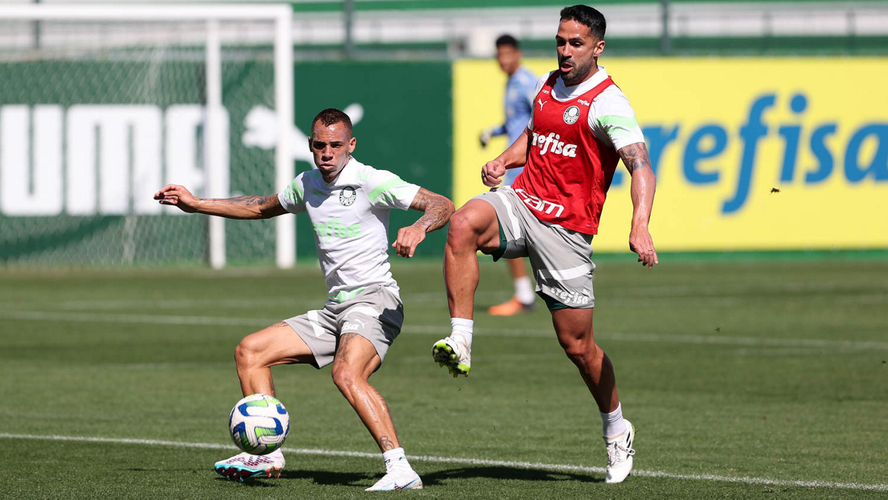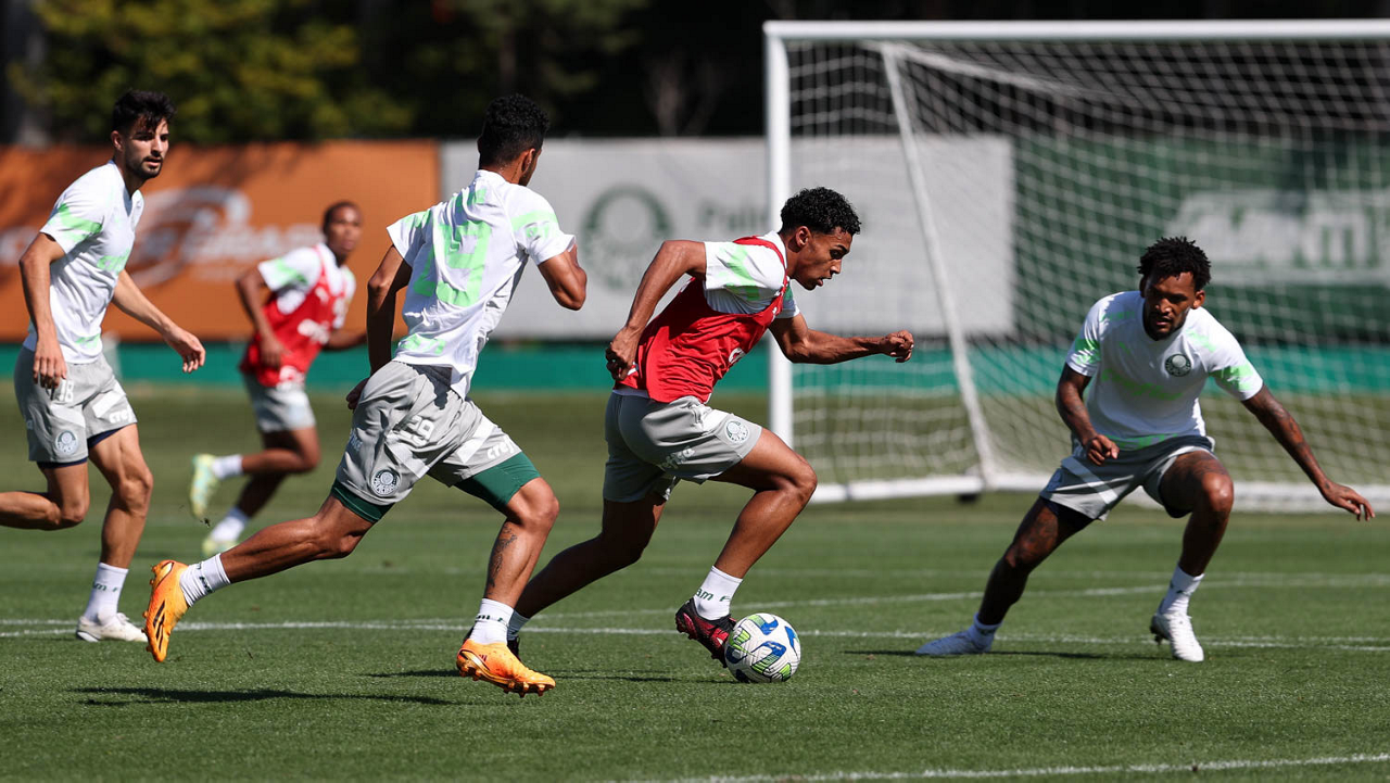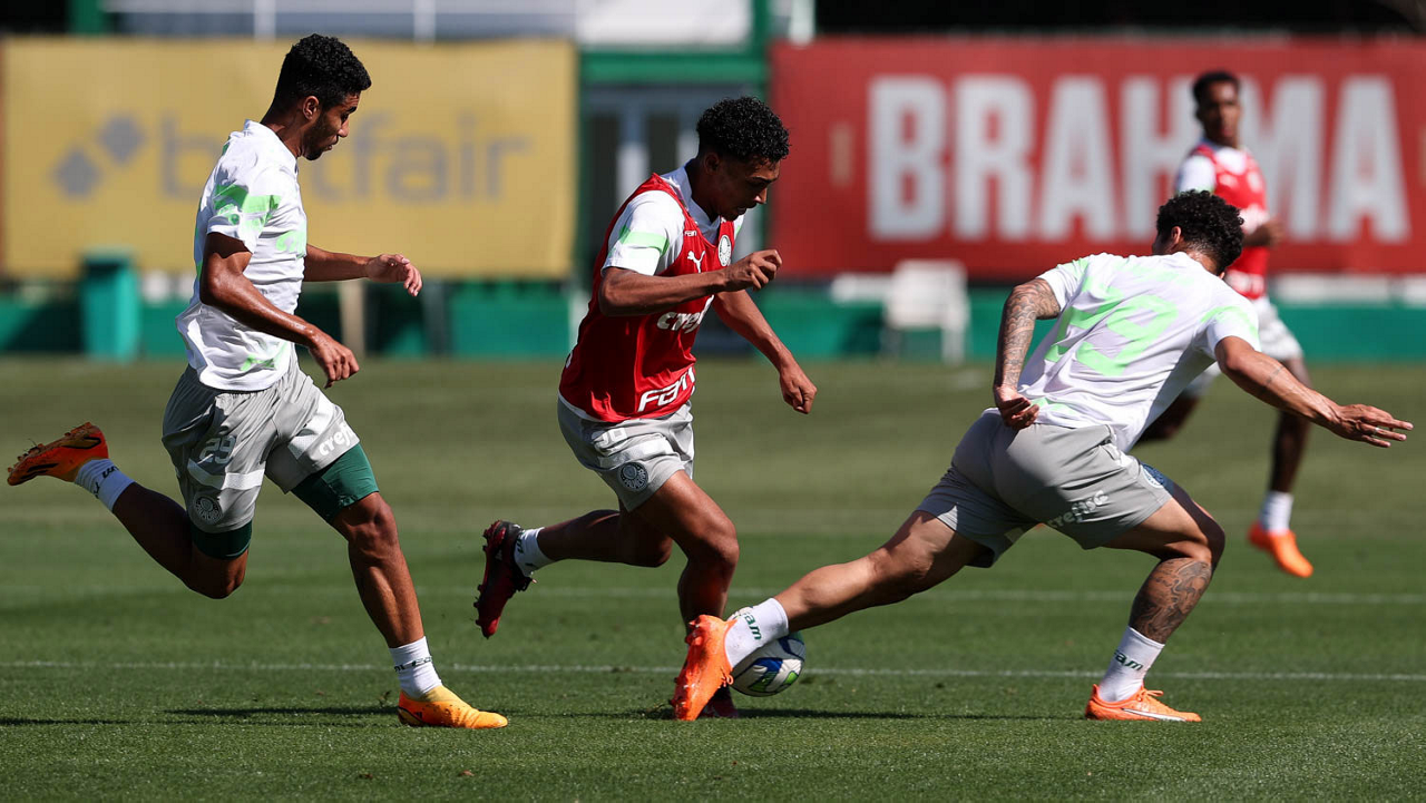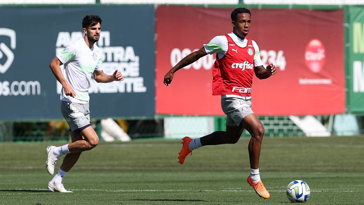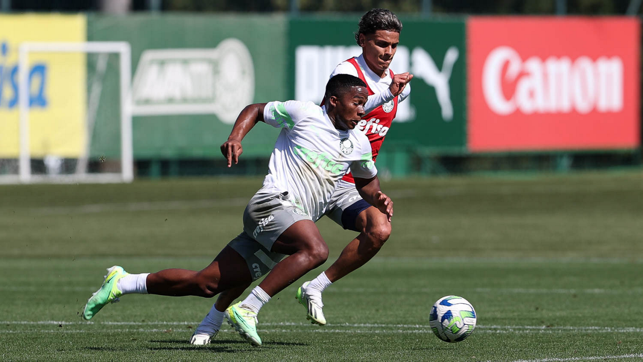 Os jogadores Endrick e Richard Ríos (D), da SE Palmeiras, durante treinamento, na Academia de Futebol. (Foto: Cesar Greco/Palmeiras/by Canon)