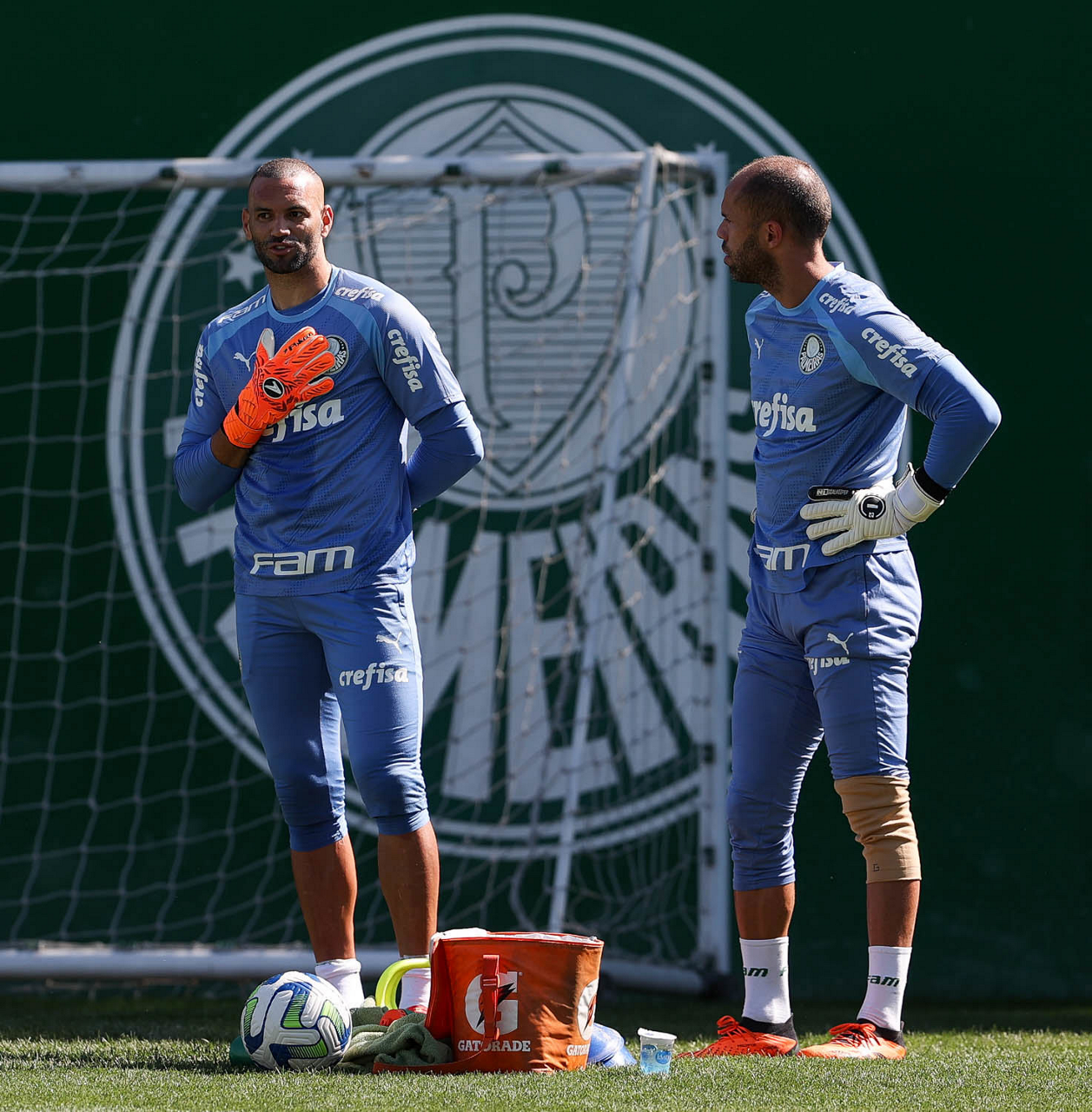 Os goleiros Weverton e Marcelo Lomba (D), da SE Palmeiras, durante treinamento, na Academia de Futebol. (Foto: Cesar Greco/Palmeiras/by Canon)
