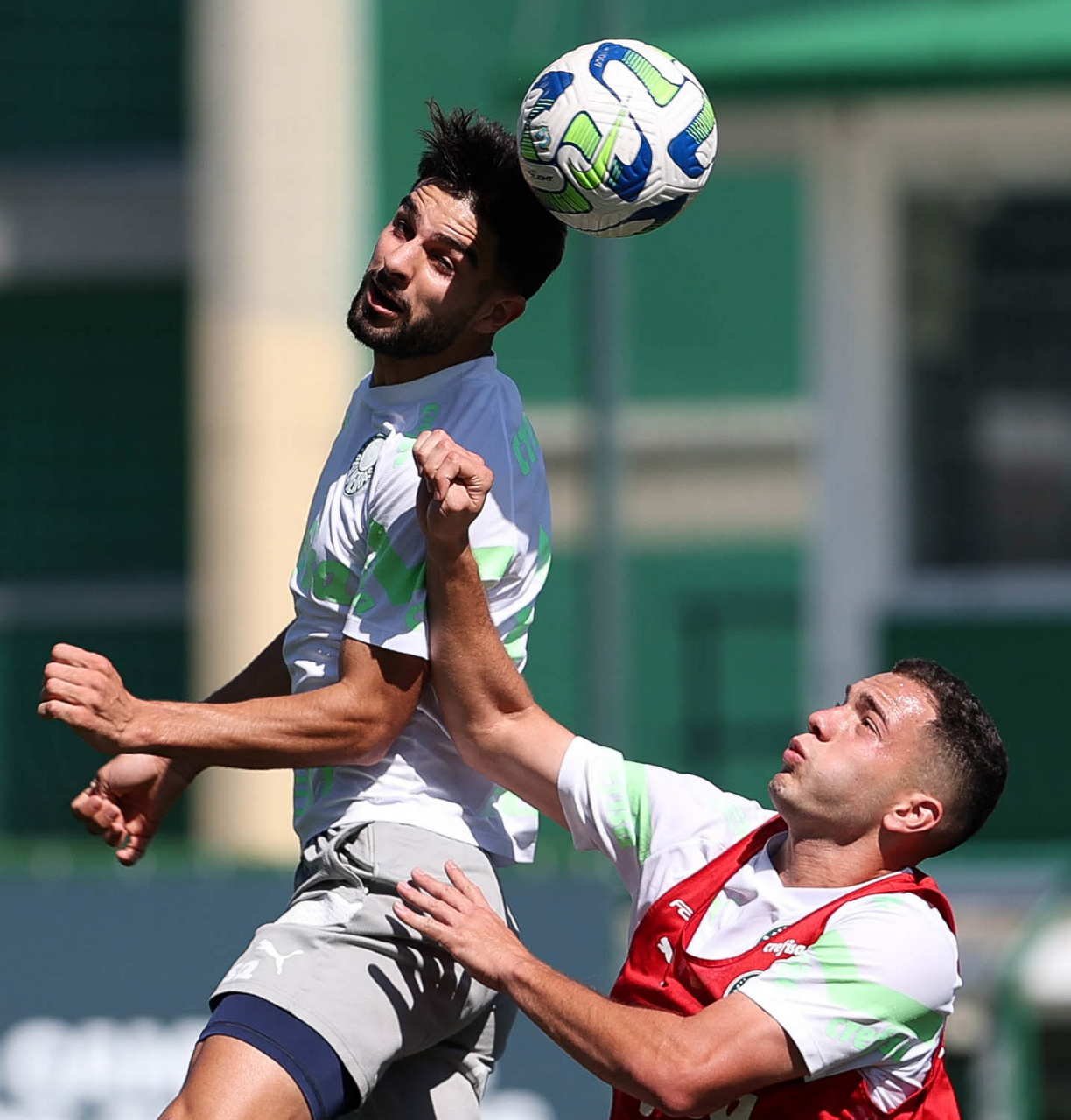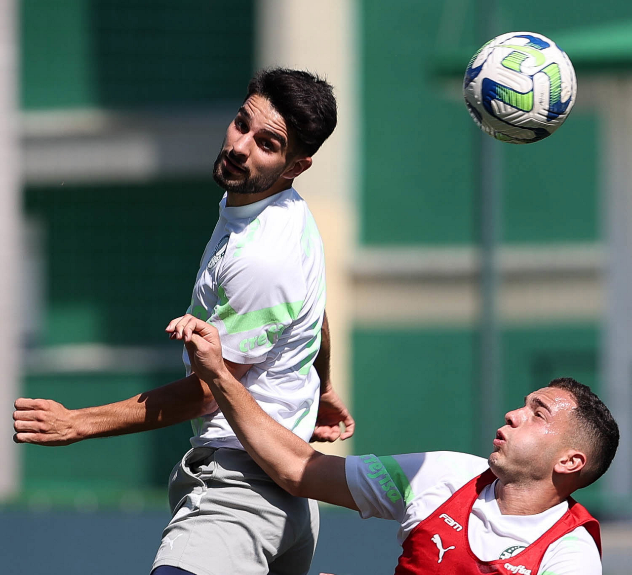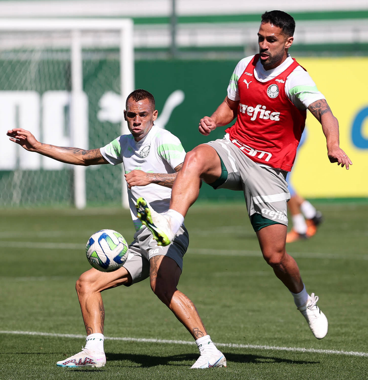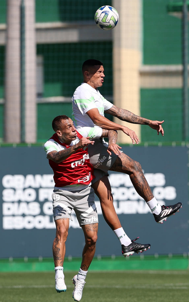 Os jogadores Alex e Estêvão (D), da SE Palmeiras, durante treinamento, na Academia de Futebol. (Foto: Cesar Greco/Palmeiras/by Canon)