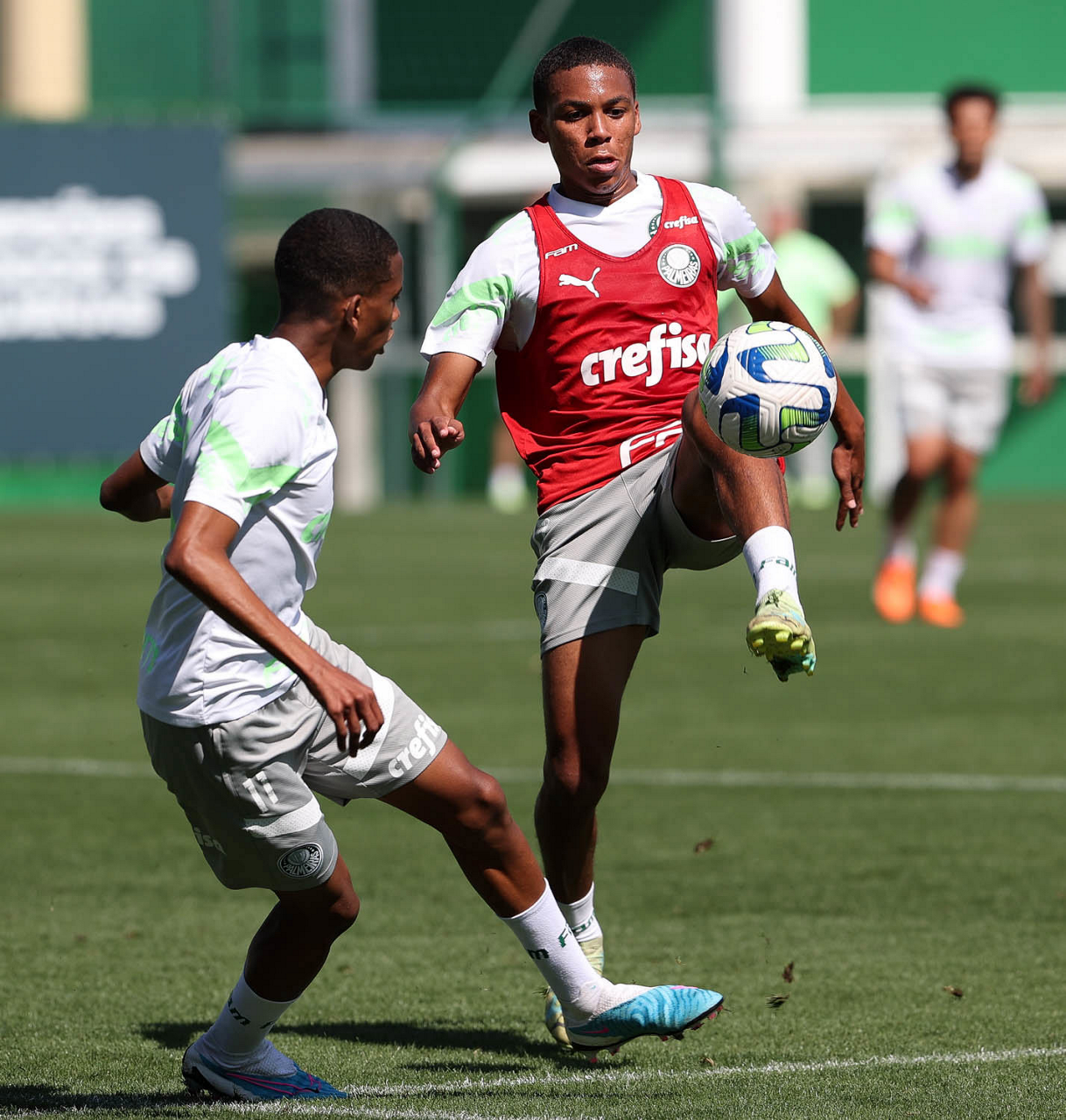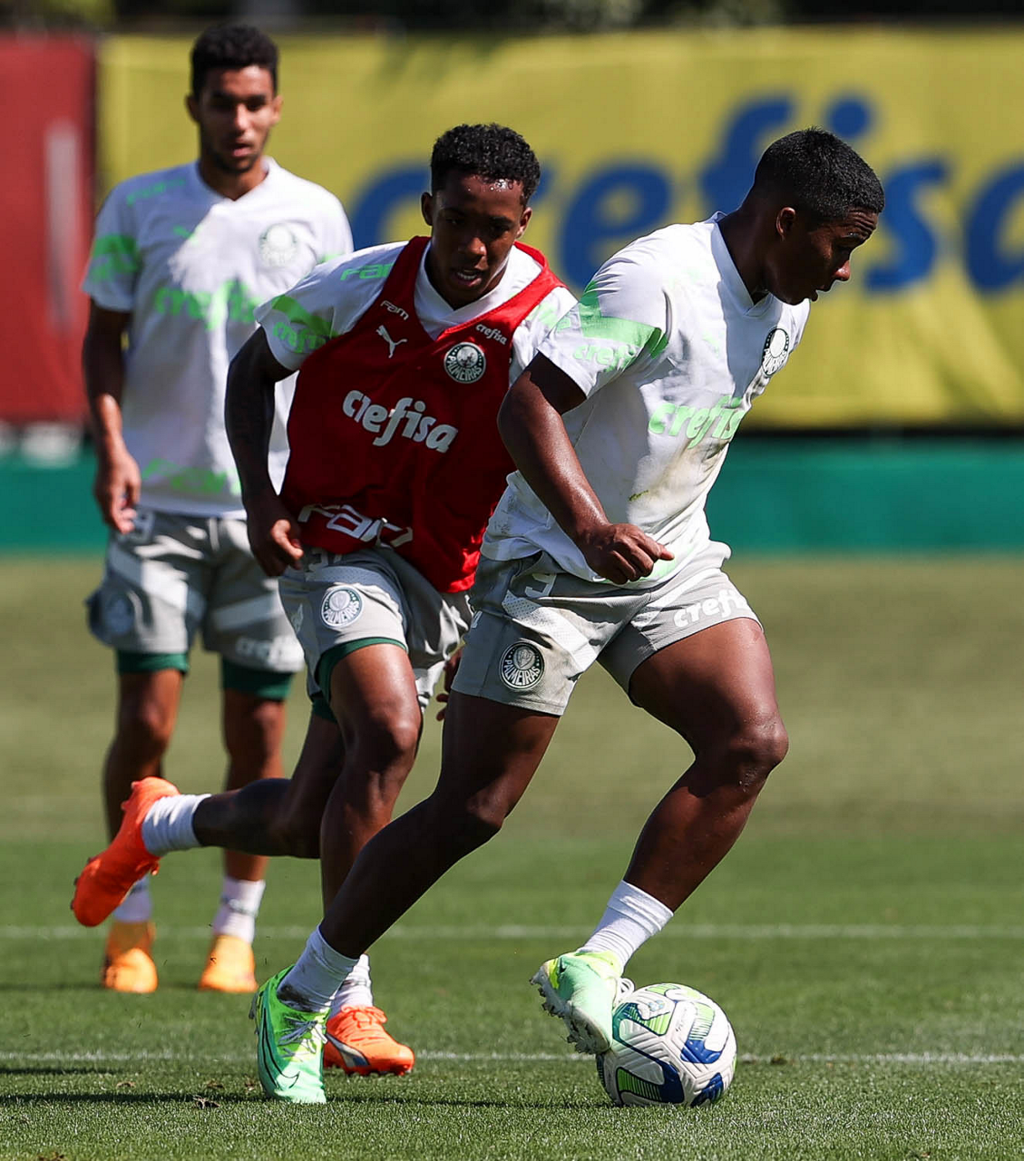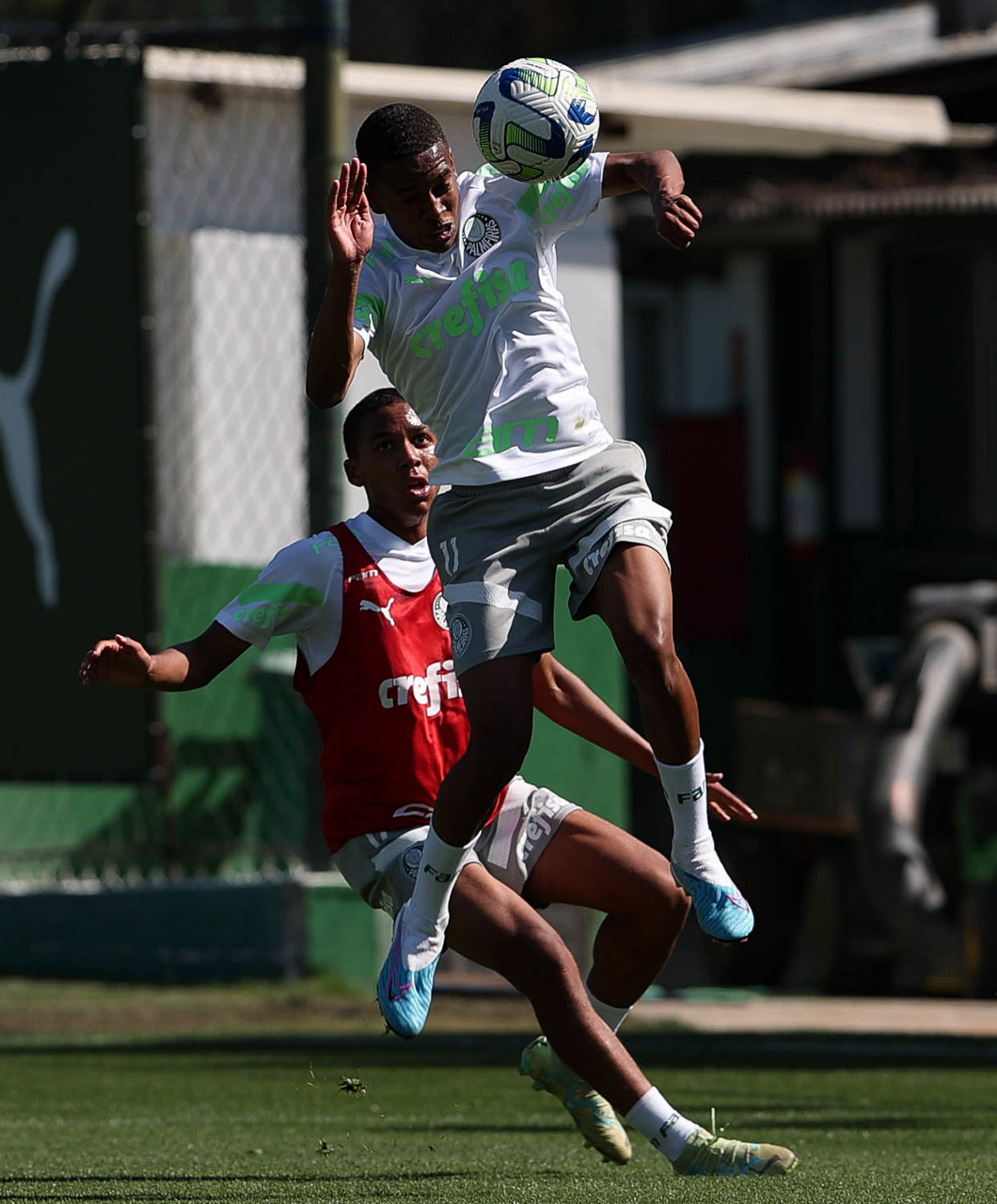 Os jogadores Kevin e Endrick (D), da SE Palmeiras, durante treinamento, na Academia de Futebol. (Foto: Cesar Greco/Palmeiras/by Canon)