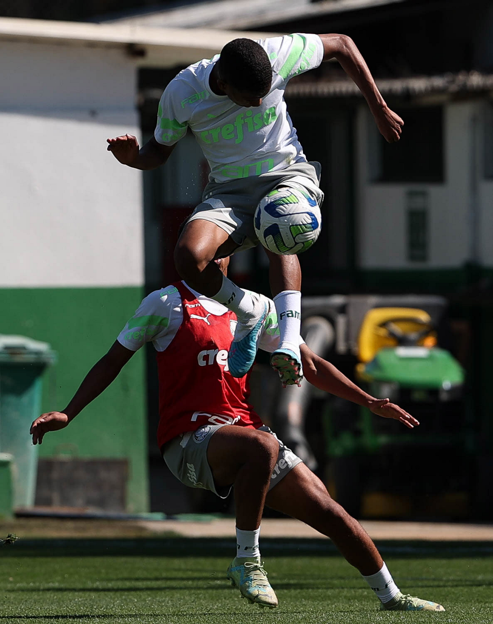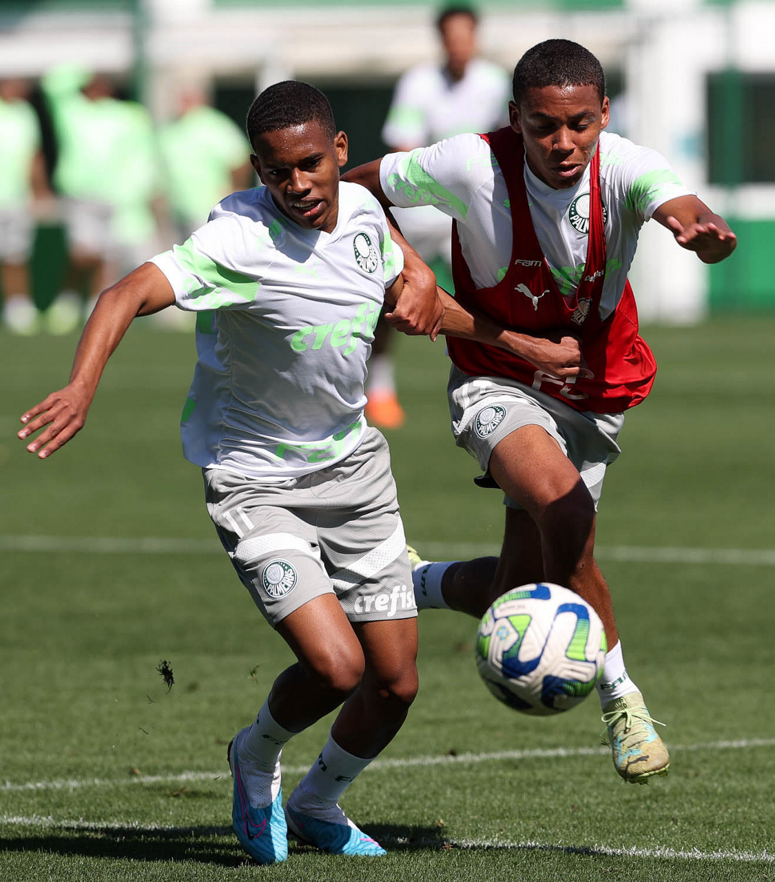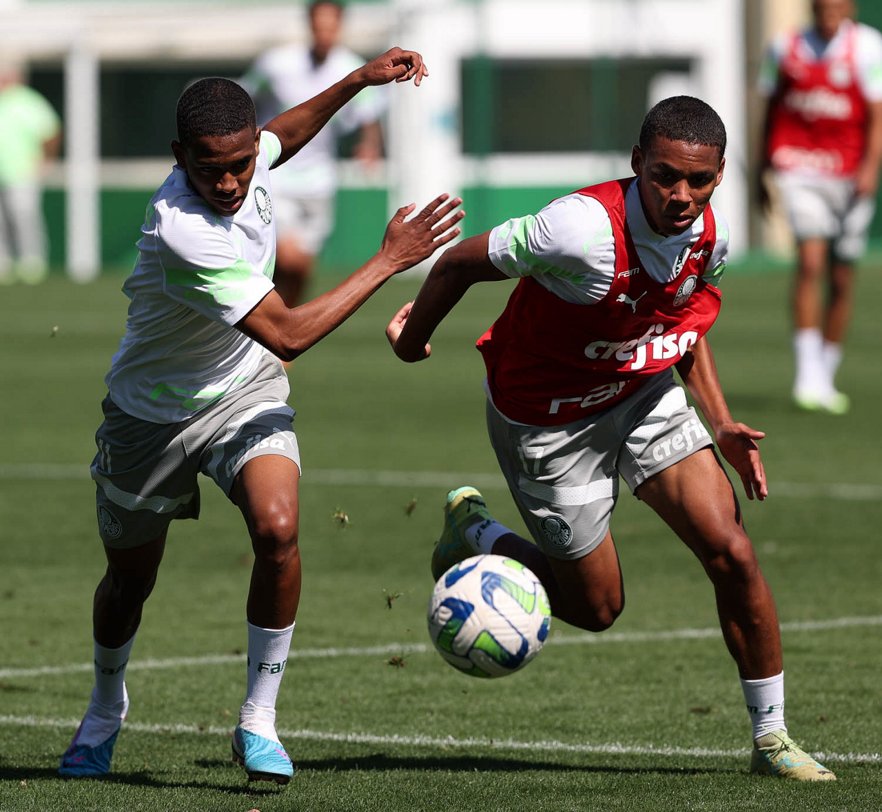Os jogadores Kevin e Endrick (D), da SE Palmeiras, durante treinamento, na Academia de Futebol. (Foto: Cesar Greco/Palmeiras/by Canon)