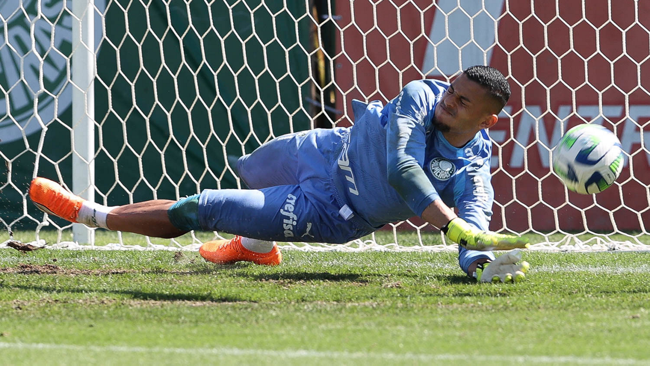 O goleiro Mateus, da SE Palmeiras, durante treinamento, na Academia de Futebol. (Foto: Cesar Greco/Palmeiras/by Canon)