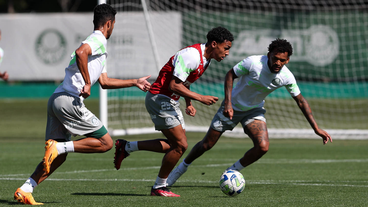 Os jogadores David Kauã, Luighi e Ian (E/D), da SE Palmeiras, durante treinamento, na Academia de Futebol. (Foto: Cesar Greco/Palmeiras/by Canon)