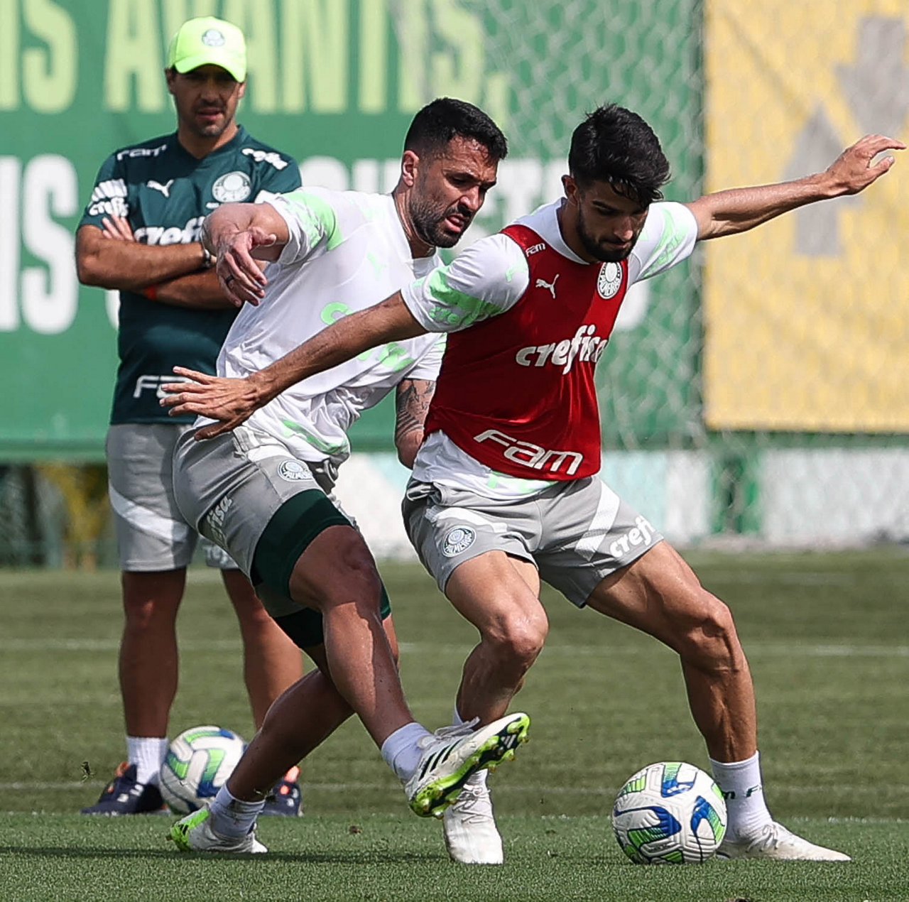 Os jogadores Joaquín Piquerez e Raphael Veiga (D), da SE Palmeiras, durante treinamento, na Academia de Futebol. (Foto: Cesar Greco/Palmeiras/by Canon)