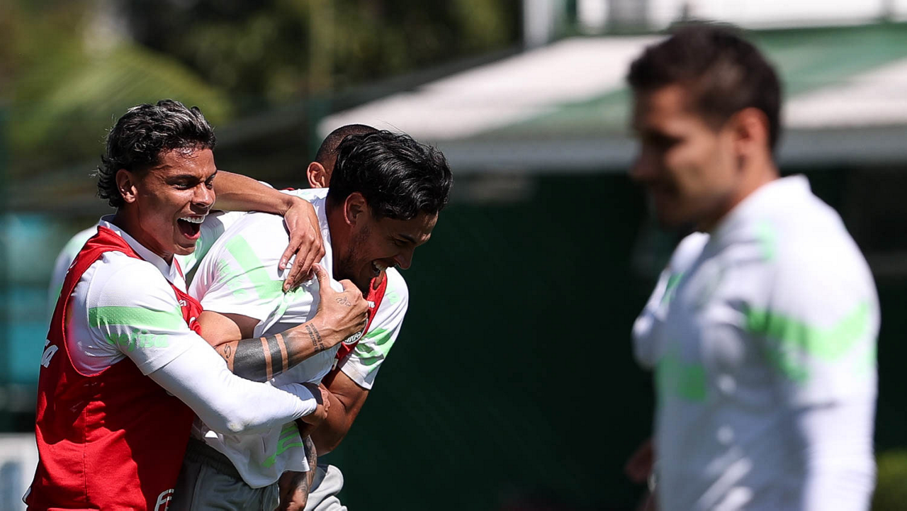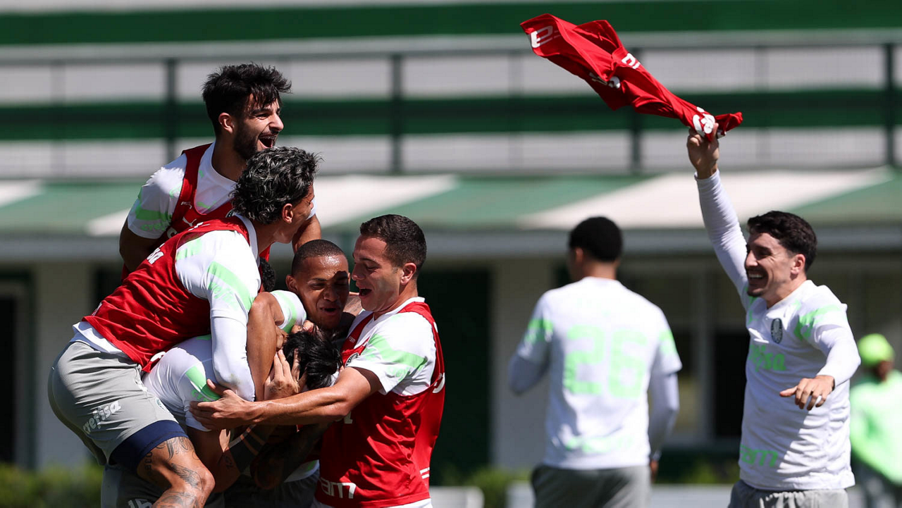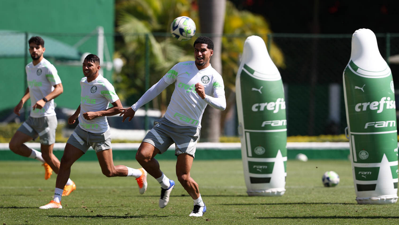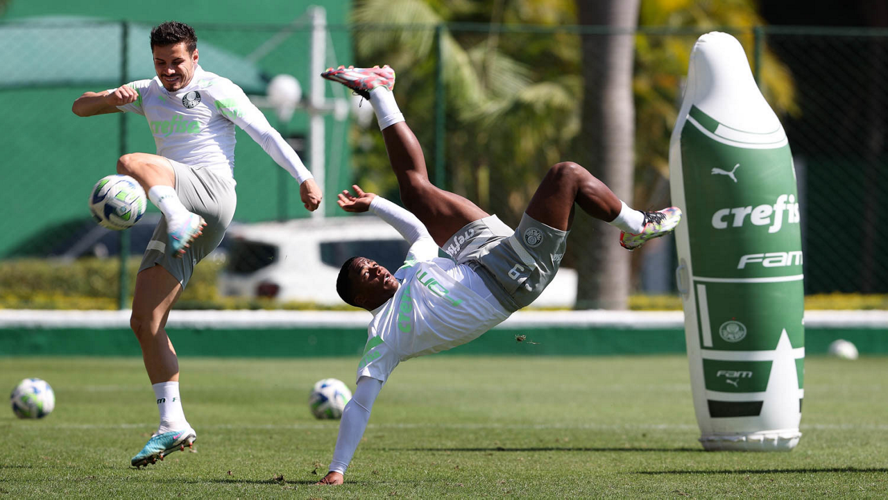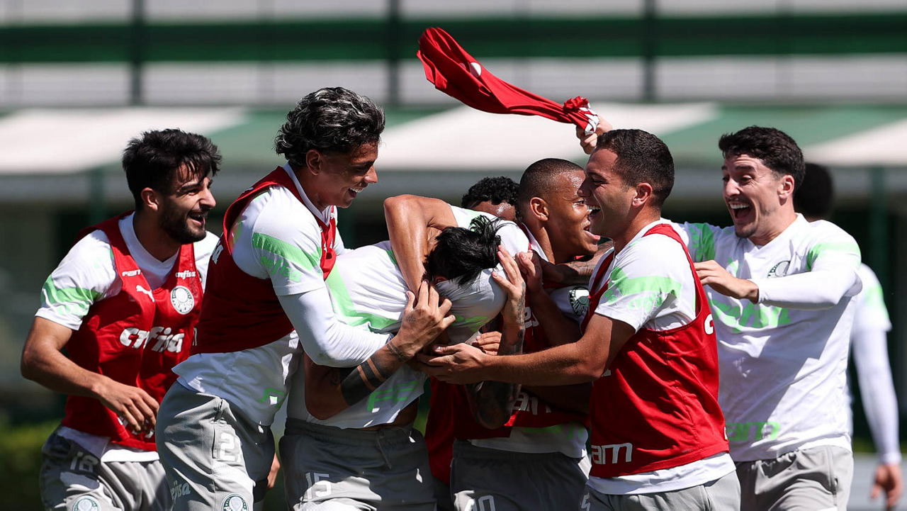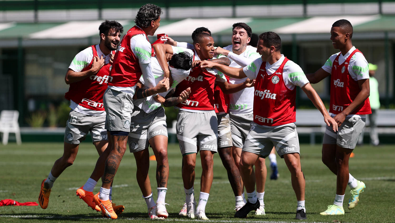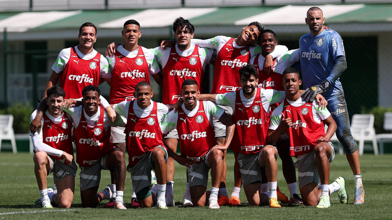 Os jogadores Fabinho, Naves, Gustavo Gómez, Richard Ríos, Endrick e o goleiro Weverton (E/D em pé) e Joaquín Piquerez, Kevin, Jhonatan, Garcia, Flaco López e Vanderlan (E/D agachados), da SE Palmeiras, durante treinamento, na Academia de Futebol. (Foto: Cesar Greco/Palmeiras/by Canon)