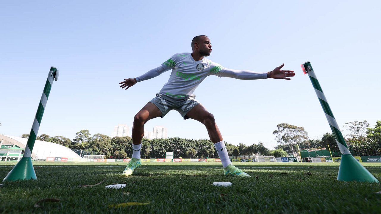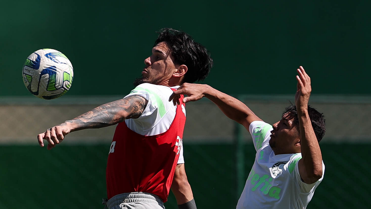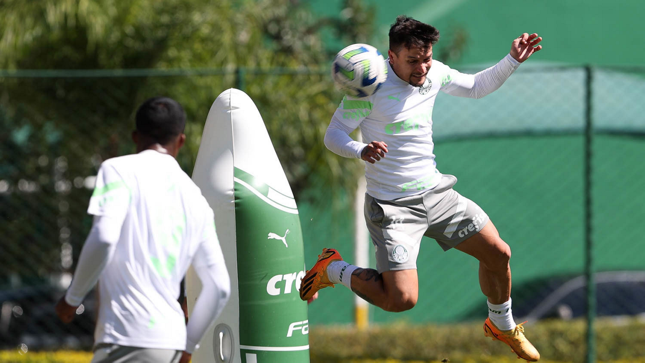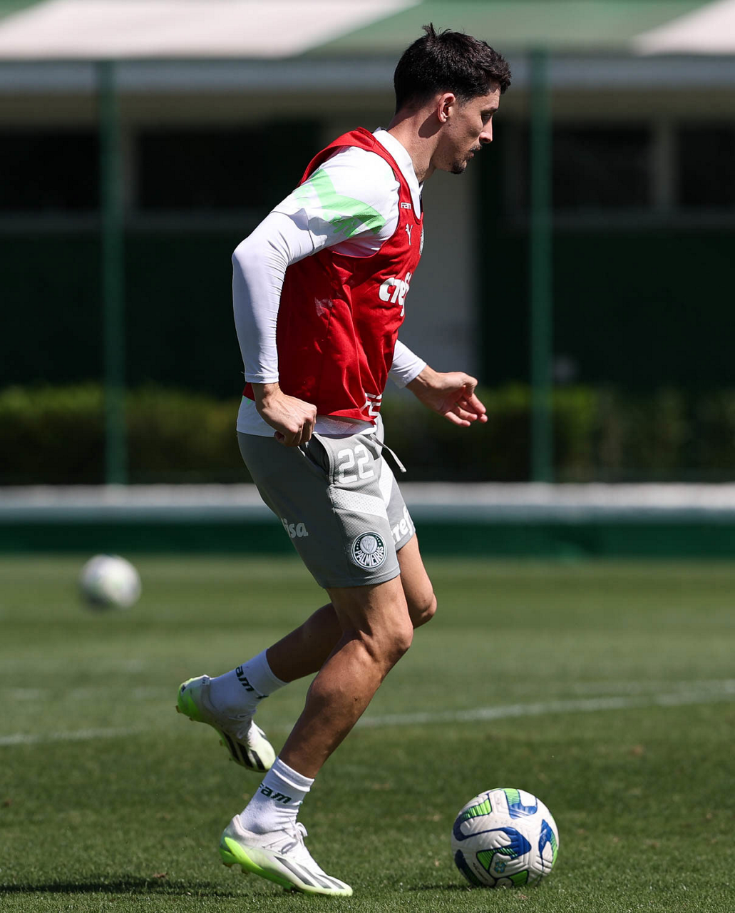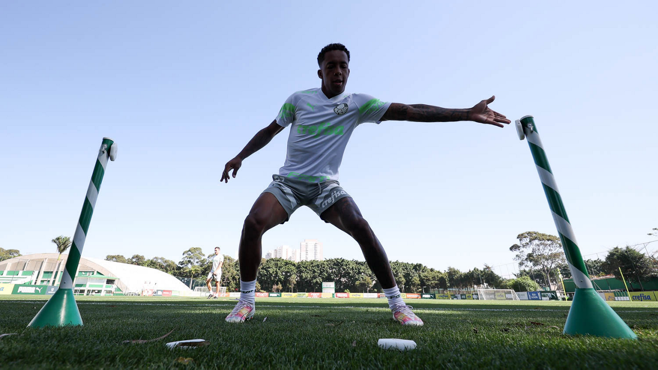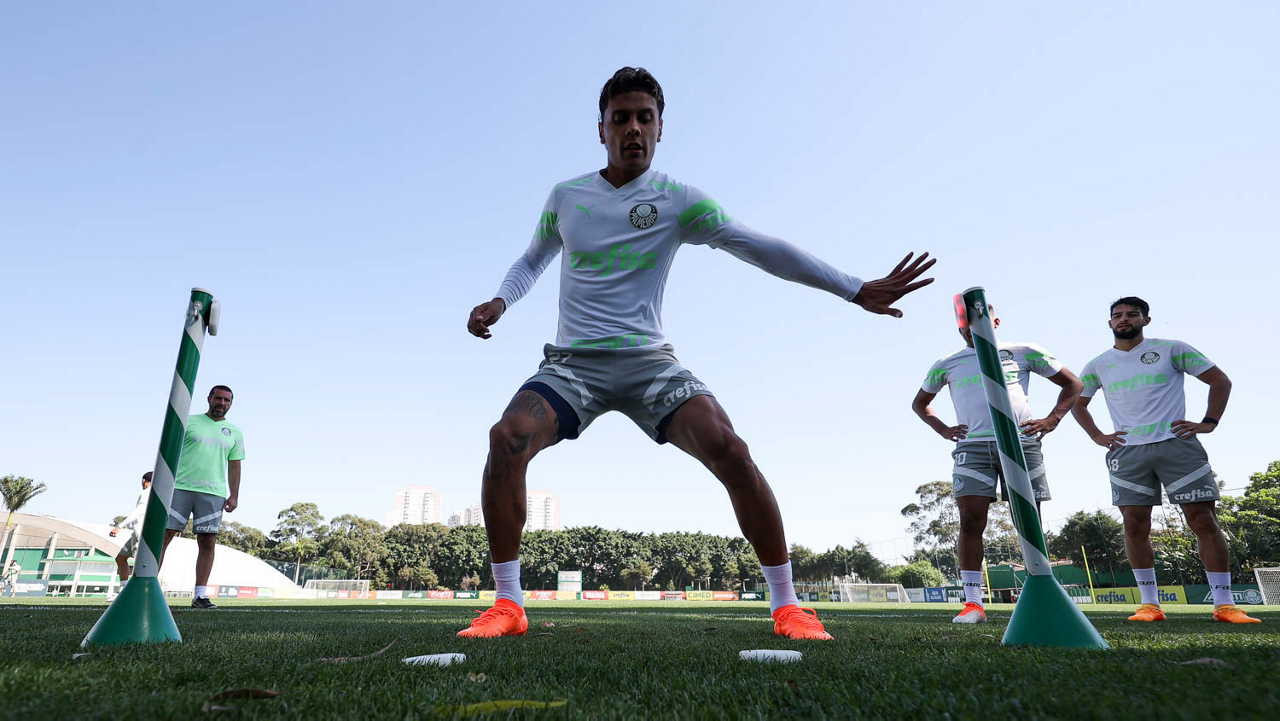Os jogadores Fabinho, Naves, Gustavo Gómez, Richard Ríos, Endrick e o goleiro Weverton (E/D em pé) e Joaquín Piquerez, Kevin, Jhonatan, Garcia, Flaco López e Vanderlan (E/D agachados), da SE Palmeiras, durante treinamento, na Academia de Futebol. (Foto: Cesar Greco/Palmeiras/by Canon)