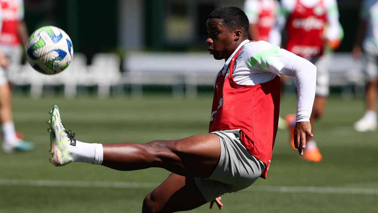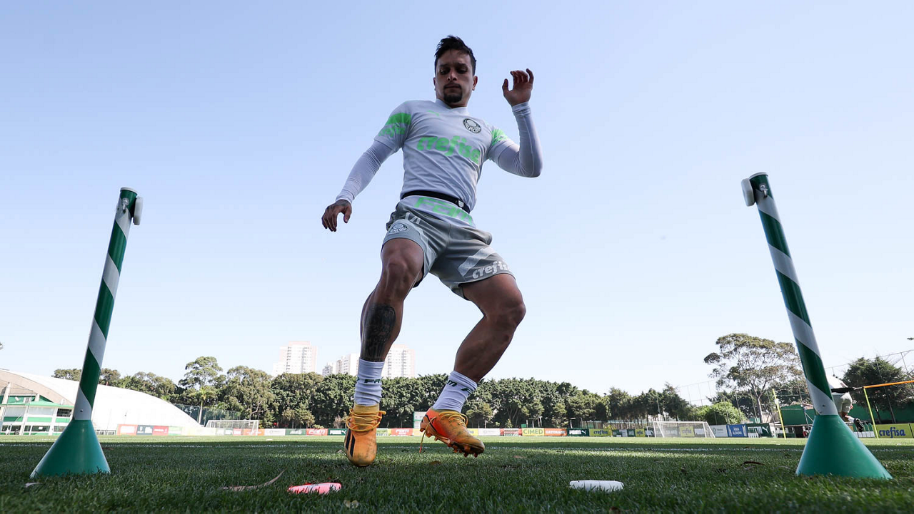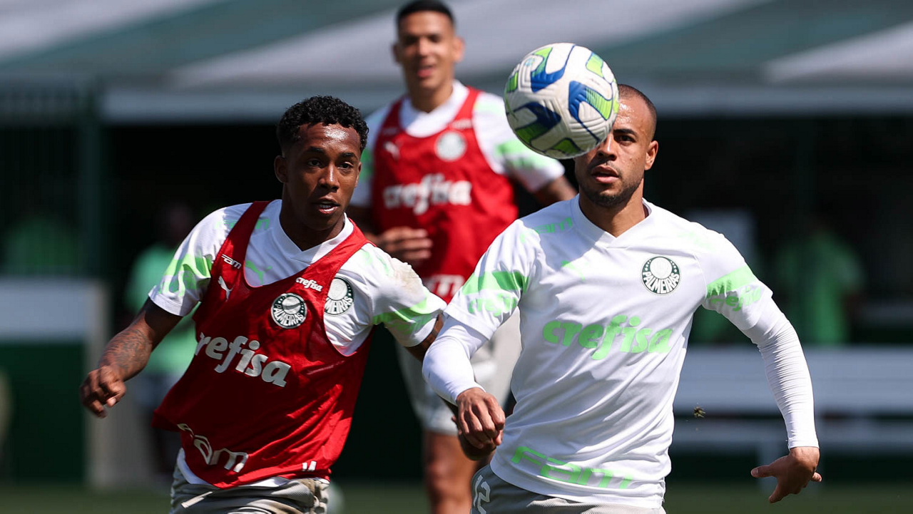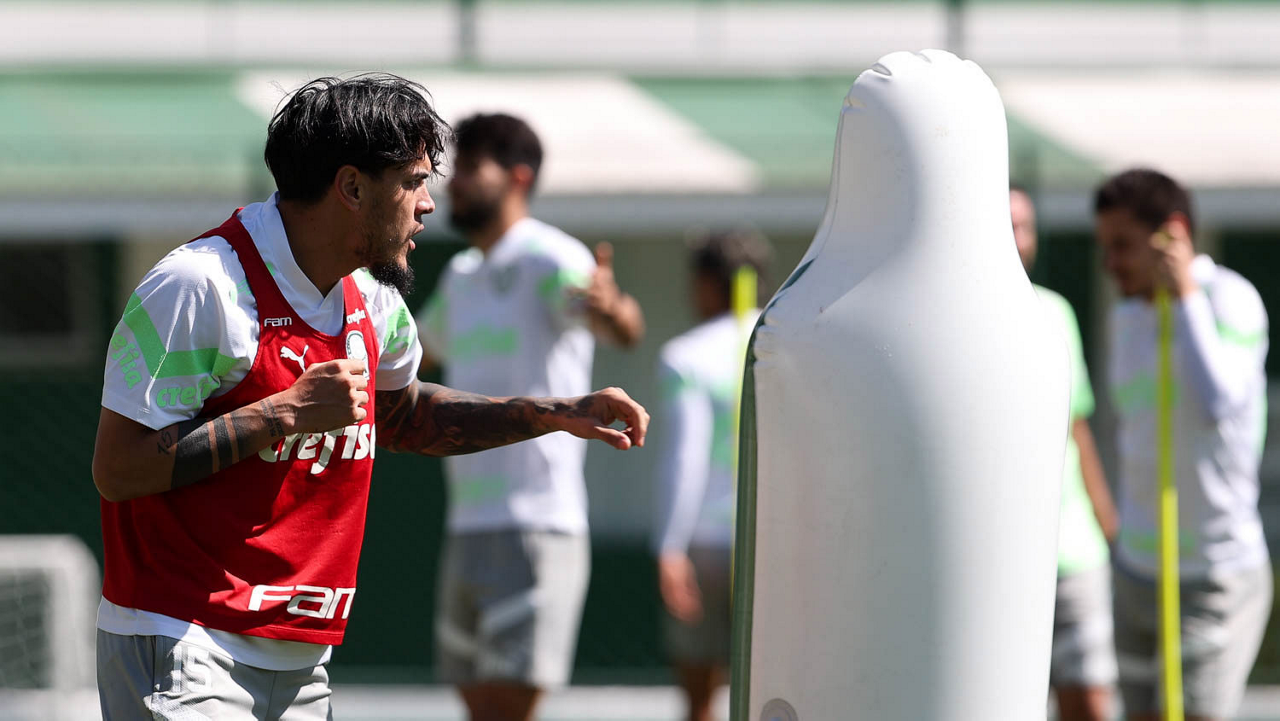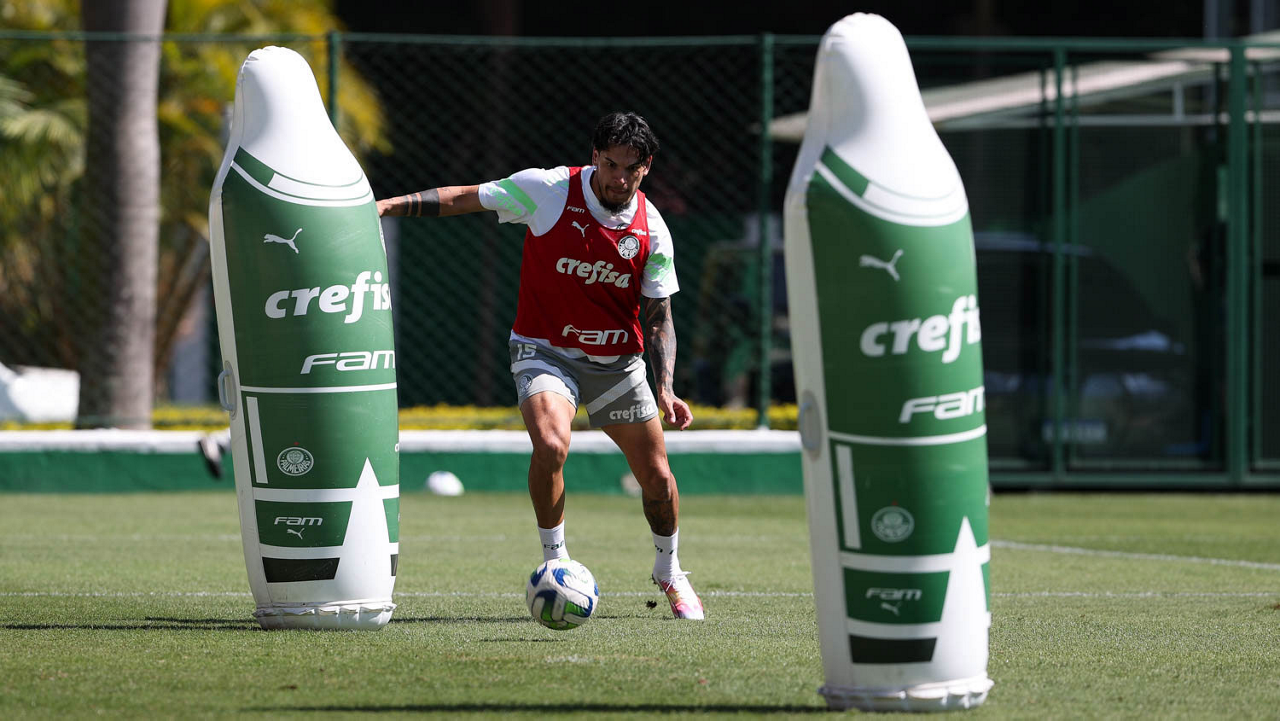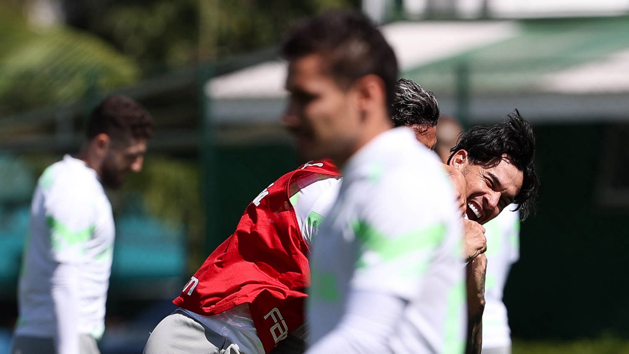 Os jogadores Fabinho, Naves, Gustavo Gómez, Richard Ríos, Endrick e o goleiro Weverton (E/D em pé) e Joaquín Piquerez, Kevin, Jhonatan, Garcia, Flaco López e Vanderlan (E/D agachados), da SE Palmeiras, durante treinamento, na Academia de Futebol. (Foto: Cesar Greco/Palmeiras/by Canon)