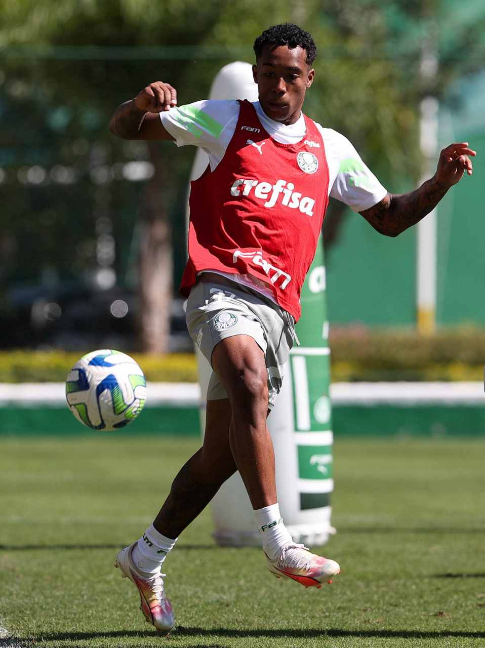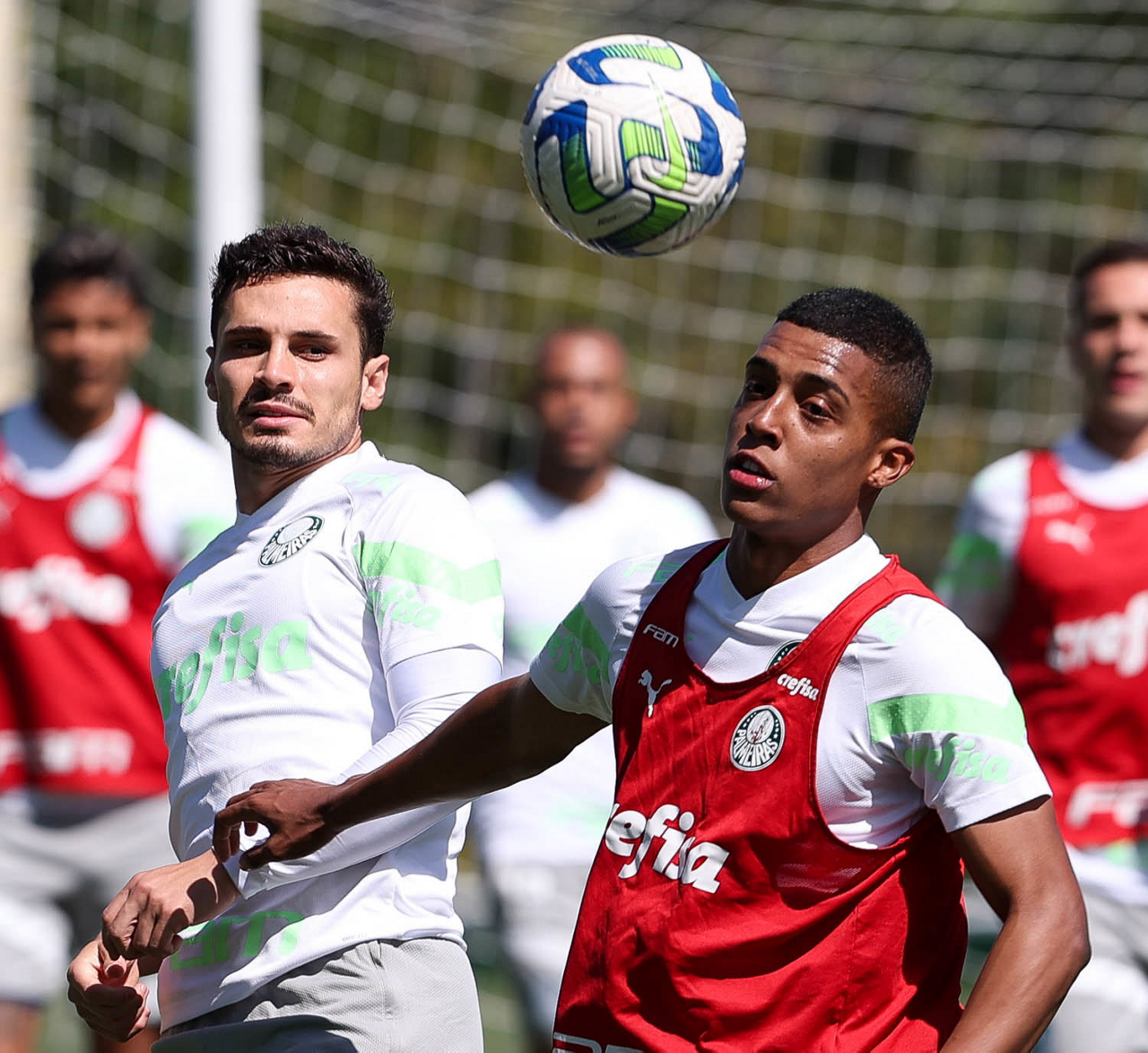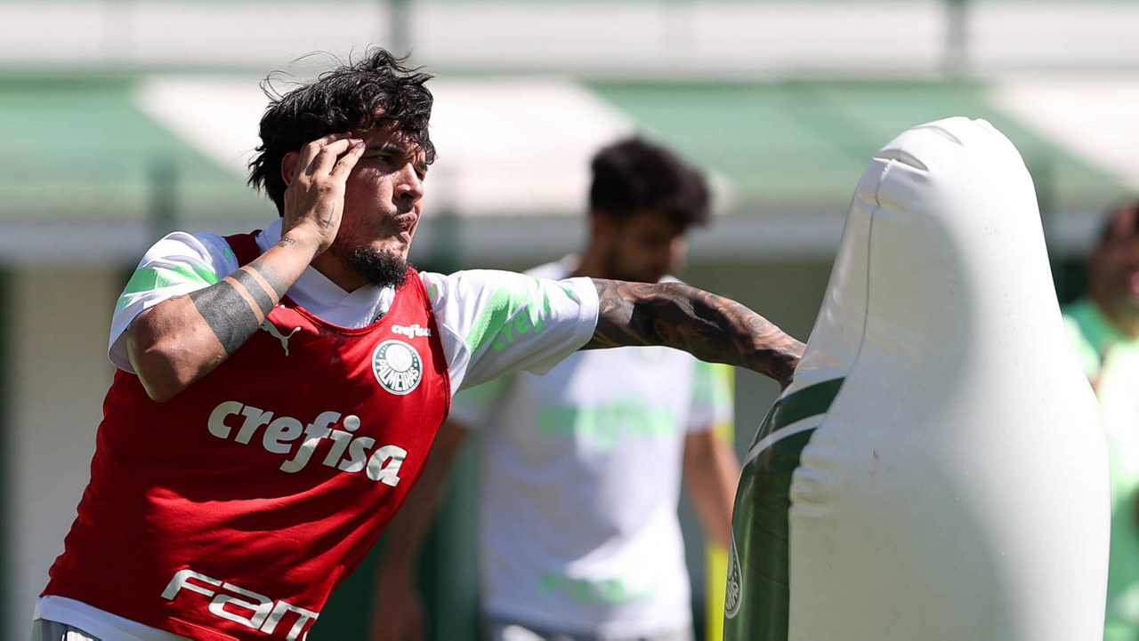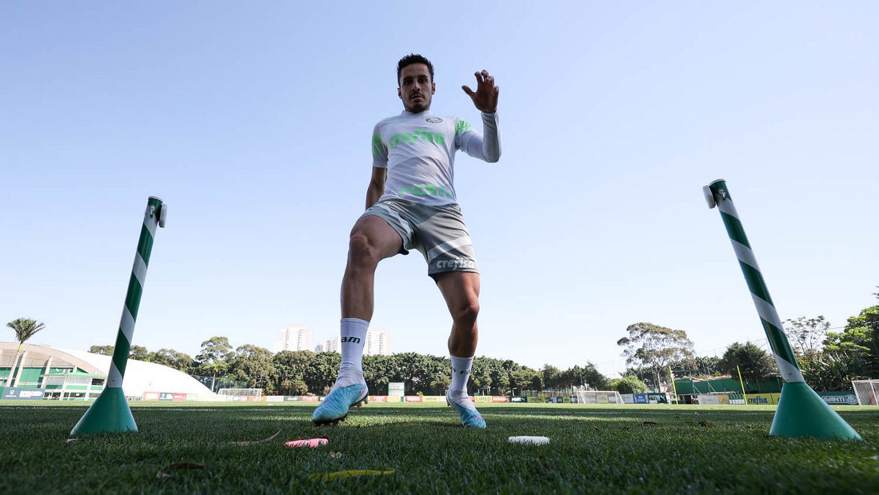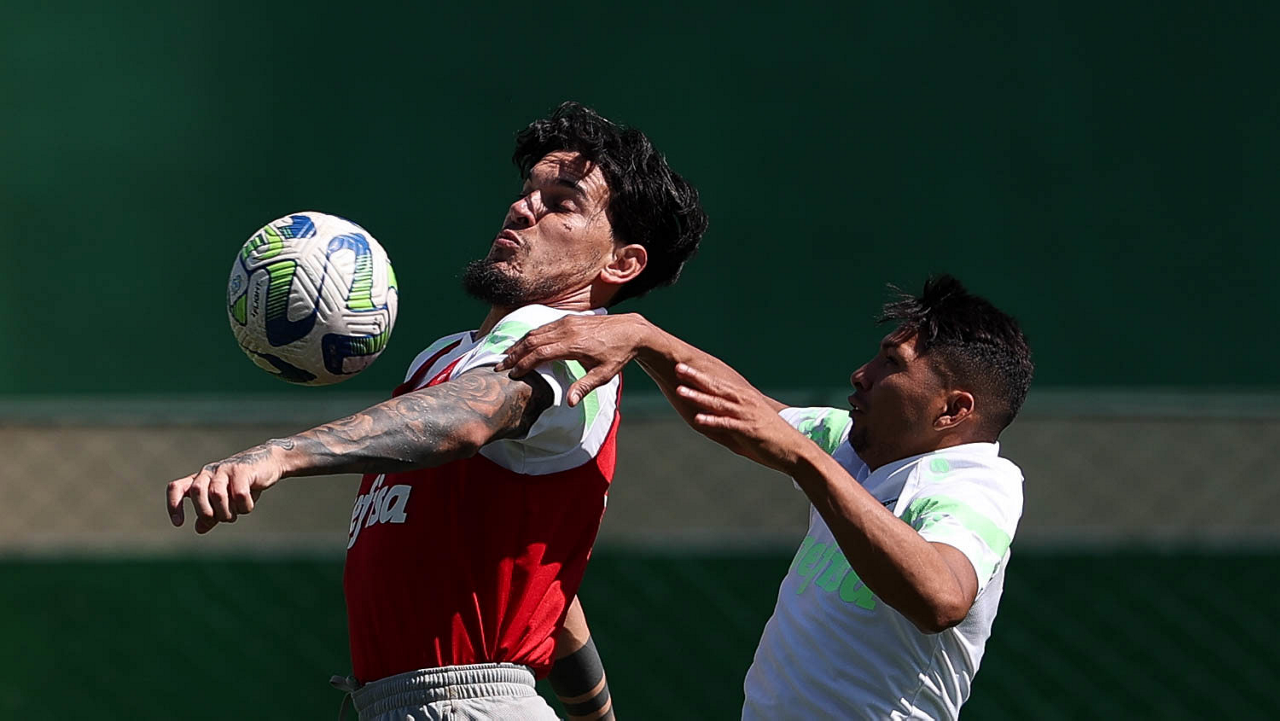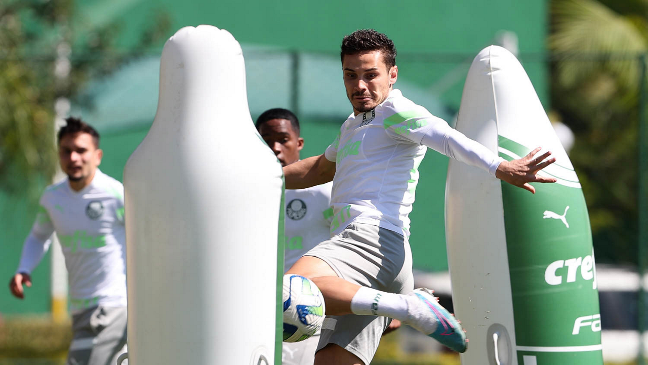 Os jogadores Fabinho, Naves, Gustavo Gómez, Richard Ríos, Endrick e o goleiro Weverton (E/D em pé) e Joaquín Piquerez, Kevin, Jhonatan, Garcia, Flaco López e Vanderlan (E/D agachados), da SE Palmeiras, durante treinamento, na Academia de Futebol. (Foto: Cesar Greco/Palmeiras/by Canon)