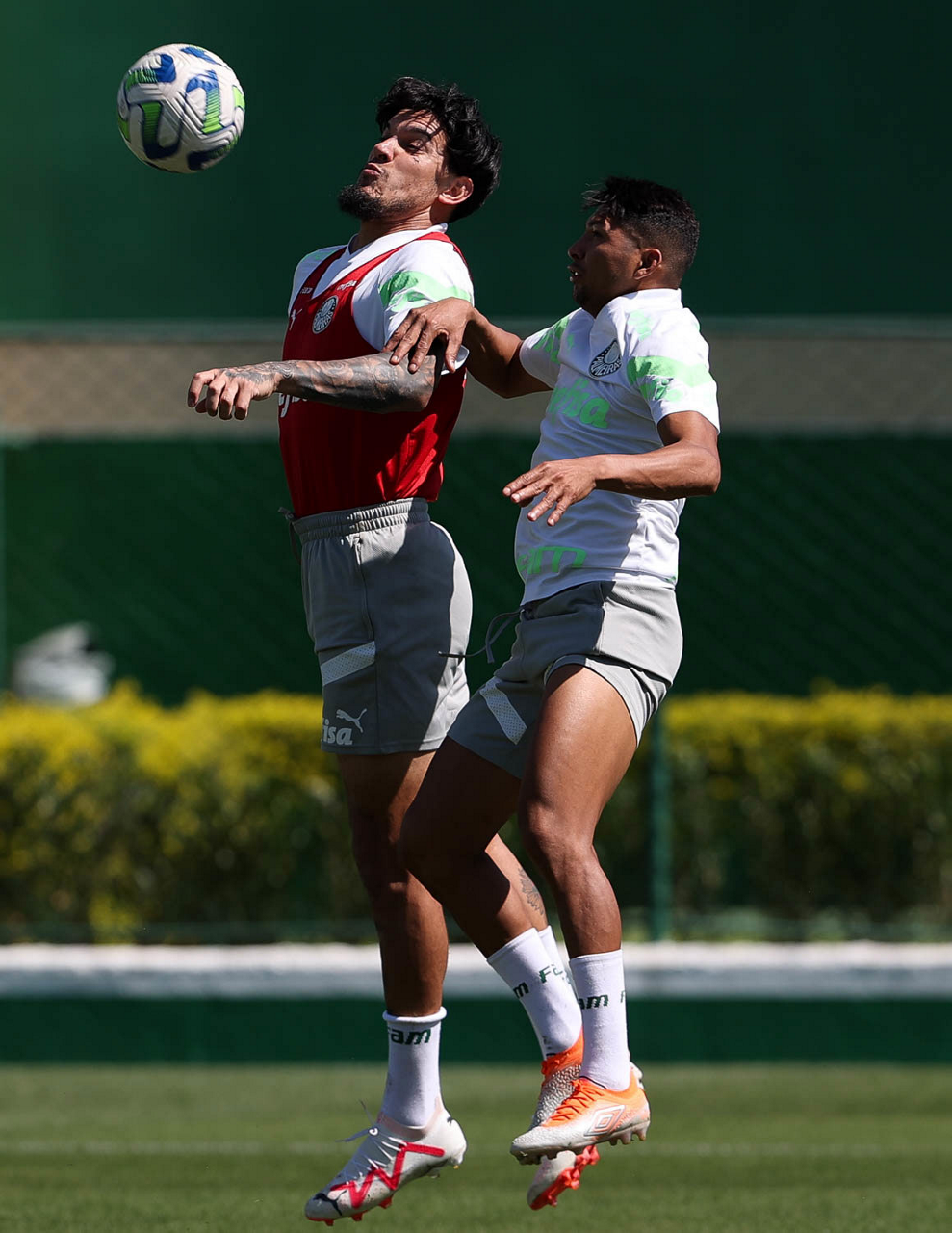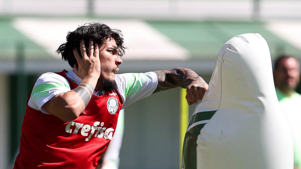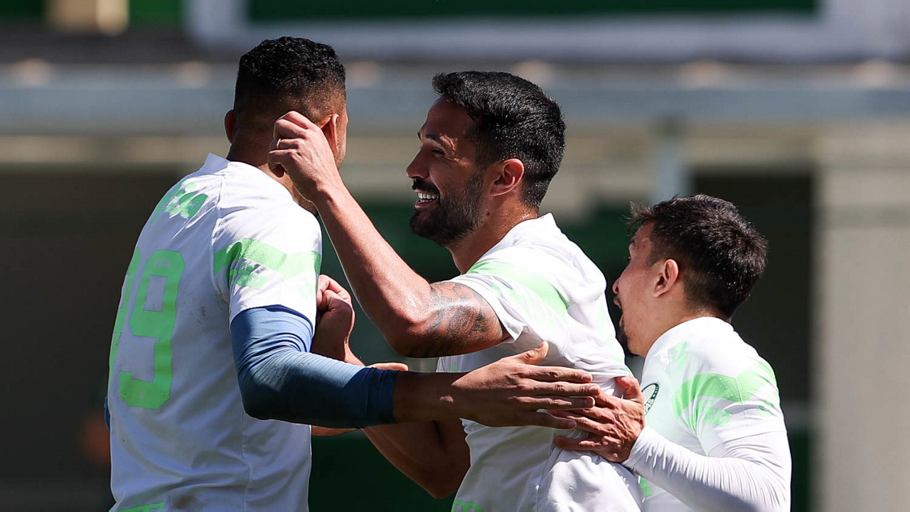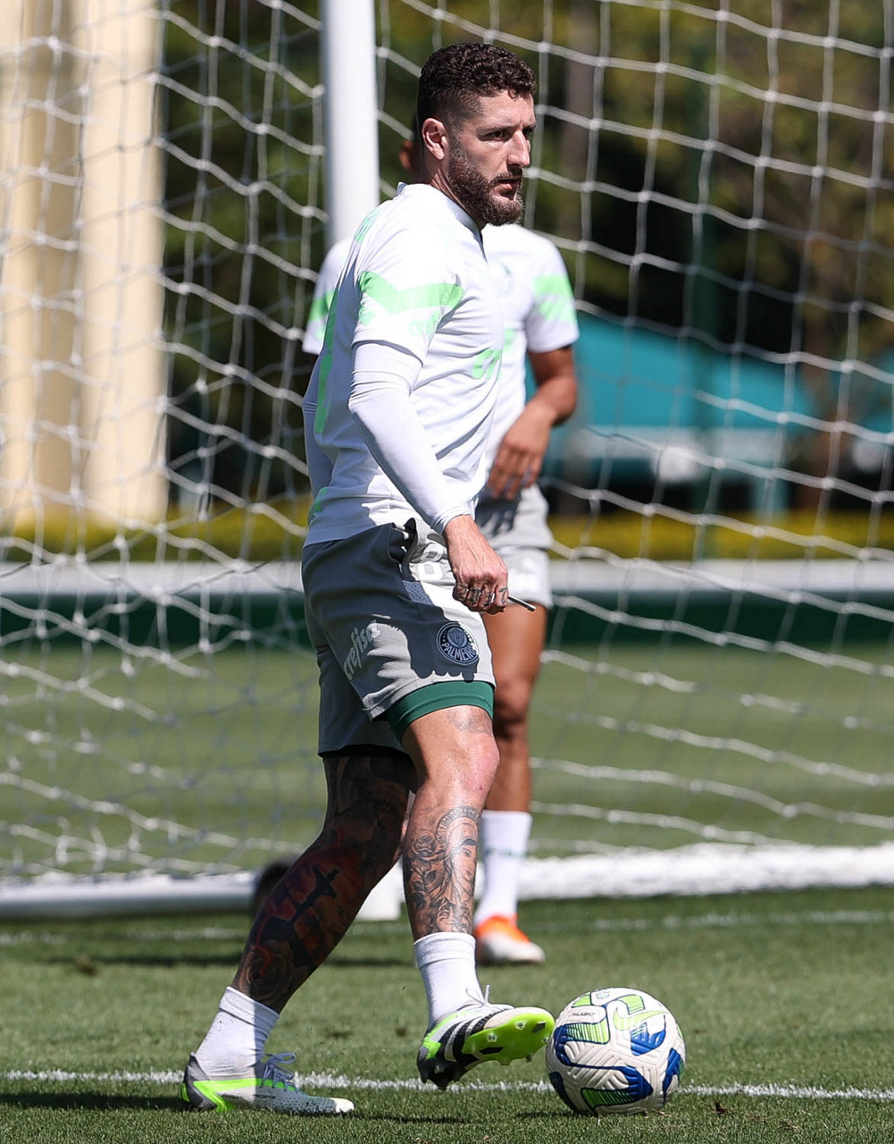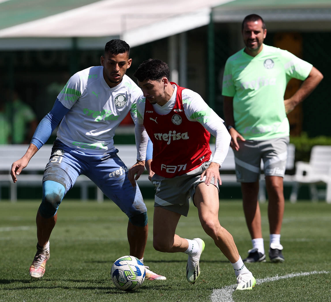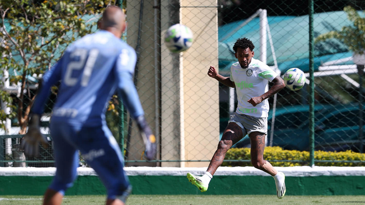 Os jogadores Fabinho, Naves, Gustavo Gómez, Richard Ríos, Endrick e o goleiro Weverton (E/D em pé) e Joaquín Piquerez, Kevin, Jhonatan, Garcia, Flaco López e Vanderlan (E/D agachados), da SE Palmeiras, durante treinamento, na Academia de Futebol. (Foto: Cesar Greco/Palmeiras/by Canon)