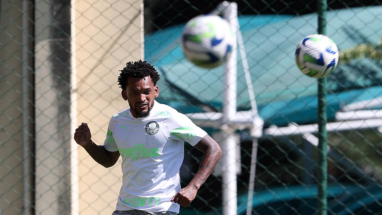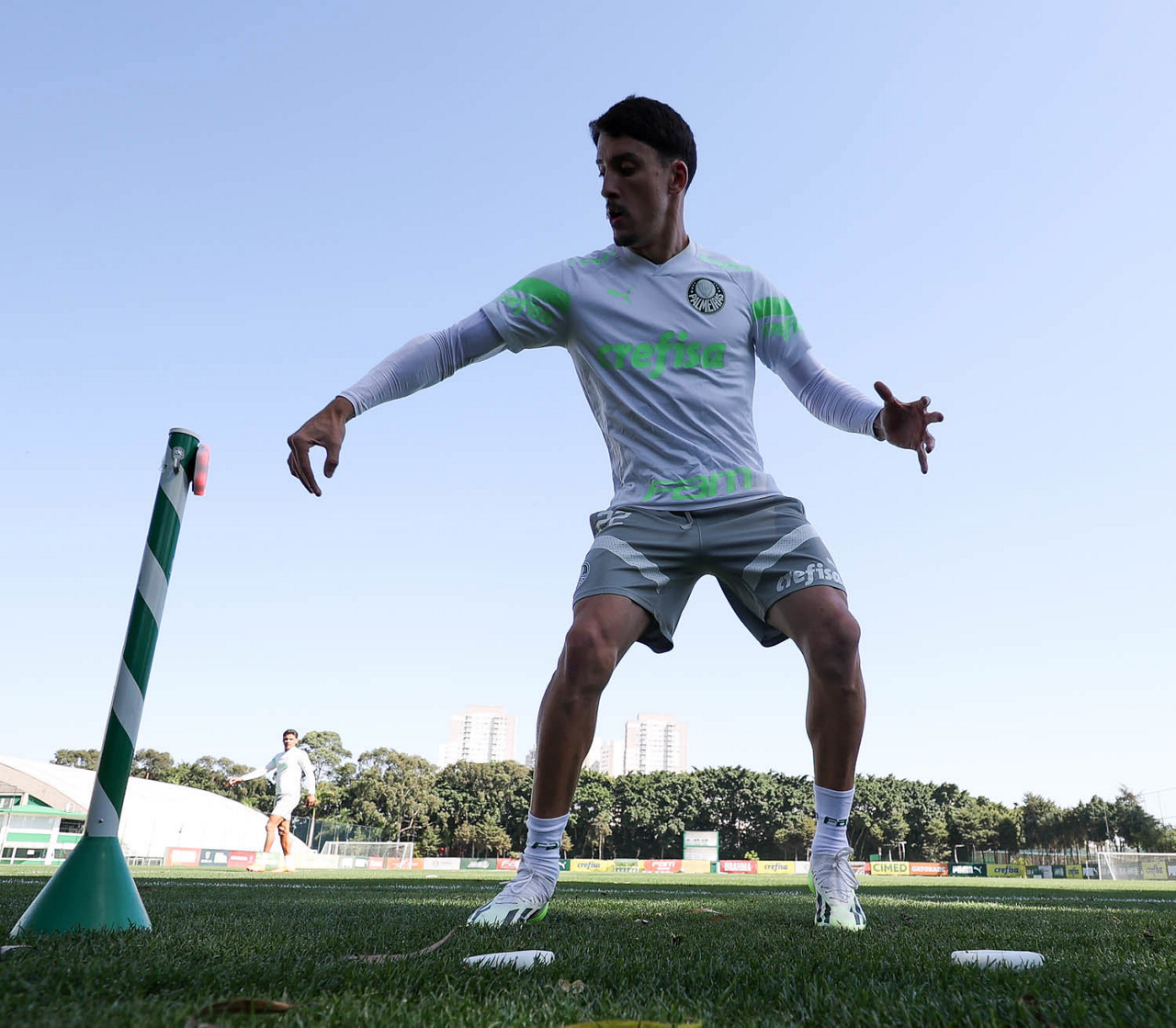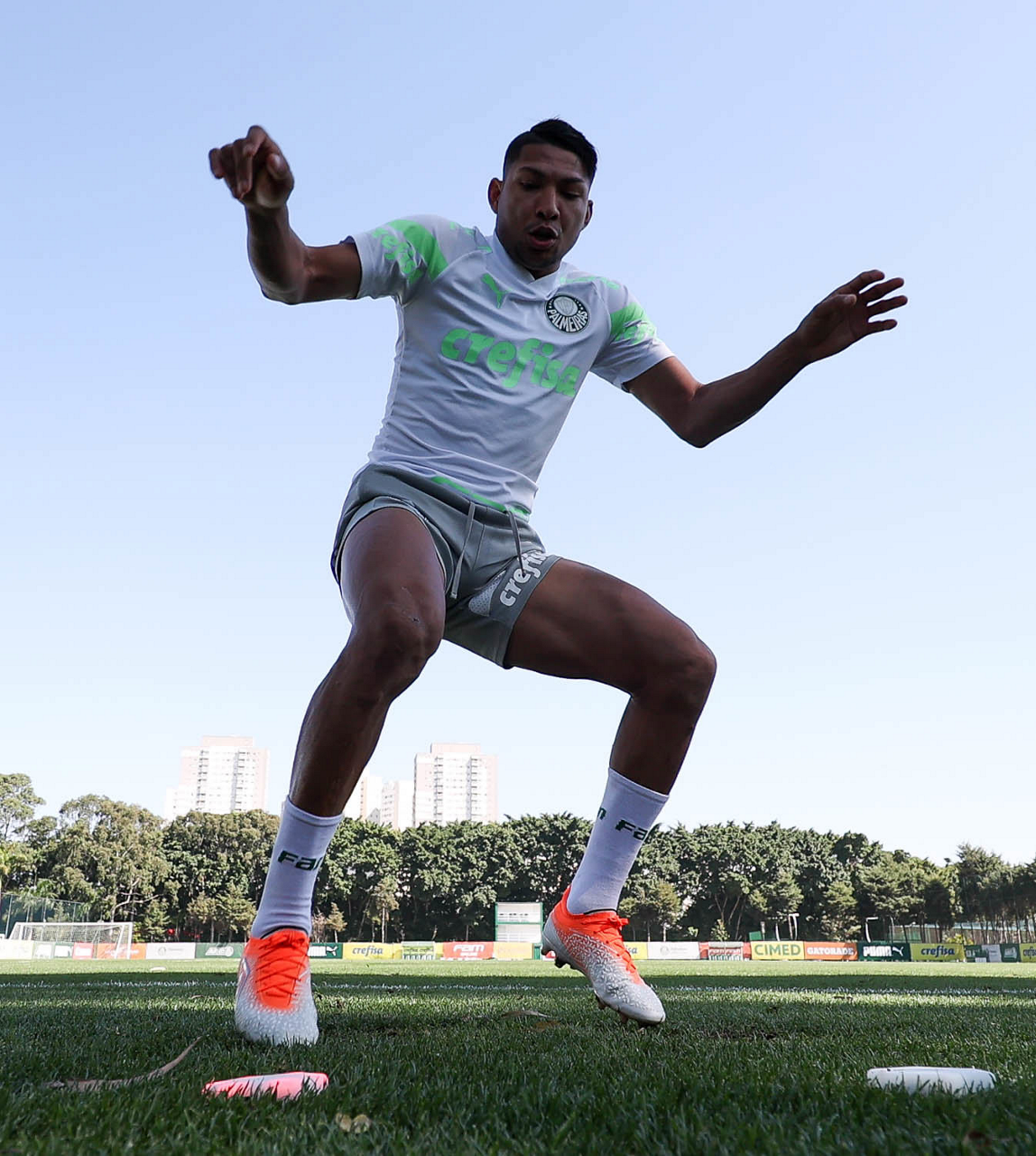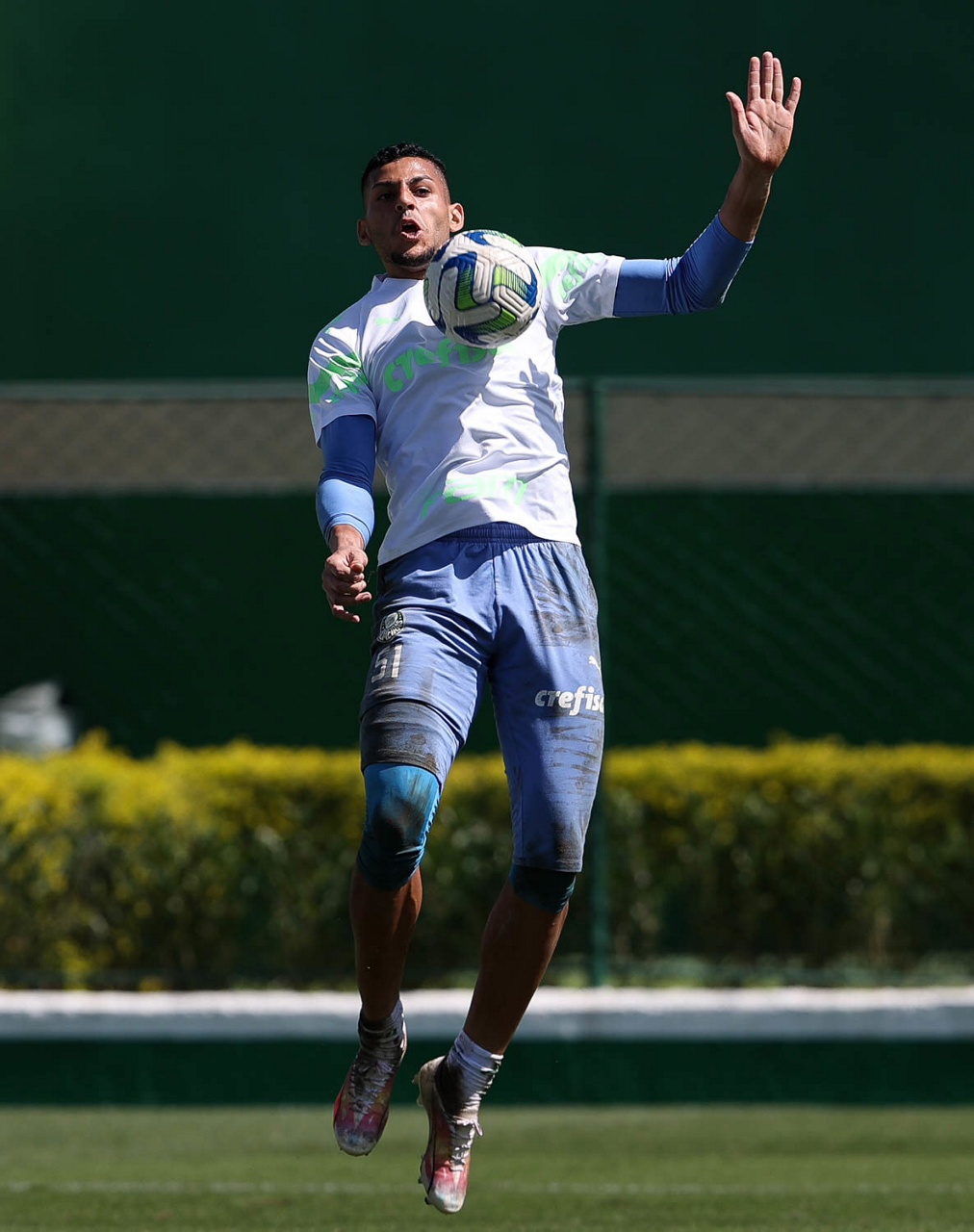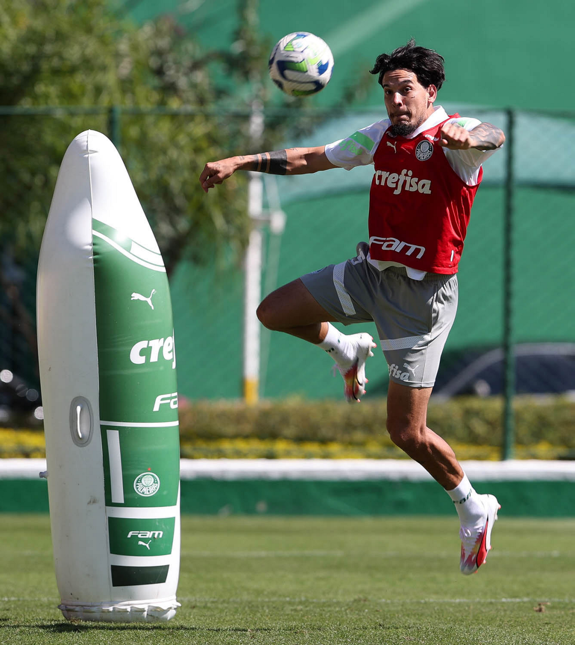 Os jogadores Fabinho, Naves, Gustavo Gómez, Richard Ríos, Endrick e o goleiro Weverton (E/D em pé) e Joaquín Piquerez, Kevin, Jhonatan, Garcia, Flaco López e Vanderlan (E/D agachados), da SE Palmeiras, durante treinamento, na Academia de Futebol. (Foto: Cesar Greco/Palmeiras/by Canon)