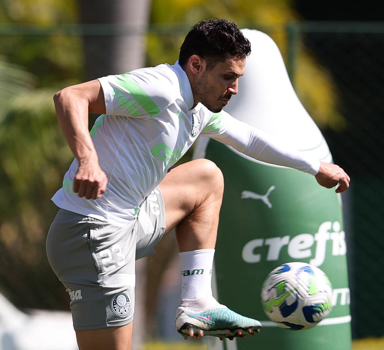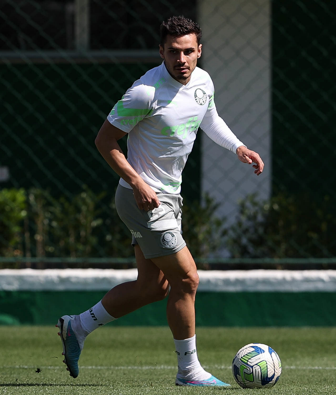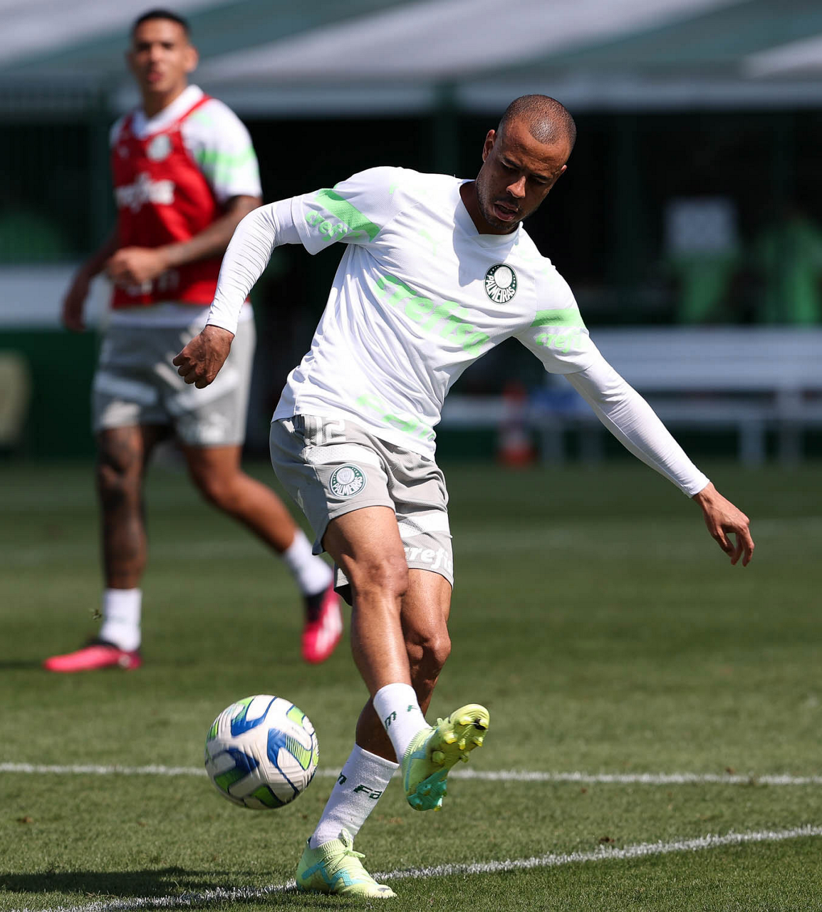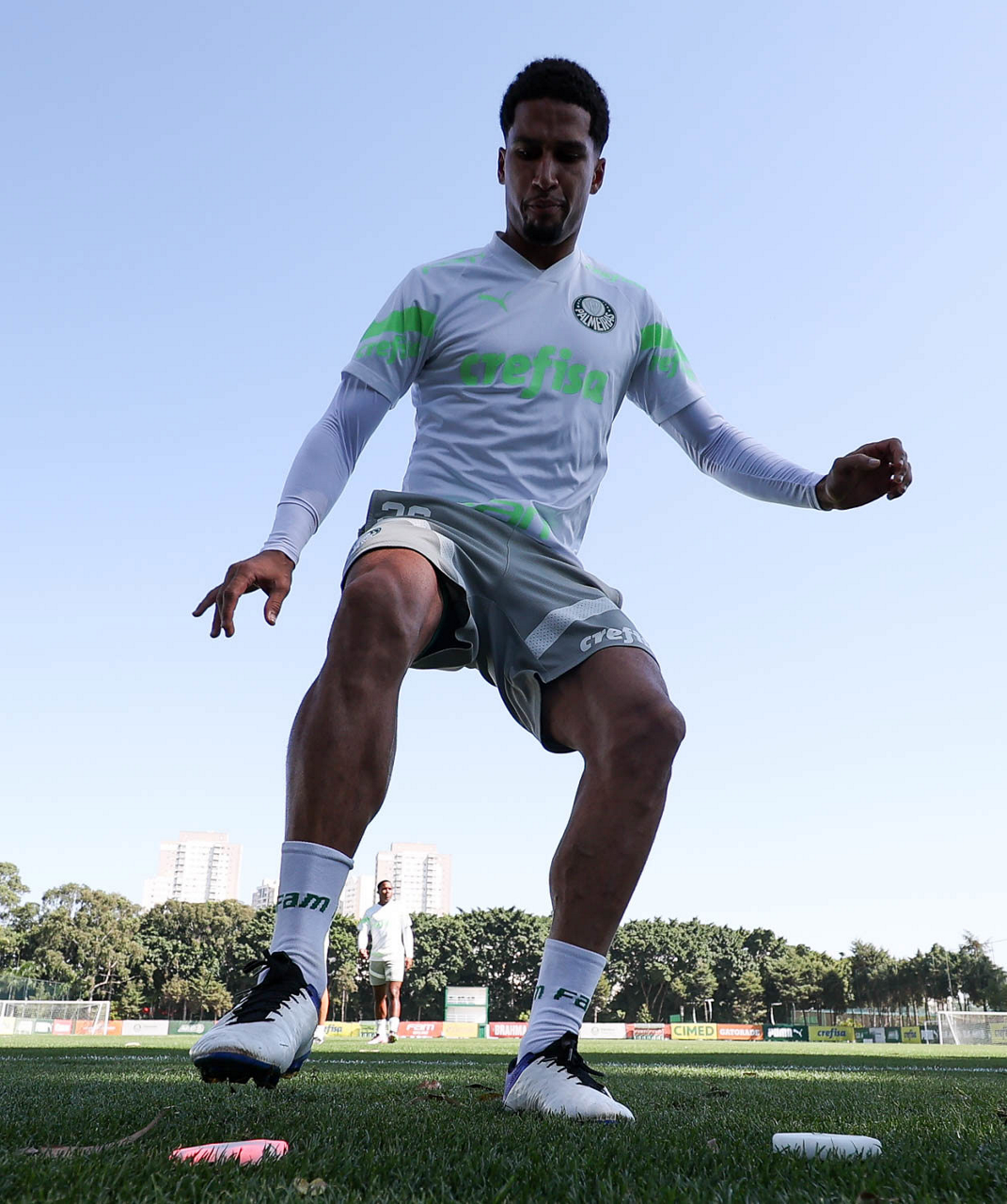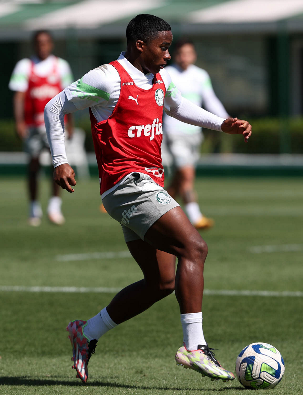 Os jogadores Fabinho, Naves, Gustavo Gómez, Richard Ríos, Endrick e o goleiro Weverton (E/D em pé) e Joaquín Piquerez, Kevin, Jhonatan, Garcia, Flaco López e Vanderlan (E/D agachados), da SE Palmeiras, durante treinamento, na Academia de Futebol. (Foto: Cesar Greco/Palmeiras/by Canon)