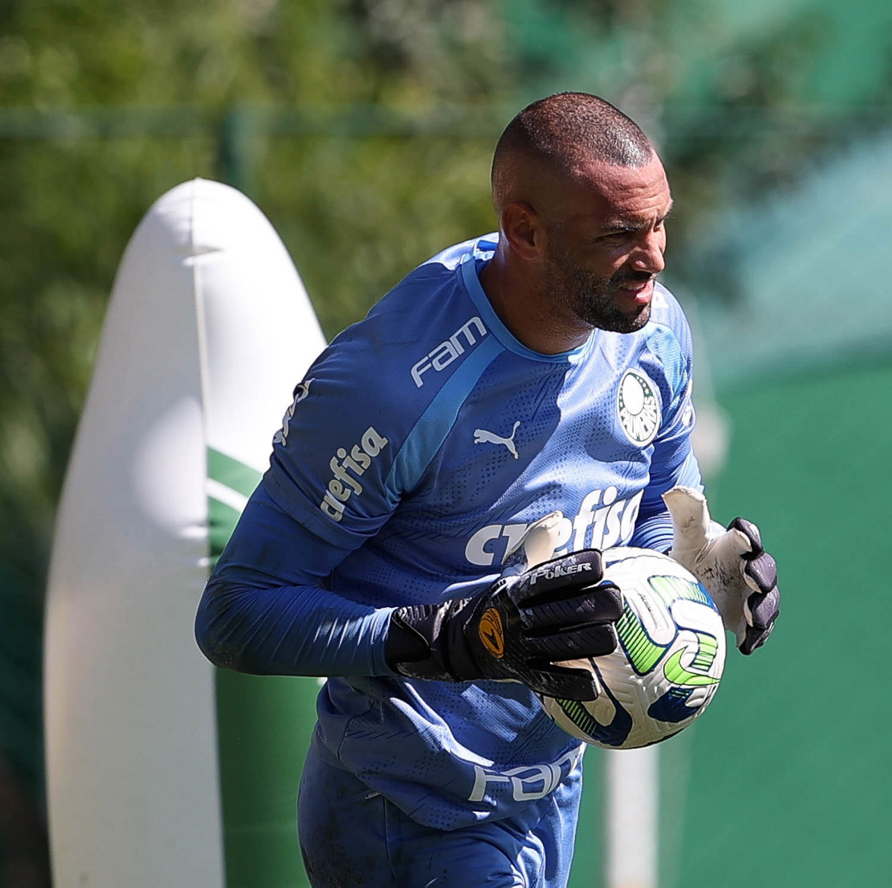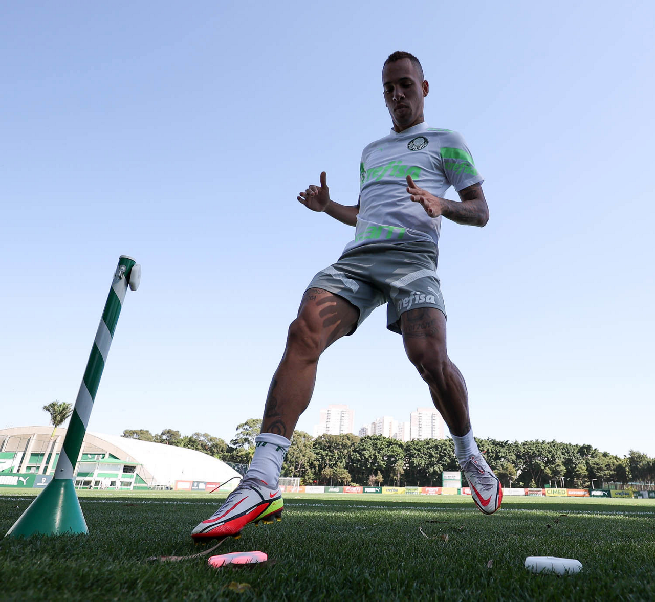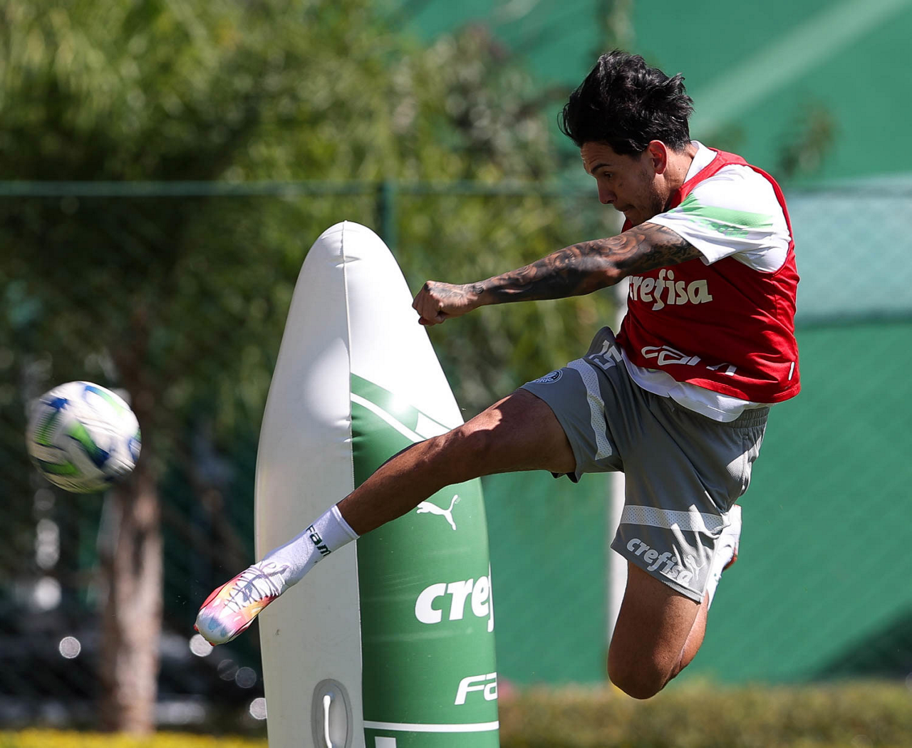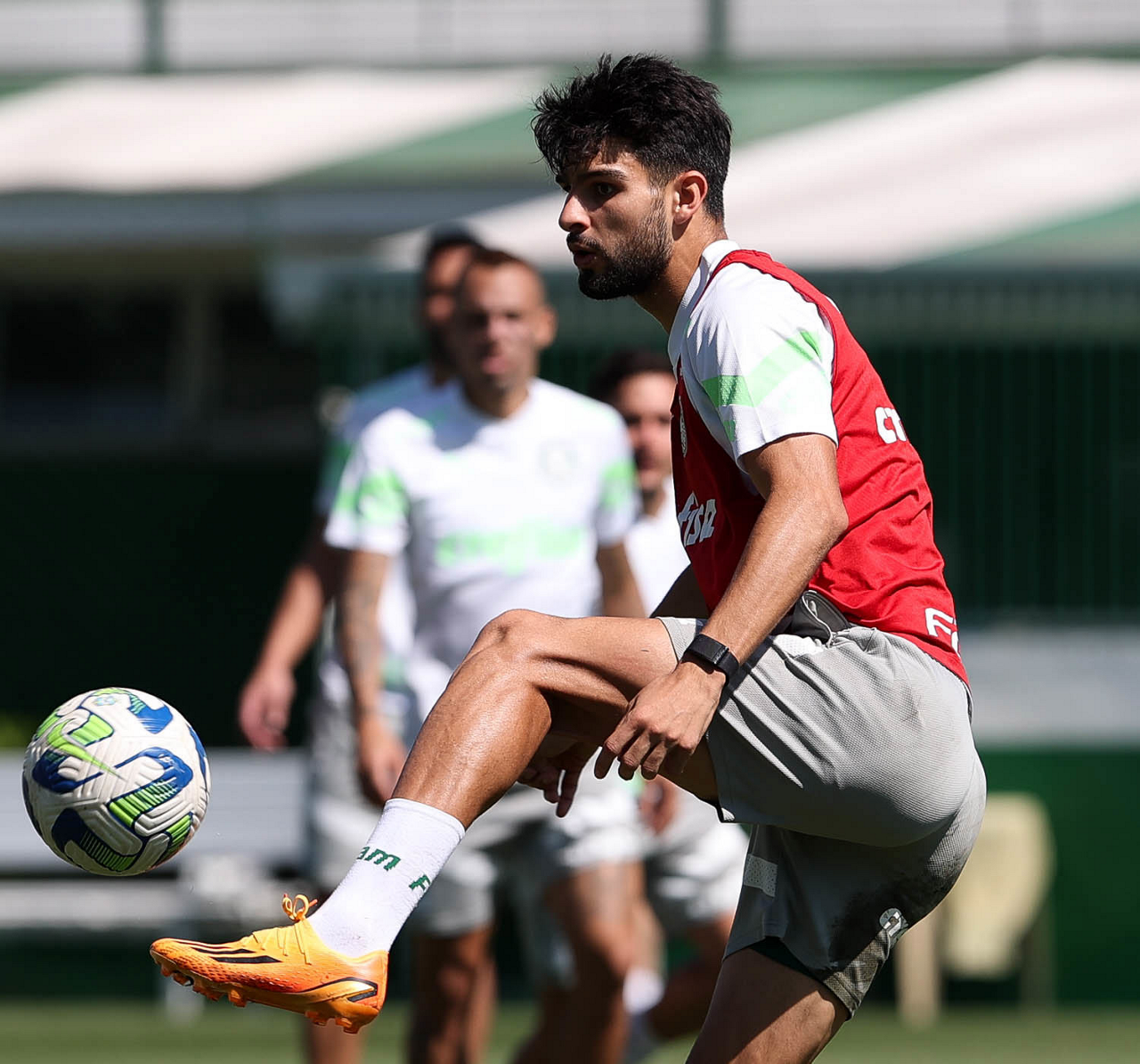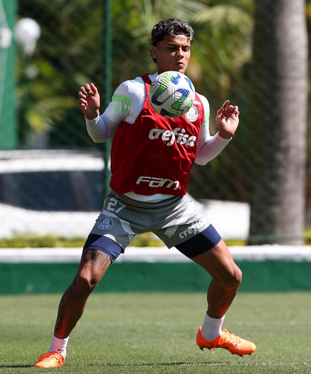 Os jogadores Fabinho, Naves, Gustavo Gómez, Richard Ríos, Endrick e o goleiro Weverton (E/D em pé) e Joaquín Piquerez, Kevin, Jhonatan, Garcia, Flaco López e Vanderlan (E/D agachados), da SE Palmeiras, durante treinamento, na Academia de Futebol. (Foto: Cesar Greco/Palmeiras/by Canon)