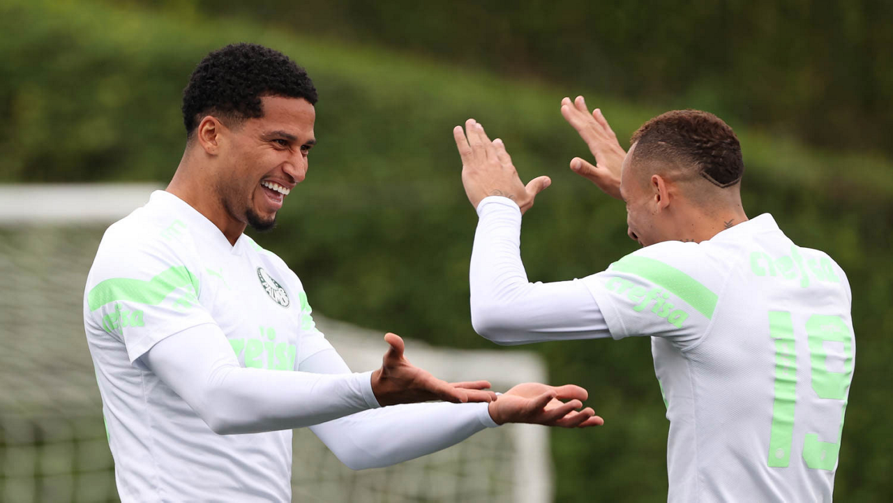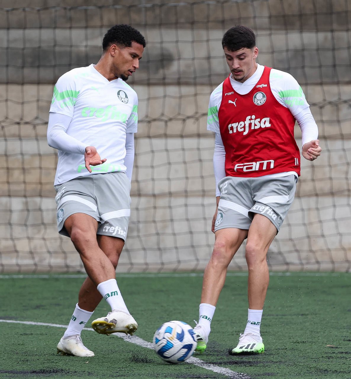 Os jogadores Murilo e Joaquín Piquerez (D), da SE Palmeiras, durante treinamento, na CT do Sócrates Valência. (Foto: Cesar Greco/Palmeiras/by Canon)